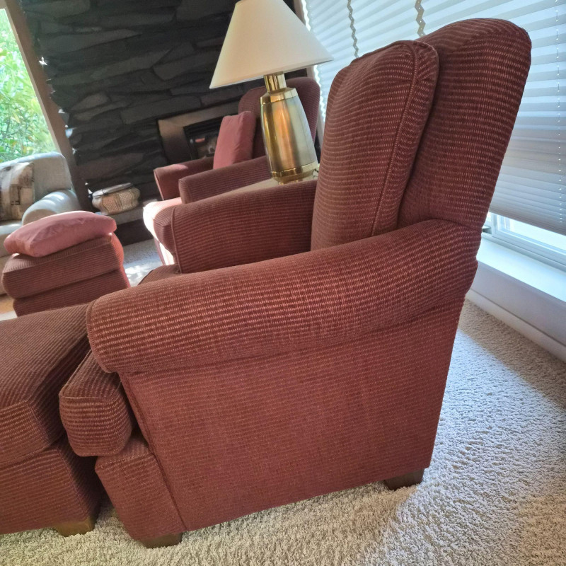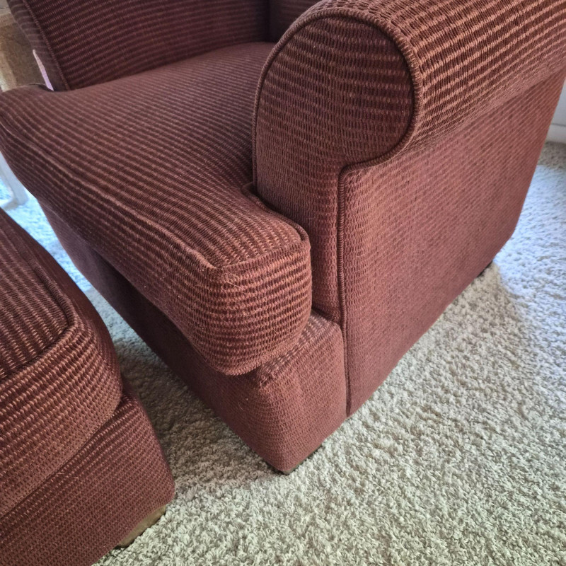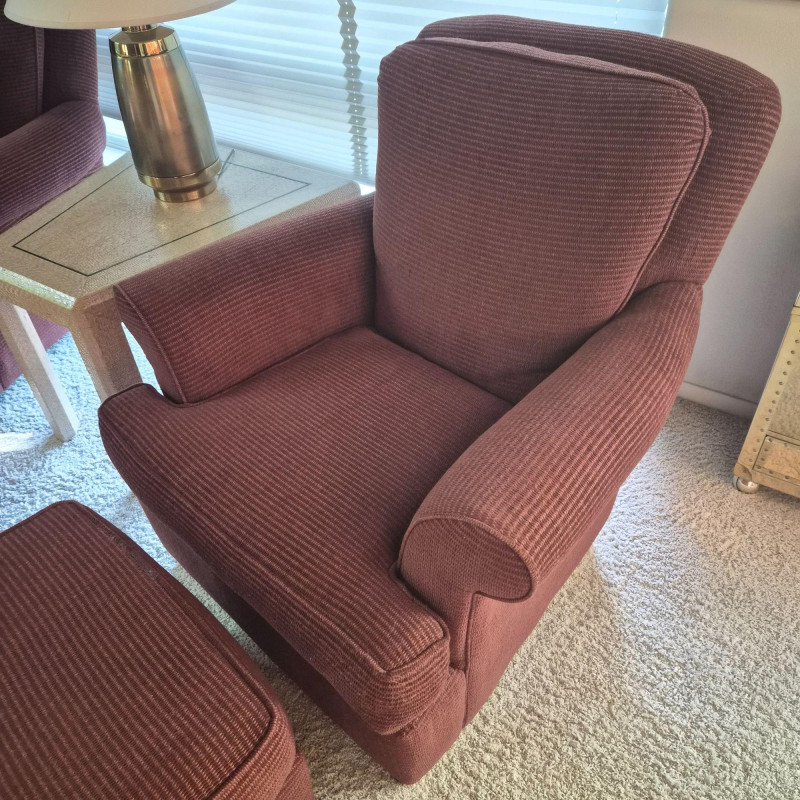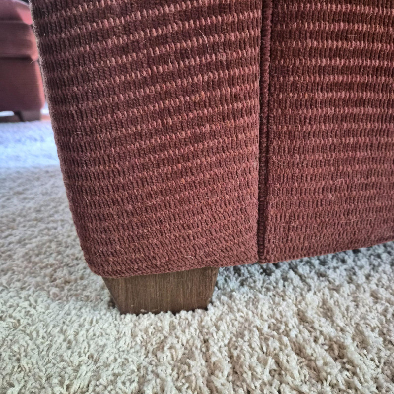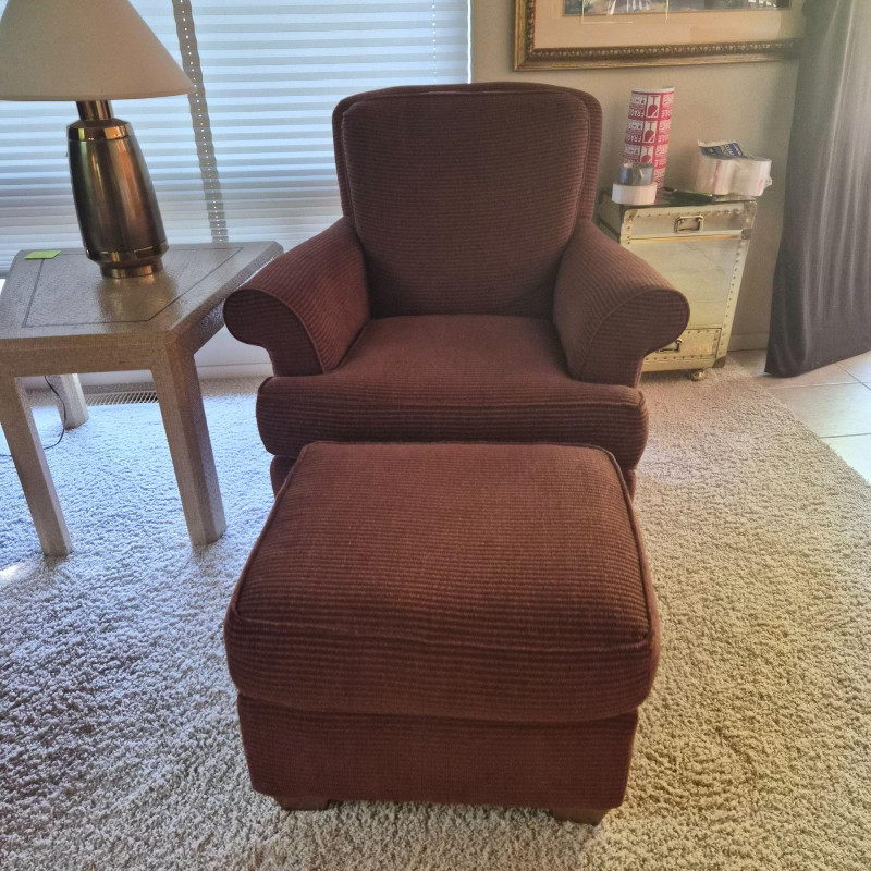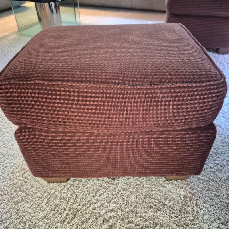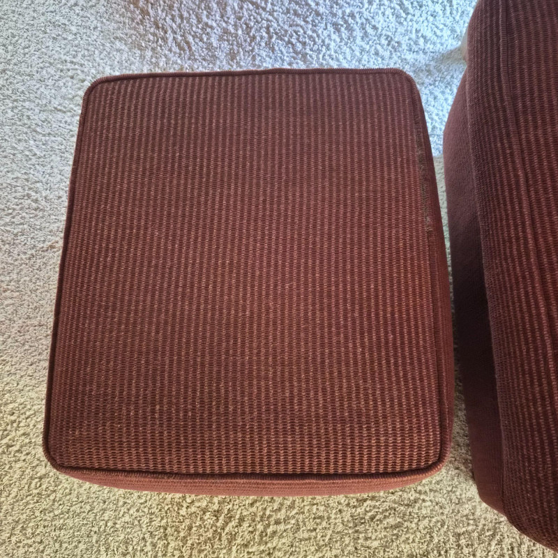 A stylish Bauhaus USA chair upholstered in textured cranberry jute fabric, offering a bold yet refined accent for any room. The clean lines and modern silhouette reflect Bauhaus design principles—form meets function with a touch of flair. Included is a coordinating hassock or footrest measuring 34" x 21" x 17", perfect for added comfort or standalone use. Zippered upholstery for easy cleaning. Due to its size and weight, bidding on this lot confirms agreement to bring at least two or more able-bodied individuals, an appropriate sized moving vehicle (NOTE MEASUREMENTS) and appropriate equipment (e.g., dollie, hand truck) for safe removal. Failure to comply may result in forfeiture without refund. No staff on site to assist with moving this item.
