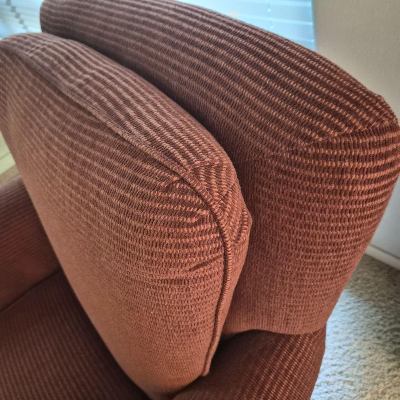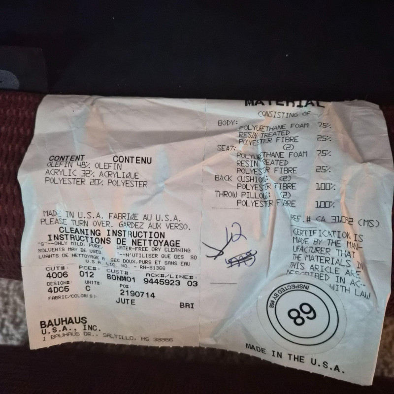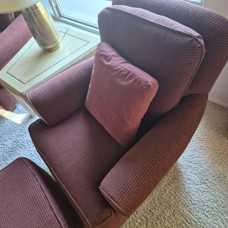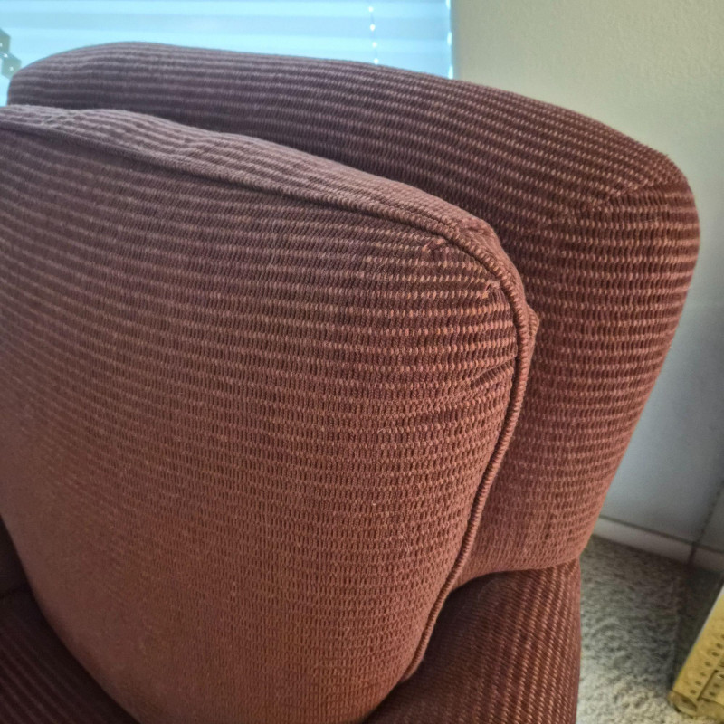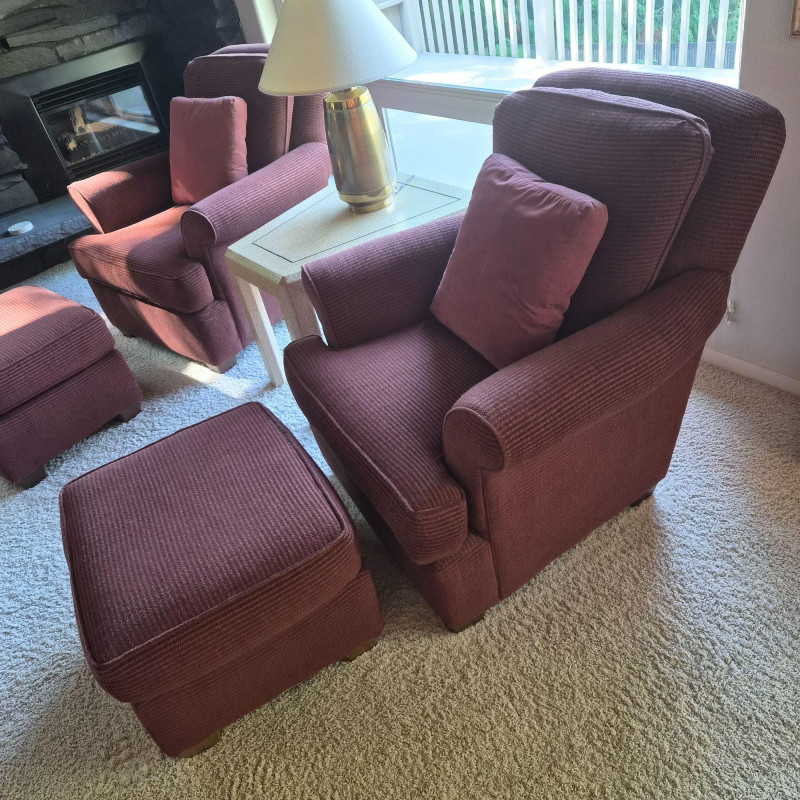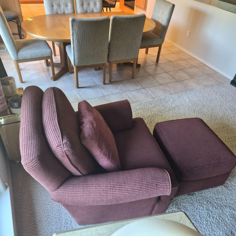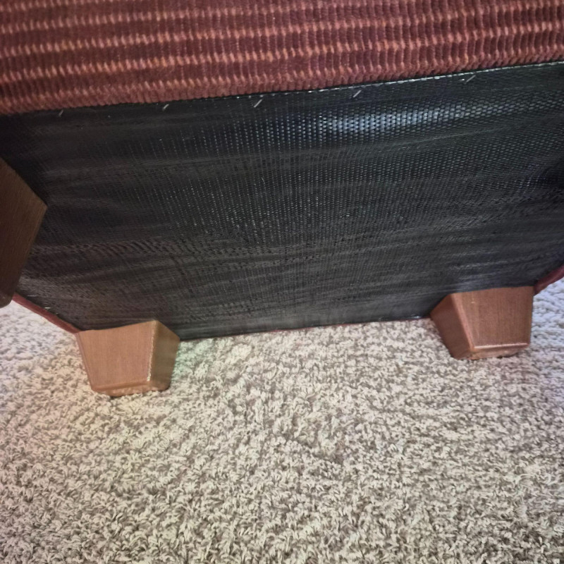 A stylish Bauhaus USA chair upholstered in textured cranberry jute fabric, offering a bold yet refined accent for any room. The clean lines and modern silhouette reflect Bauhaus design principles—form meets function with a touch of flair. Included is a coordinating hassock or footrest measuring 34" x 21" x 17", perfect for added comfort or standalone use. Zippered upholstery for easy cleaning. Due to its size and weight, bidding on this lot confirms agreement to bring at least two or more able-bodied individuals, an appropriate sized moving vehicle (NOTE MEASUREMENTS) and appropriate equipment (e.g., dollie, hand truck) for safe removal. Failure to comply may result in forfeiture without refund. No staff on site to assist with moving this item.
