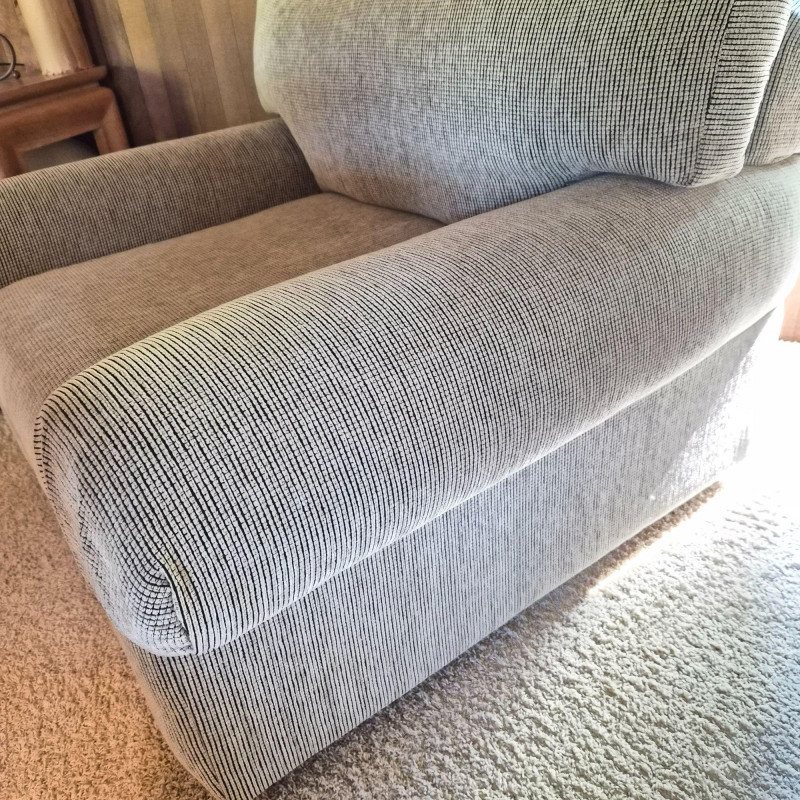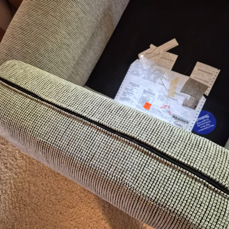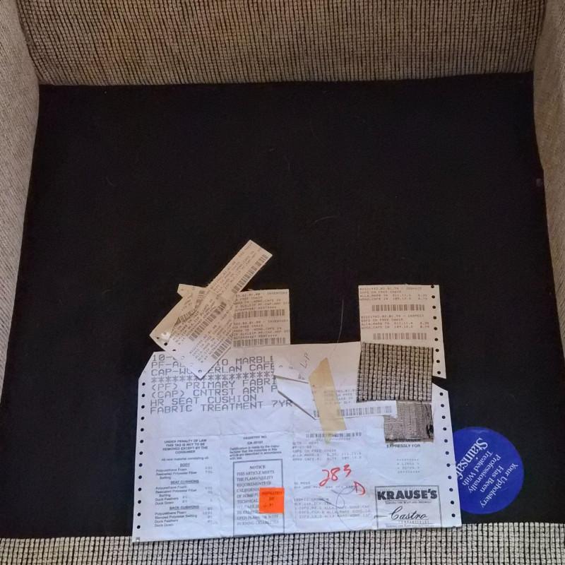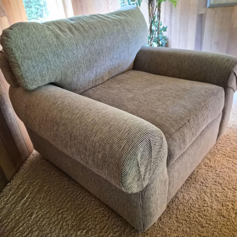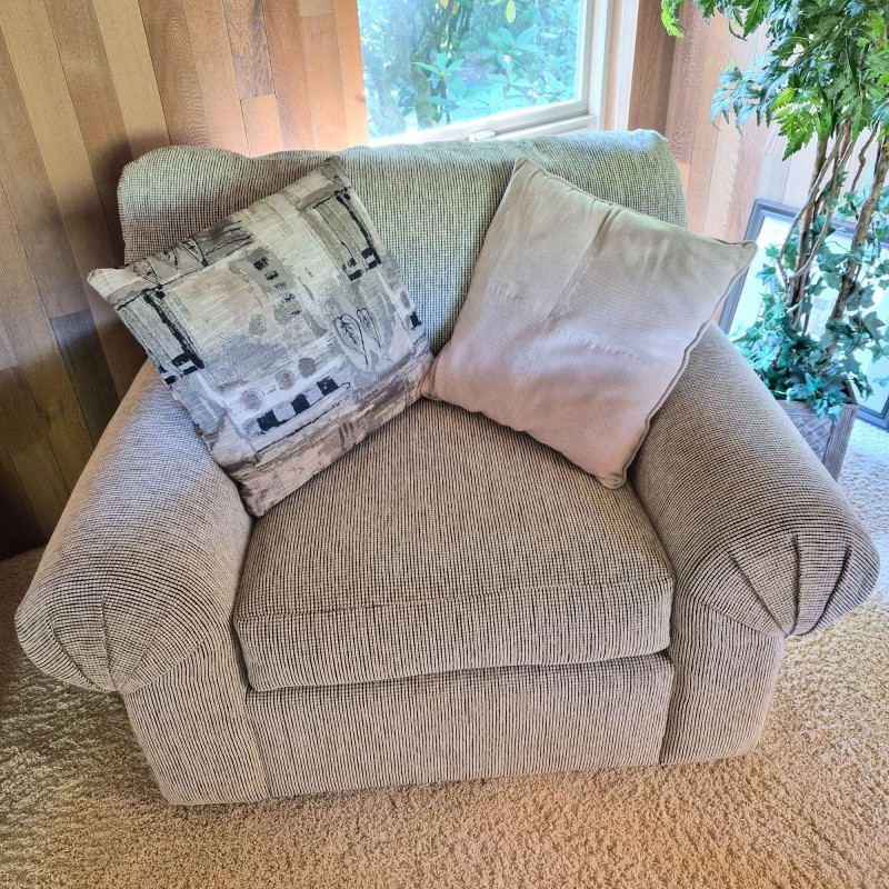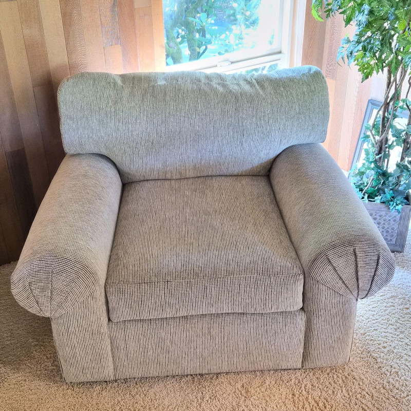 Generously proportioned and inviting, this oversized chair by Krause's is upholstered in a soft café beige fabric—neutral, warm, and easy to style. Measures 46" long x 31" tall x 30" deep. Designed for everyday comfort with zippered upholstery for easy cleaning and removable decorative pillows for added charm. A perfect companion piece to the matching sofa and loveseat or a cozy standalone seat for reading and relaxing. Due to its size and weight, bidding on this lot confirms agreement to bring at least two or more able-bodied individuals, an appropriate sized moving vehicle (NOTE MEASUREMENTS) and appropriate equipment (e.g., dollie, hand truck) for safe removal. Failure to comply may result in forfeiture without refund. No staff on site to assist with moving this item.