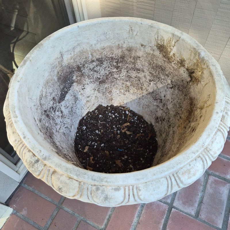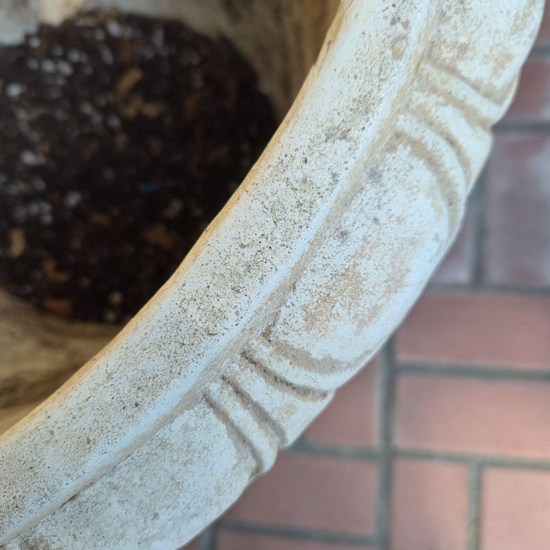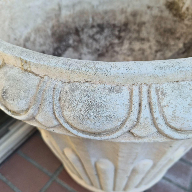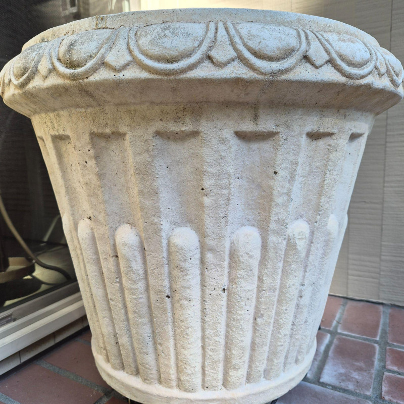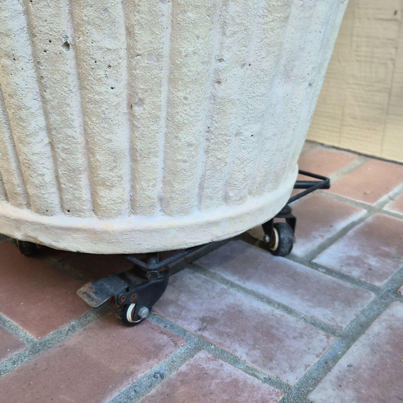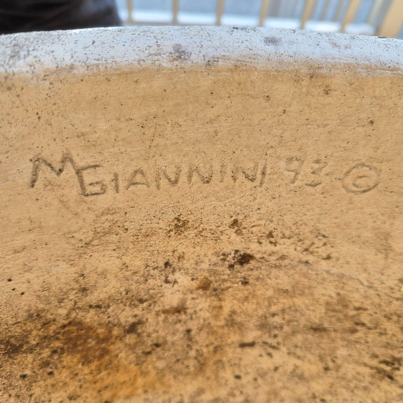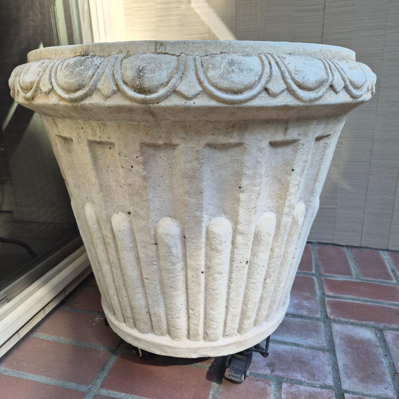 Elevate your garden or patio with this stately outdoor planter, measuring 22" wide by 19" tall, and perched atop a black metal rolling stand for effortless mobility. Crafted from light-toned cement, the planter features vertical fluting and a scalloped rim—evoking classical architectural charm. Inside the top of the planter is etched with makers mark - M. Giannini '93. Its generous size makes it ideal for showcasing seasonal blooms, ornamental grasses, or sculptural arrangements. Whether placed beside a sunlit window or nestled into a shaded corner, it brings graceful presence and vintage character to any outdoor space. The rolling base ensures easy repositioning, so you can follow the light or refresh your layout with ease.