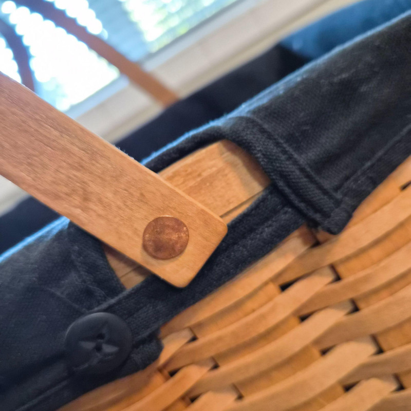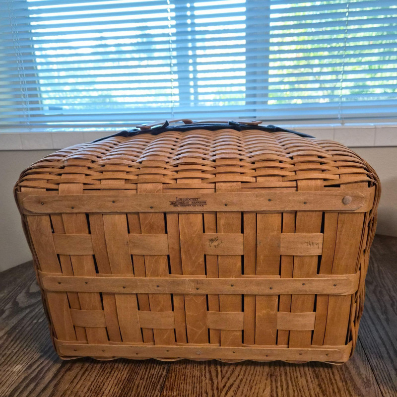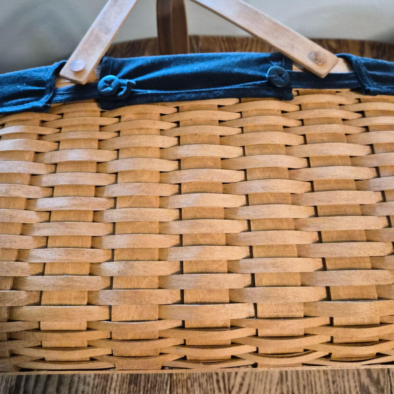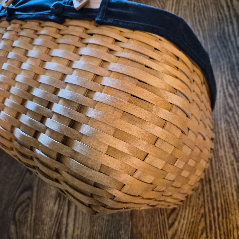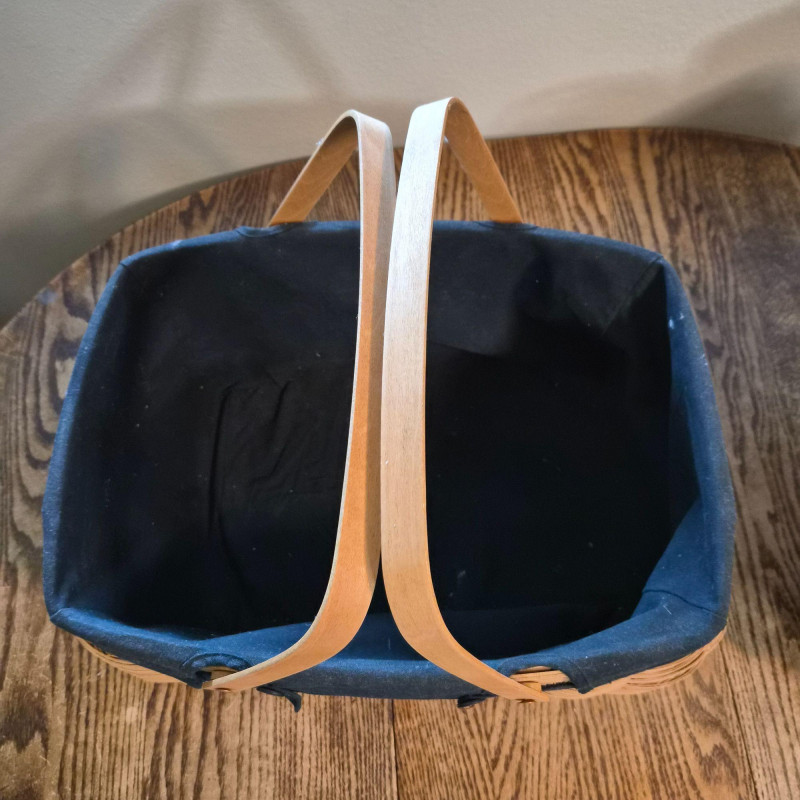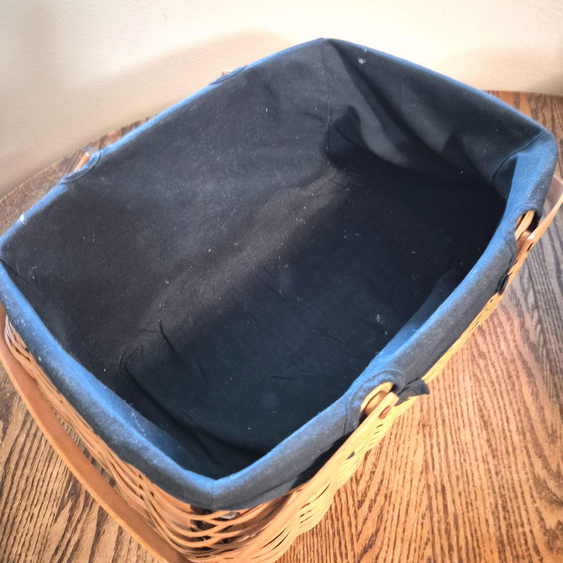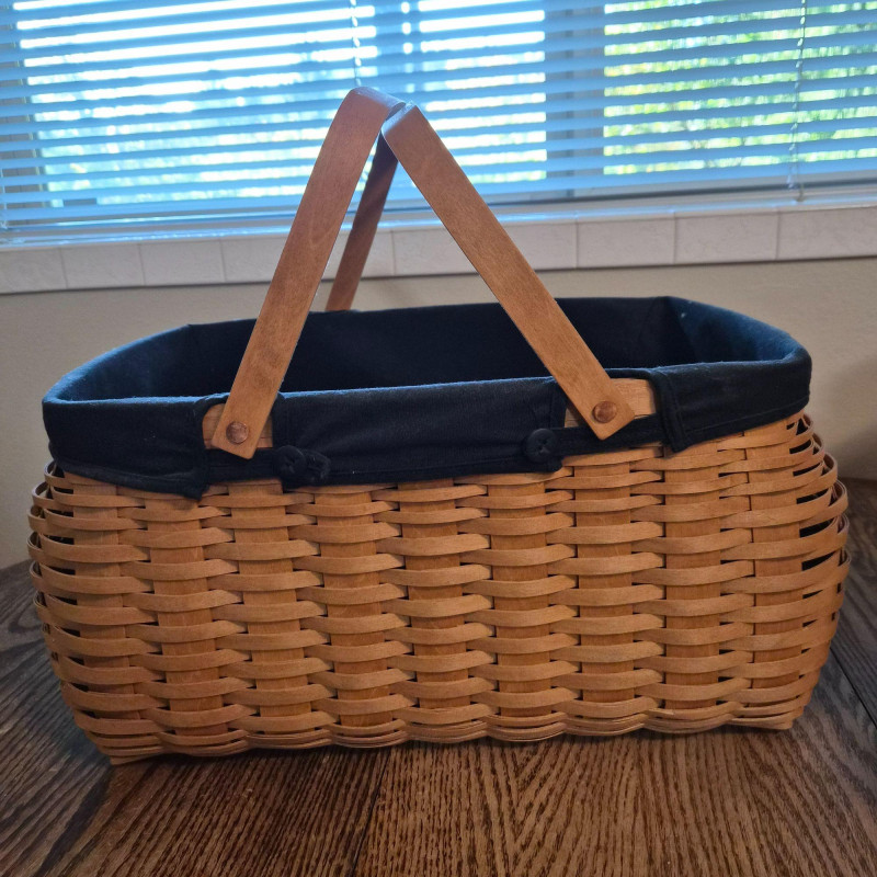 A classic Longaberger basket in a generous size, complete with a fitted black cotton liner. Measures 18" long x 14" wide x 9.5" tall (not including handles). Handwoven with signature craftsmanship and timeless style, this piece is perfect for organizing, display, or seasonal decor. Durable, collectible, and ready to serve in any room.