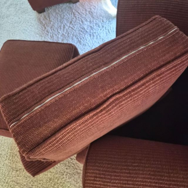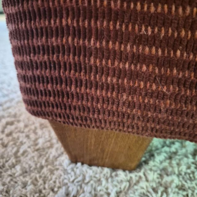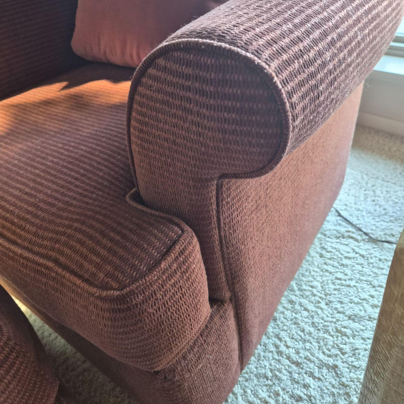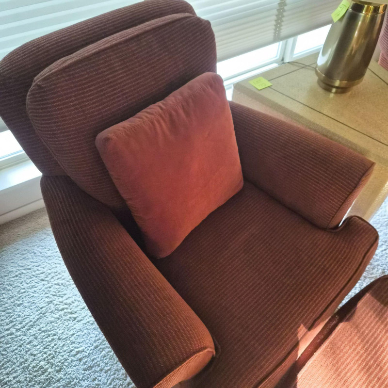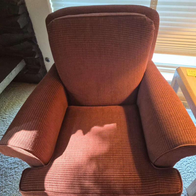 A stylish Bauhaus USA chair upholstered in textured cranberry jute fabric, offering a bold yet refined accent for any room. The clean lines and modern silhouette reflect Bauhaus design principles—form meets function with a touch of flair. Included is a coordinating hassock or footrest measuring 34" x 21" x 17", perfect for added comfort or standalone use. Zippered upholstery for easy cleaning. *Note* Light spots are from the sun shining on the fabric. Due to its size and weight, bidding on this lot confirms agreement to bring at least two or more able-bodied individuals, an appropriate sized moving vehicle (NOTE MEASUREMENTS) and appropriate equipment (e.g., dollie, hand truck) for safe removal. Failure to comply may result in forfeiture without refund. No staff on site to assist with moving this item.