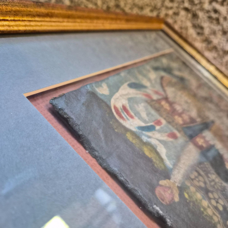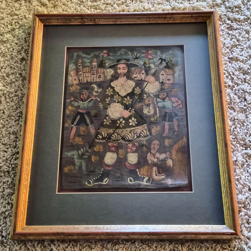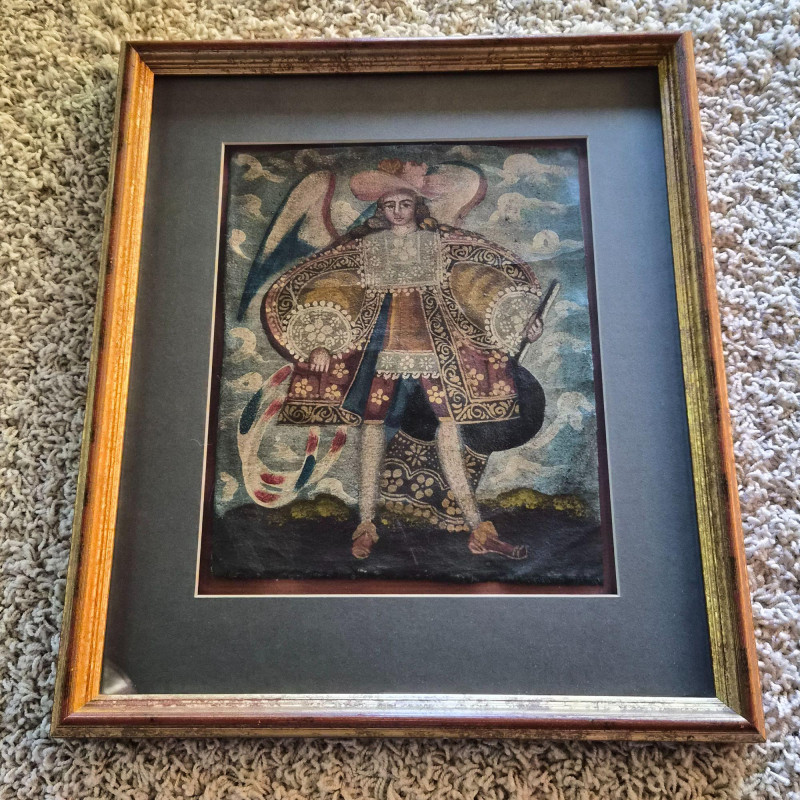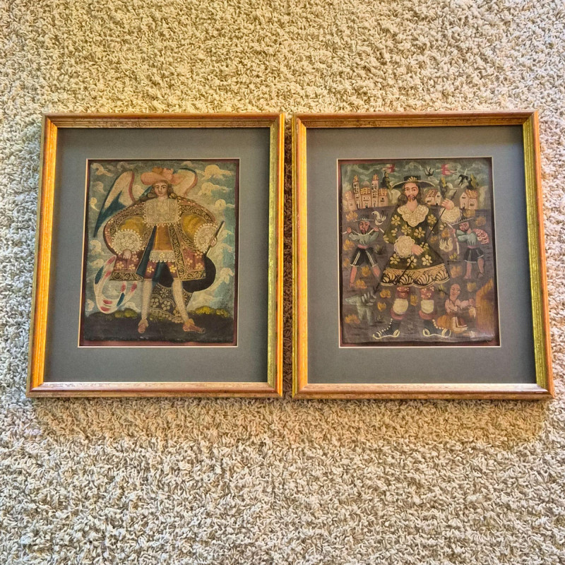 Pair of framed Cuzco Colonial-style artworks, each measuring 13" x 15". Rooted in the rich artistic traditions of 17th–18th century Peru, these pieces reflect the iconic gilded detailing and devotional themes of the Cuzco School. With vivid colors, ornate gold accents, and reverent subjects, this duo offers timeless beauty and spiritual depth—perfect for collectors of Latin American religious art or those seeking dramatic, historical wall décor.