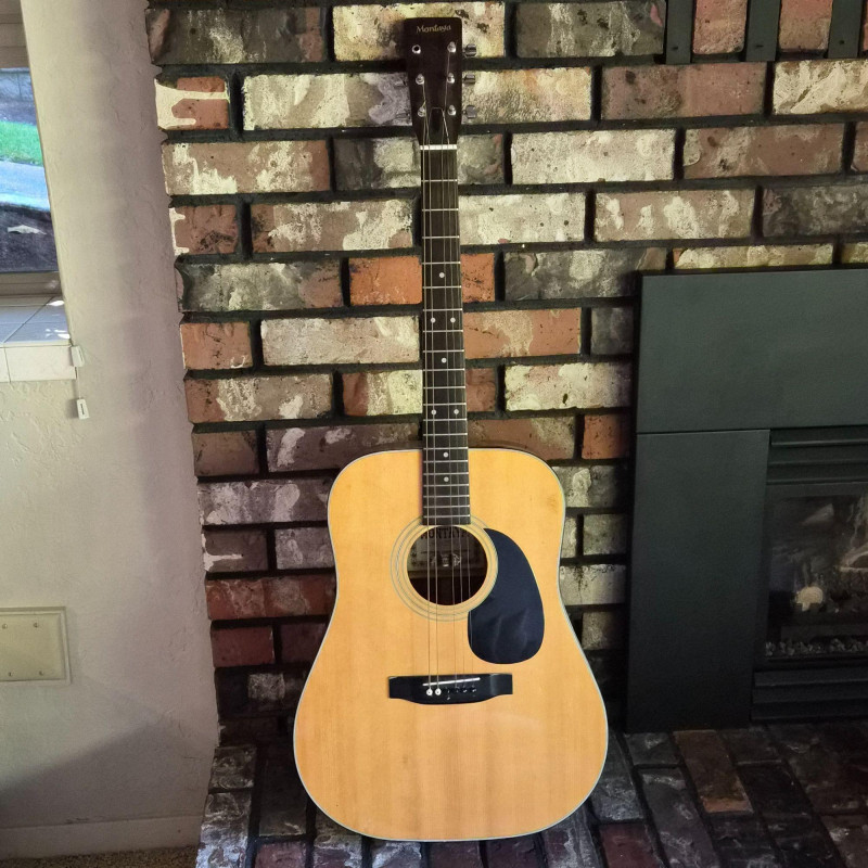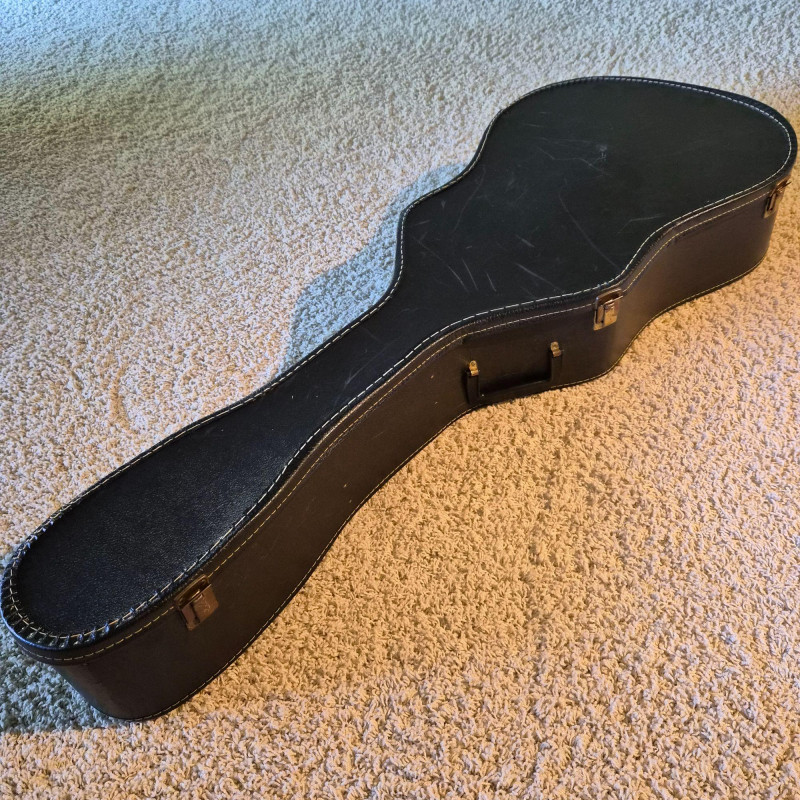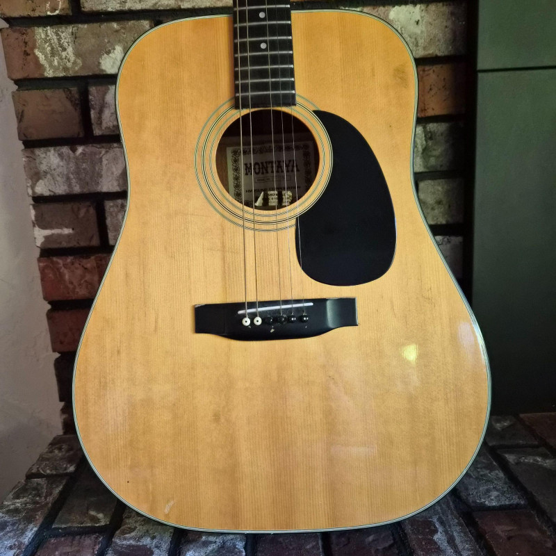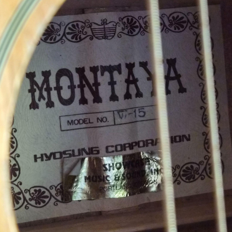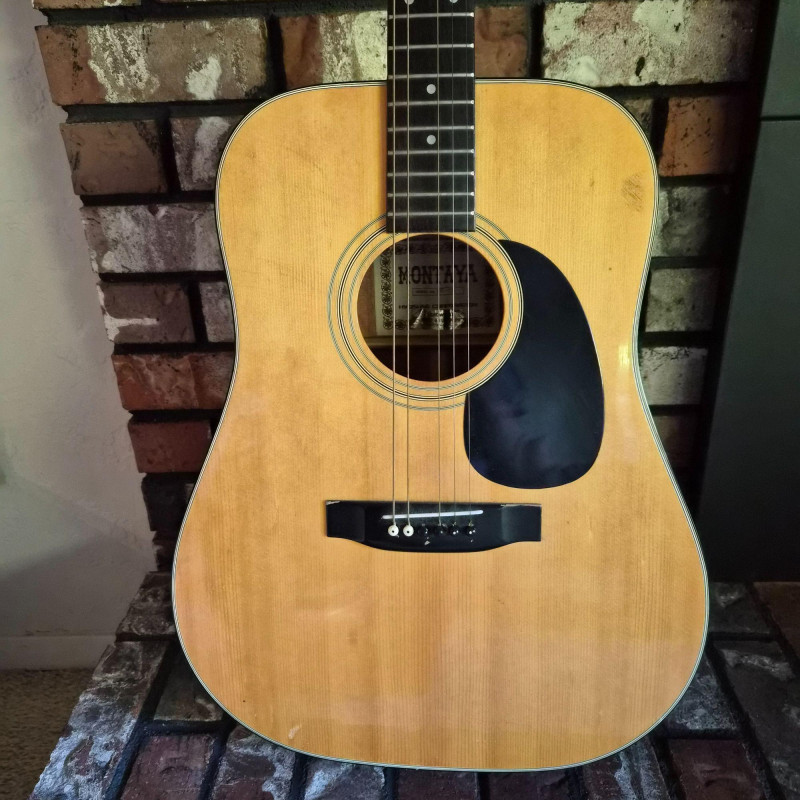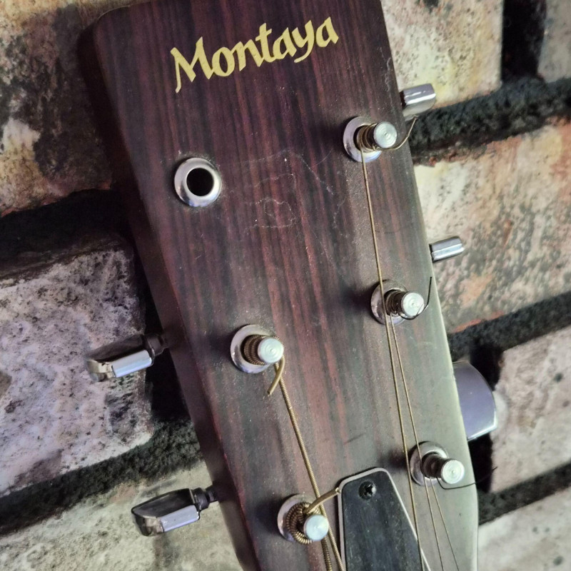 This Montaya acoustic guitar features a warm natural wood finish and classic styling, housed in a durable hard case (does show some wear) for protection and portability. Likely made in the 1980's. One tuning peg requires replacement, but the instrument remains structurally sound and visually appealing. Ideal for hobbyists, beginners, or collectors seeking a vintage acoustic with character. A great candidate for light restoration or display.