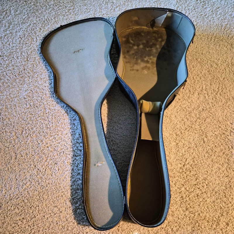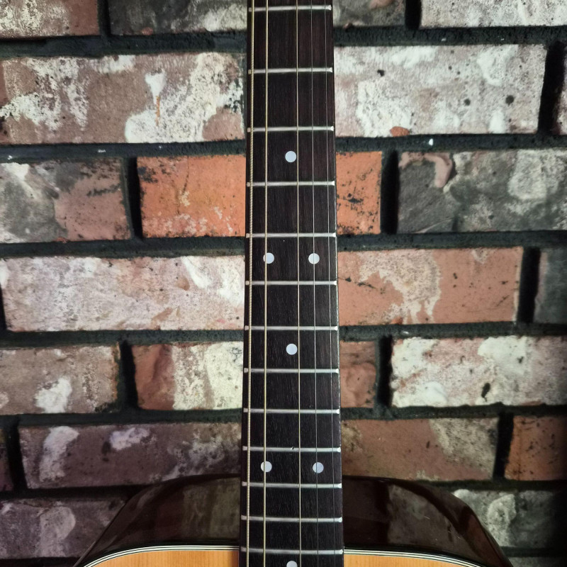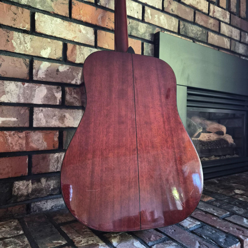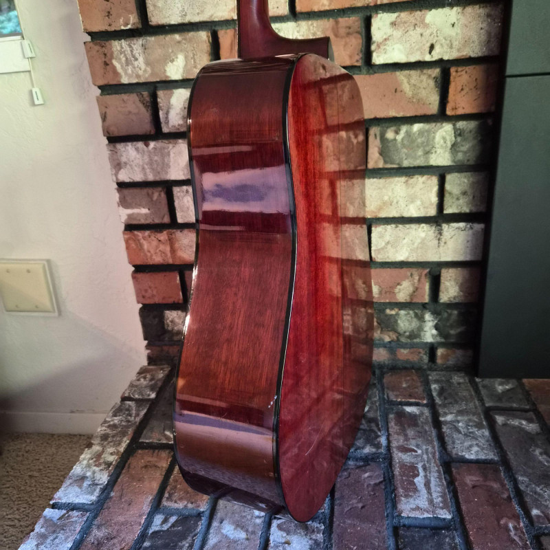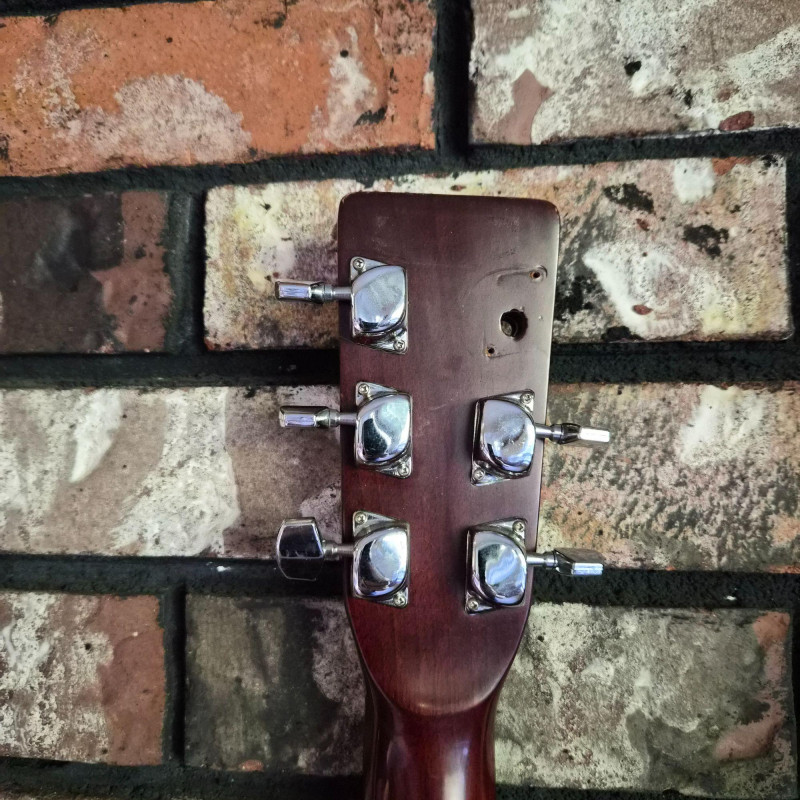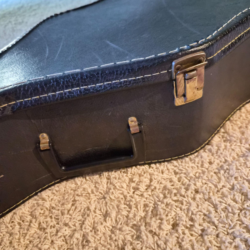 This Montaya acoustic guitar features a warm natural wood finish and classic styling, housed in a durable hard case (does show some wear) for protection and portability. Likely made in the 1980's. One tuning peg requires replacement, but the instrument remains structurally sound and visually appealing. Ideal for hobbyists, beginners, or collectors seeking a vintage acoustic with character. A great candidate for light restoration or display.
