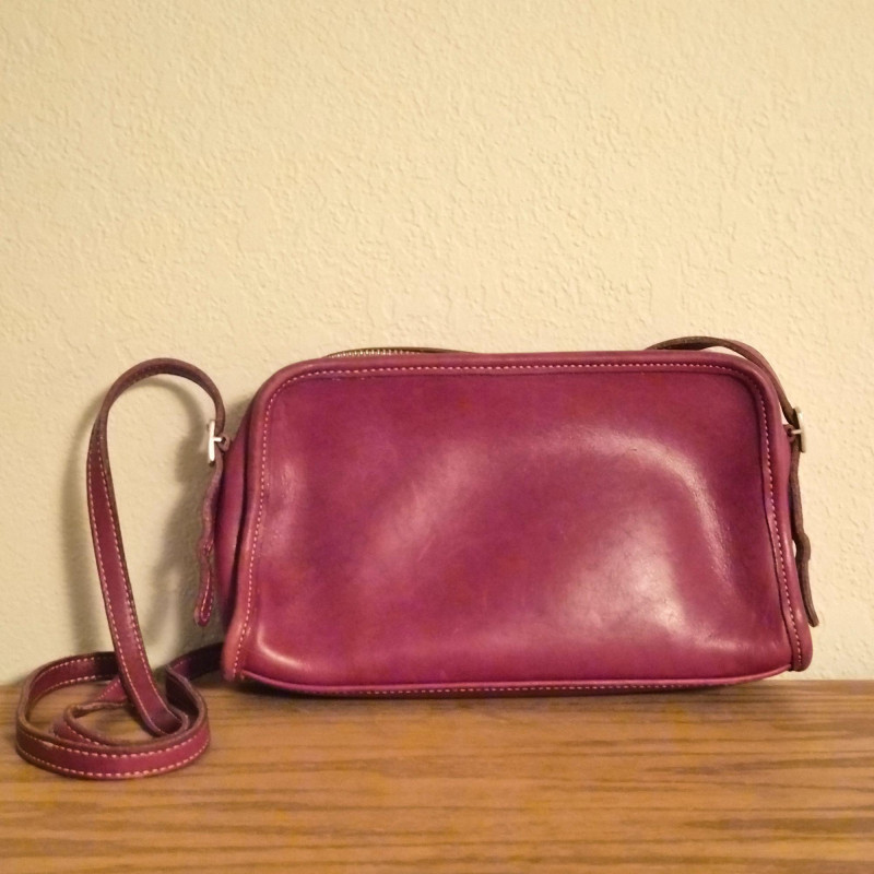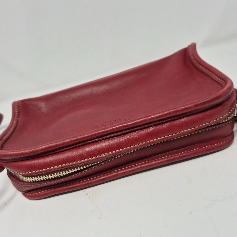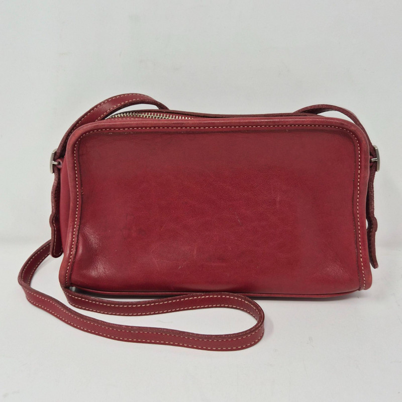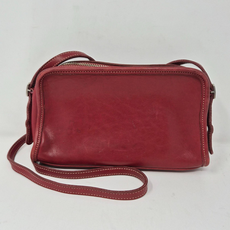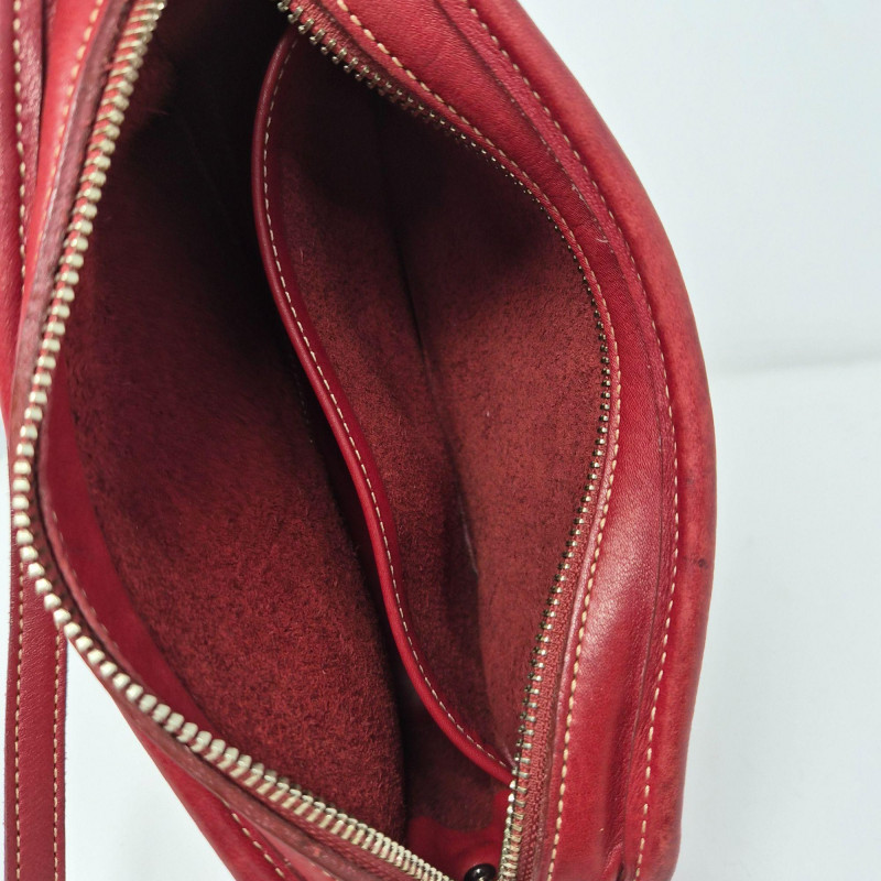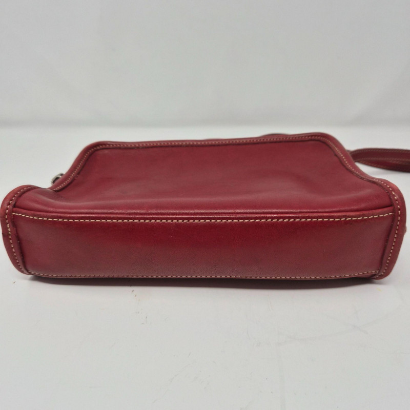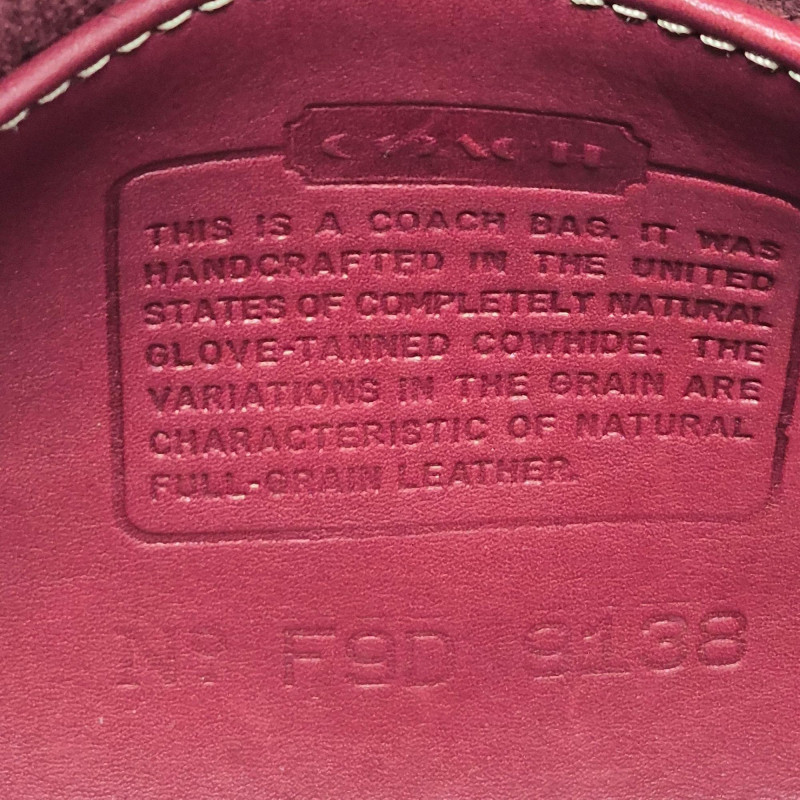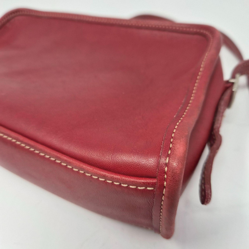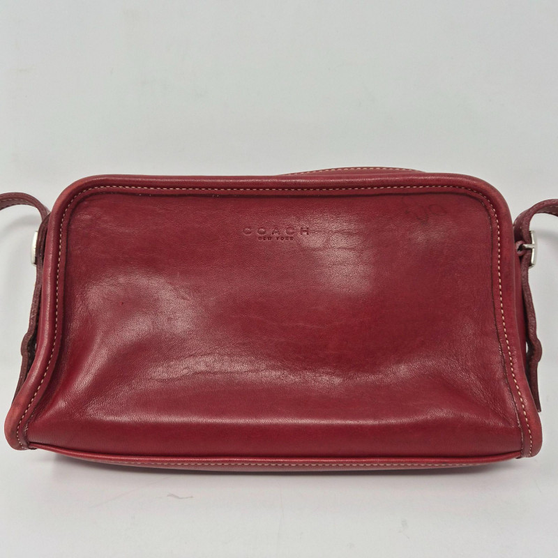 Smaller size, authentic Coach handbag in rich red leather, featuring a sleek silhouette and buckle-adjustable strap with a 20" drop. Compact yet functional, it measures approximately 9.5" long x 5.5" tall x 2" deep—ideal for essentials with a pop of color. Zipper top closure and white stitching. Embossed creed and serial number F9D-9138. Pre-loved with character, offering everyday elegance and enduring style.