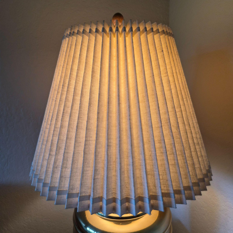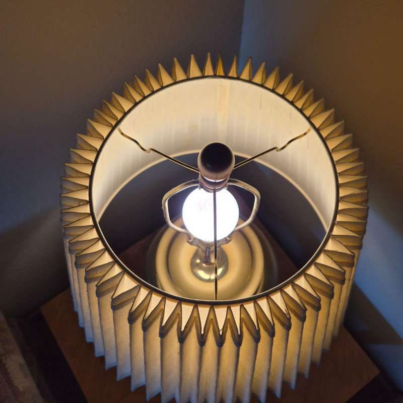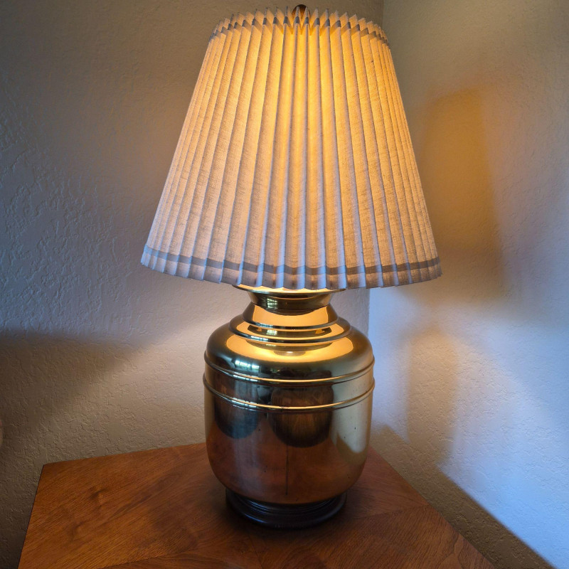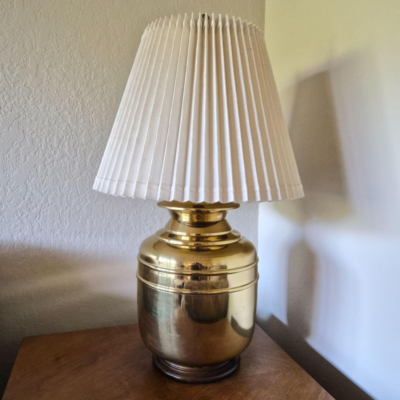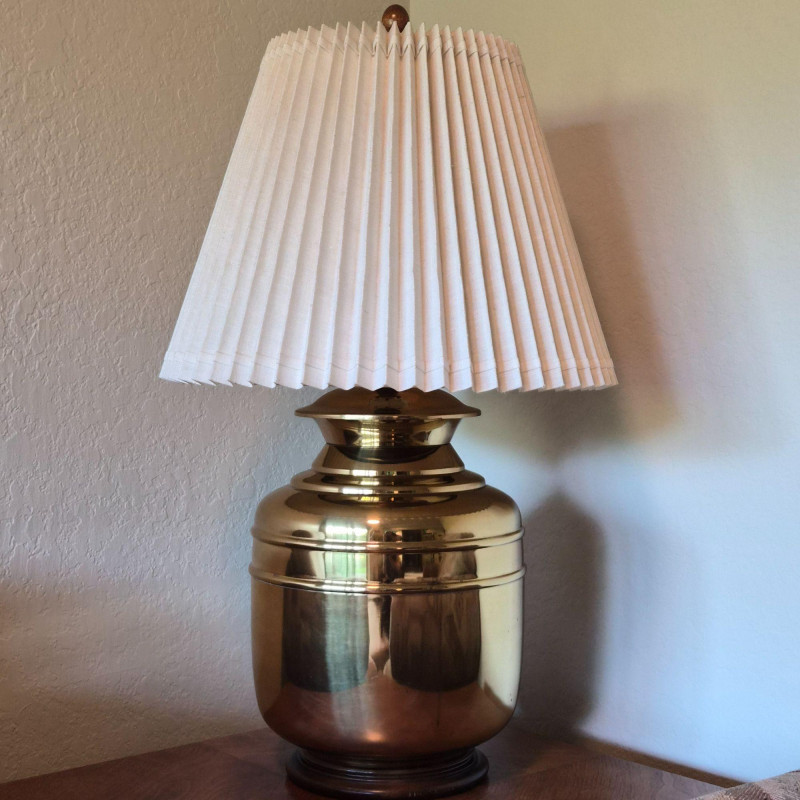 A stately brass table lamp with warm wood accents and a traditional pleated fabric shade. Features a three-way light switch for adjustable ambiance. The brass body measures 12" in diameter, anchored by a wood base and topped with a matching wood finial. Shade dimensions: 20" diameter x 15" tall. A well-proportioned piece that blends classic materials with timeless style.