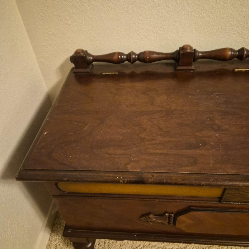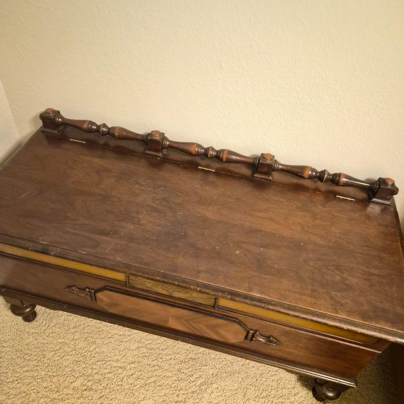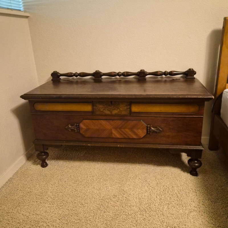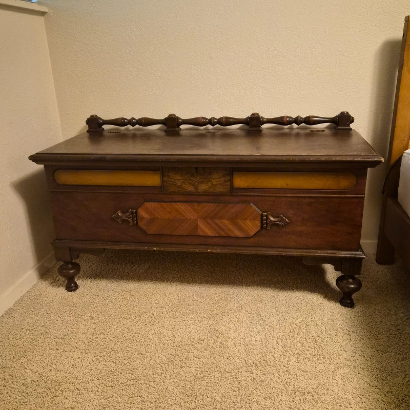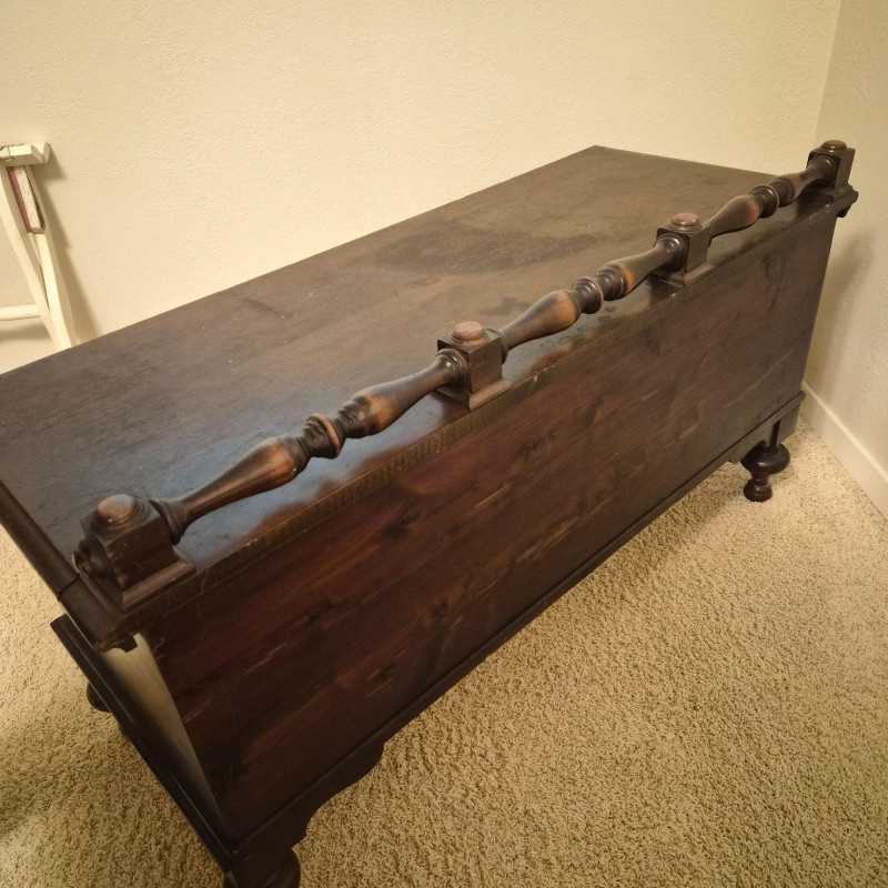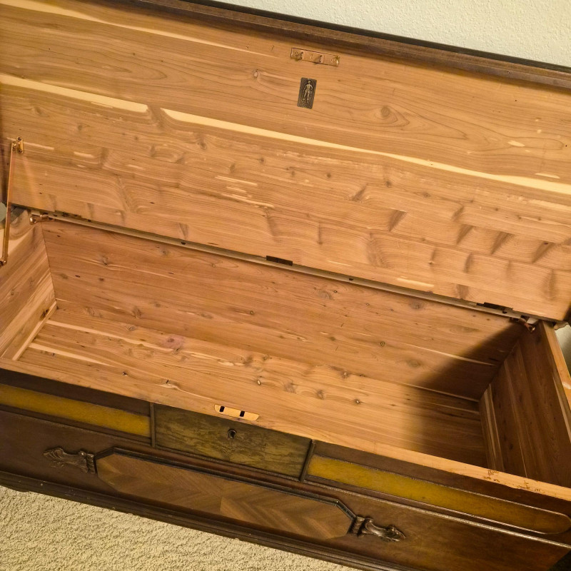 A vintage cedar-lined hope chest by Cavalier, featuring a rich dark wood exterior and classic turned back rail. Measures approximately 44" long x 25" tall x 19" deep. The hinged lid opens to reveal a fragrant cedar interior, ideal for storing linens, keepsakes, or seasonal items. Includes original Cavalier maker’s plaque. A timeless storage piece with heirloom charm and solid construction. Due to its size and weight, bidding on this lot confirms agreement to bring at least two or more able-bodied individuals, an appropriate sized moving vehicle (NOTE MEASUREMENTS) and appropriate equipment (e.g., dollie, hand truck) for safe removal. Failure to comply may result in forfeiture without refund. No staff on site to assist with moving this item.