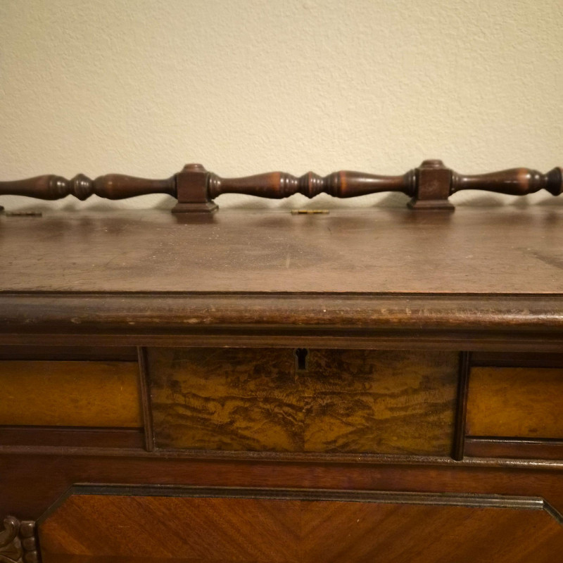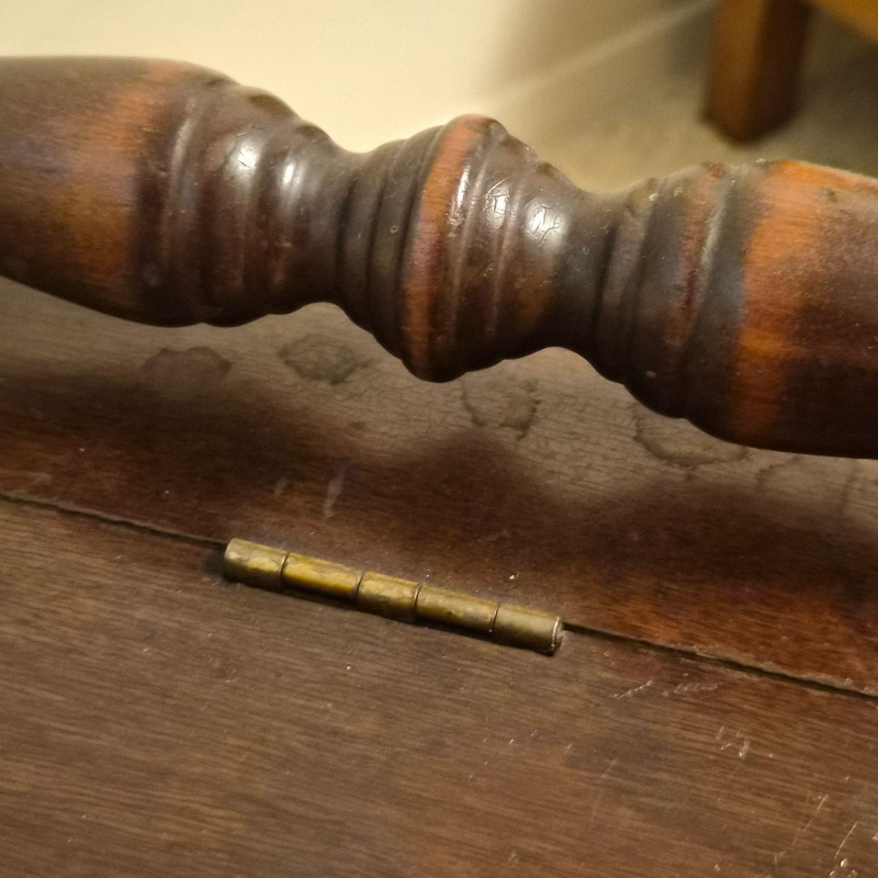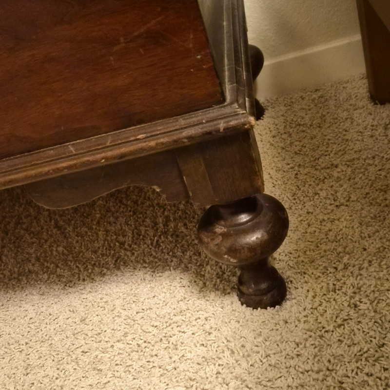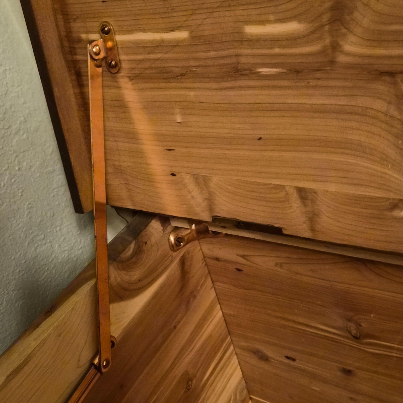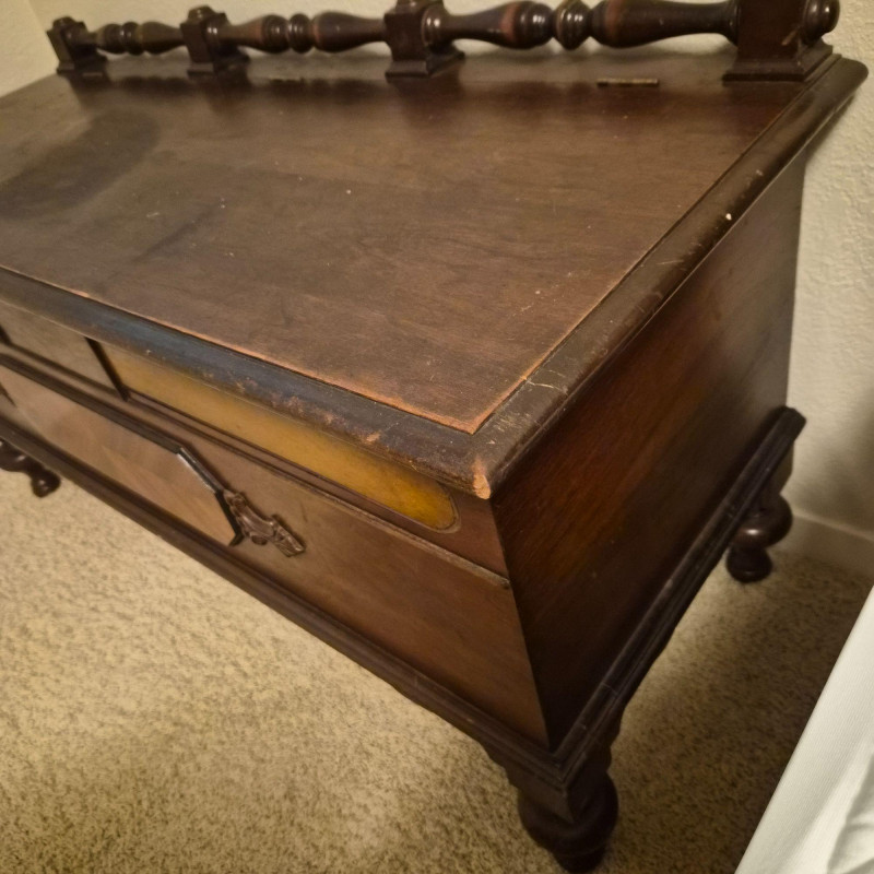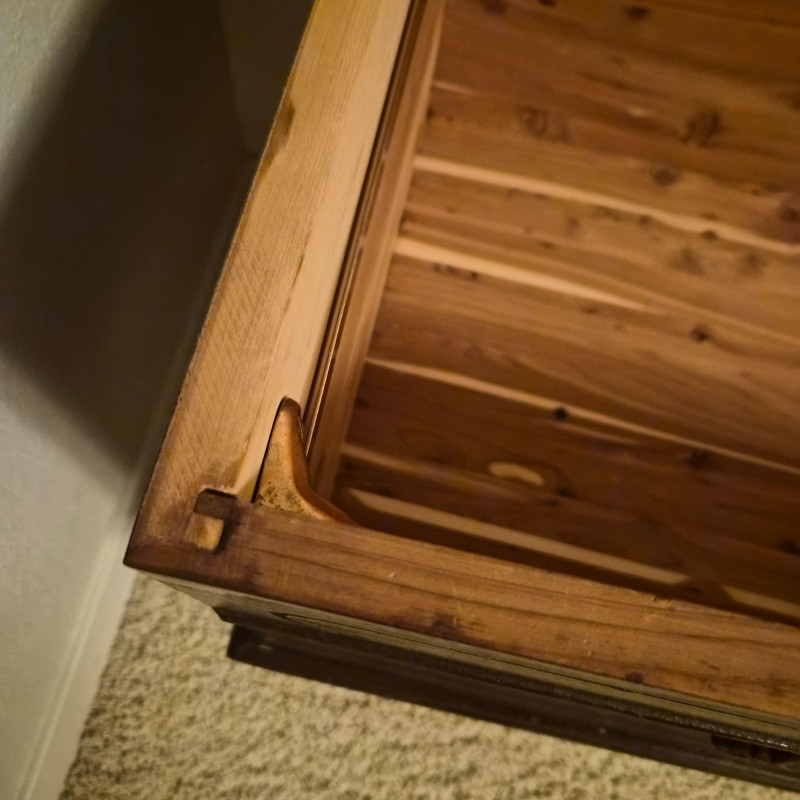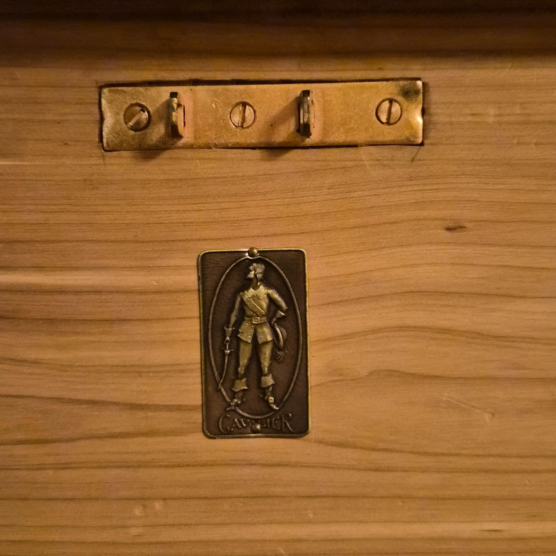 A vintage cedar-lined hope chest by Cavalier, featuring a rich dark wood exterior and classic turned back rail. Measures approximately 44" long x 25" tall x 19" deep. The hinged lid opens to reveal a fragrant cedar interior, ideal for storing linens, keepsakes, or seasonal items. Includes original Cavalier maker’s plaque. A timeless storage piece with heirloom charm and solid construction. Due to its size and weight, bidding on this lot confirms agreement to bring at least two or more able-bodied individuals, an appropriate sized moving vehicle (NOTE MEASUREMENTS) and appropriate equipment (e.g., dollie, hand truck) for safe removal. Failure to comply may result in forfeiture without refund. No staff on site to assist with moving this item.