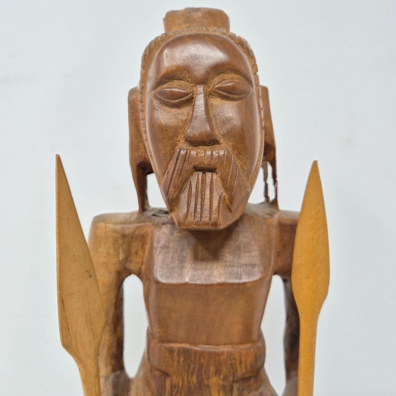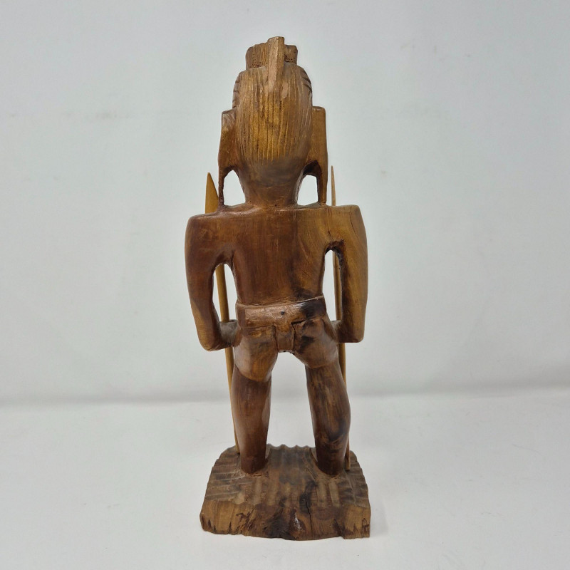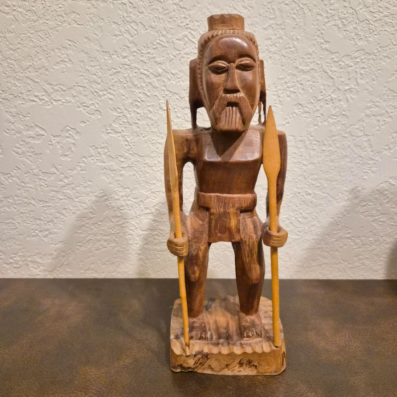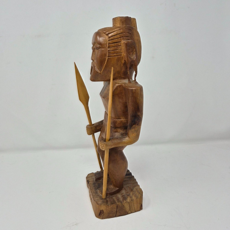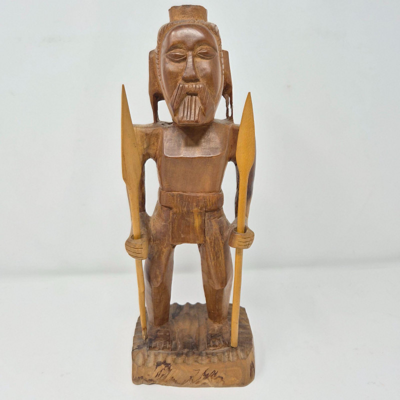 A finely carved wooden sculpture depicting a Chinese warrior figure holding dual spears. Standing 12.5" tall, this piece showcases expressive detail in the figure’s stance, facial features, and flowing garments. The spears add dynamic verticality and a sense of motion. Likely carved from a single block of wood, this sculpture offers cultural character and artisan skill—ideal for display in a study, shelf, or global art collection.