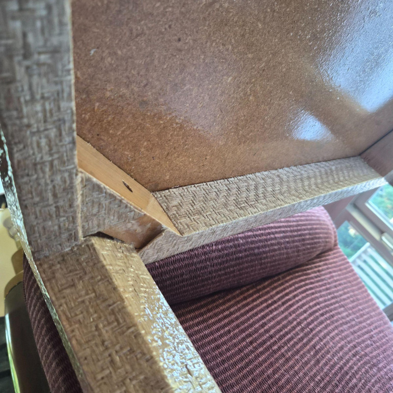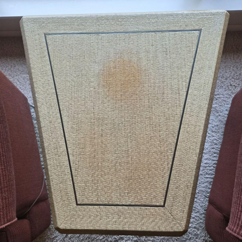 A distinctive solid side table with angular trapezoid silhouette and lacquered wicker-look finish. Measures 30" at its widest x 22.5" tall. The surface shows a subtle fade spot where a lamp once sat, adding vintage character.