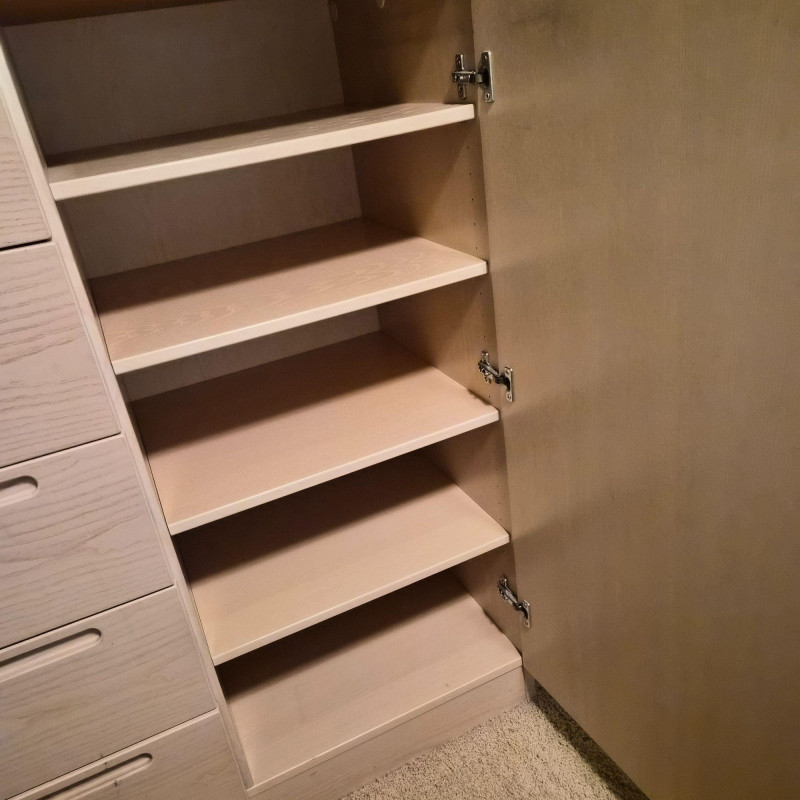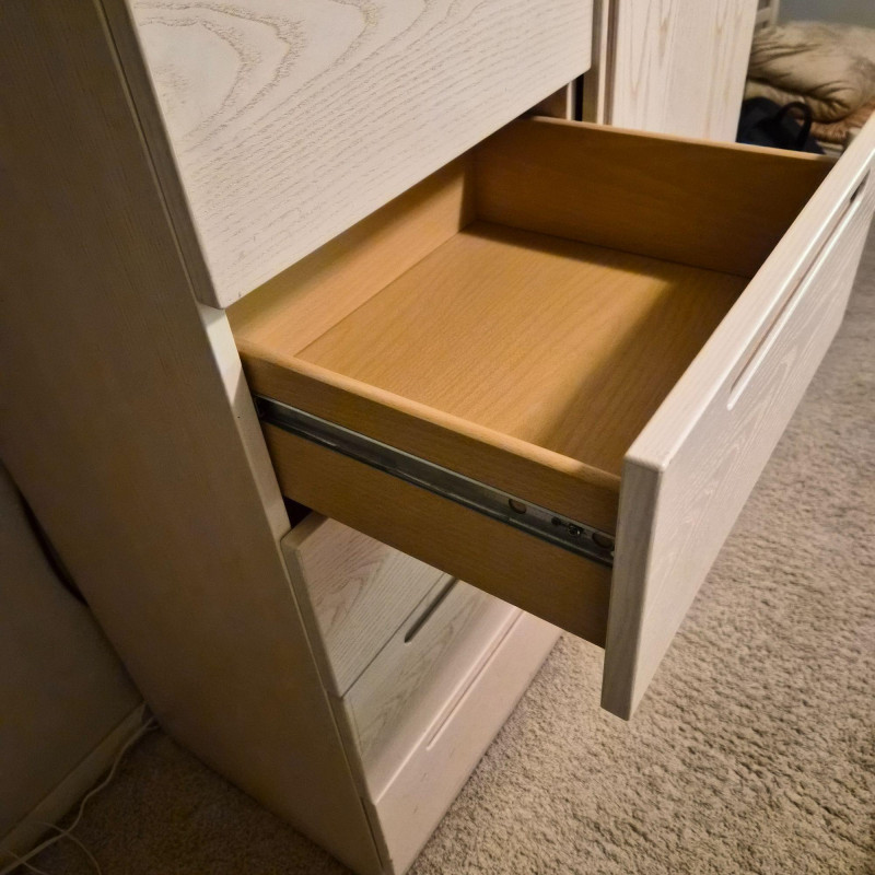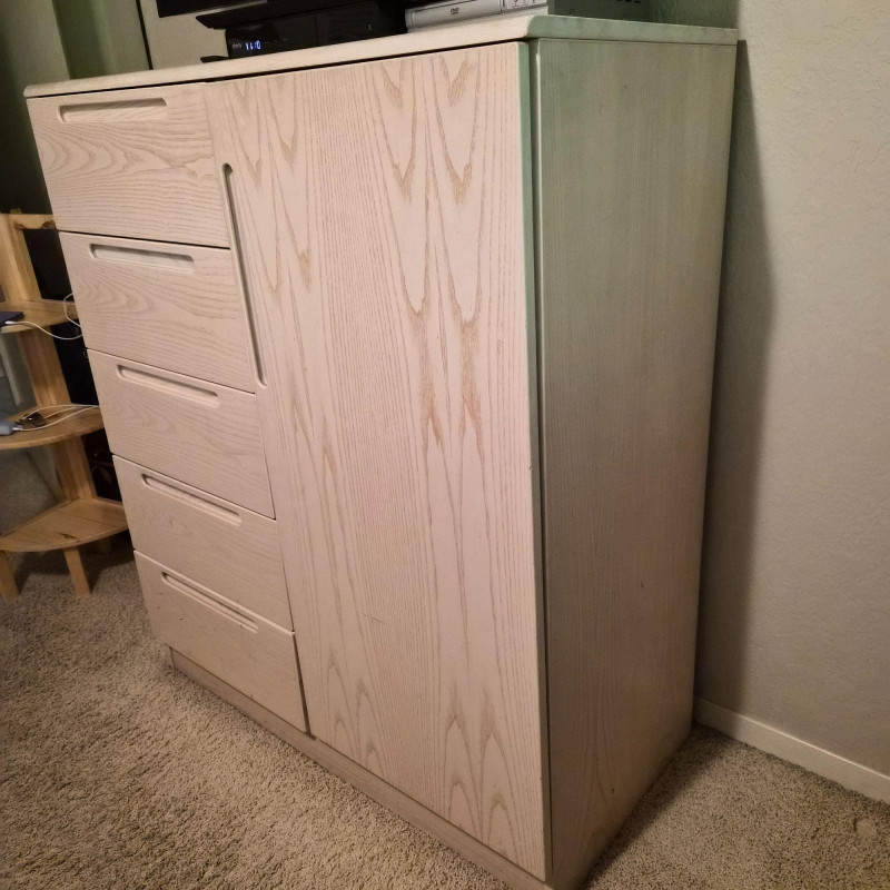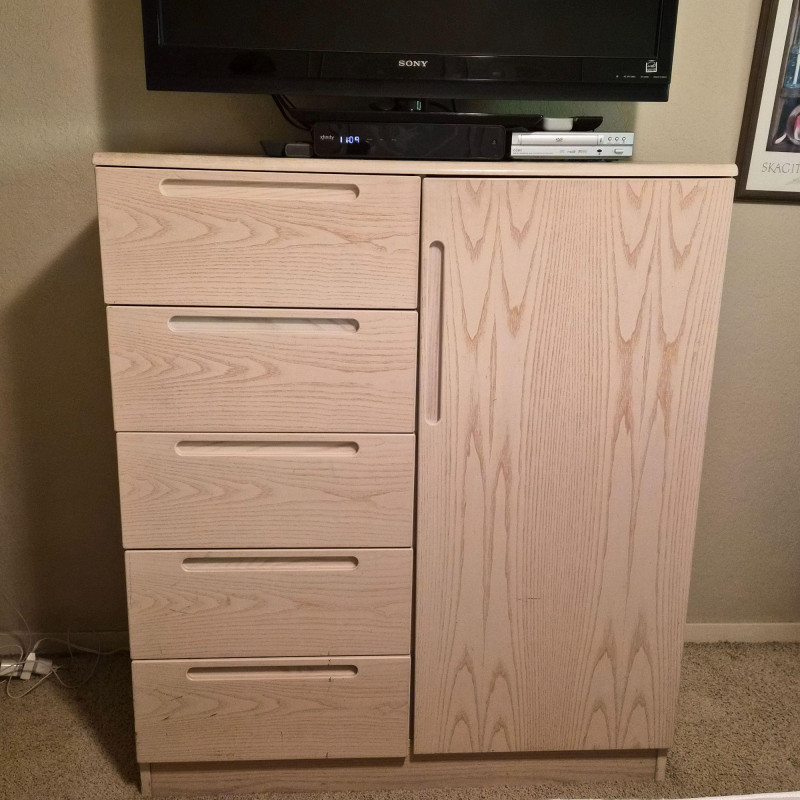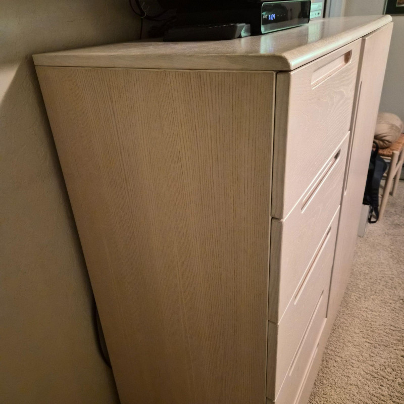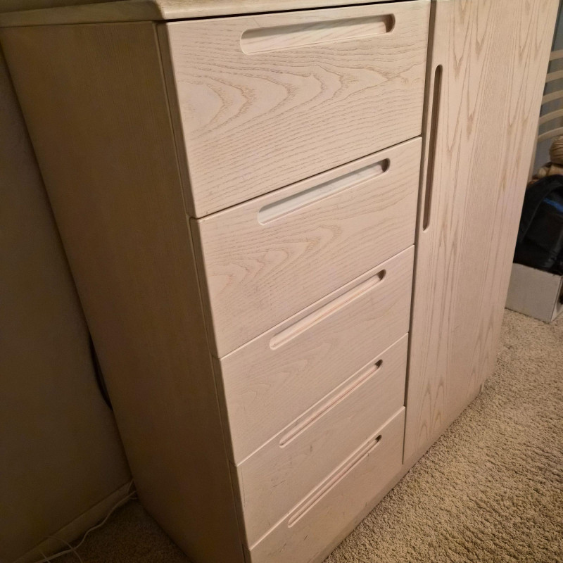 Warm-toned and clean-lined, modern blonde wood dresser cabinet offers both style and substance. Measuring 41" wide x 48" high x 20" deep, it features a dual-function layout: the left side houses five smooth-gliding drawers for clothing or linens, while the right side opens to a cabinet door revealing five adjustable shelves—perfect for folded items, accessories, or discreet organization. A versatile piece that blends seamlessly into vintage, minimalist, or transitional interiors. Due to its size and weight, bidding on this lot confirms agreement to bring at least two or more able-bodied individuals, an appropriate sized moving vehicle (NOTE MEASUREMENTS) and appropriate equipment (e.g., dollie, hand truck) for safe removal. Failure to comply may result in forfeiture without refund. No staff on site to assist with moving this item.