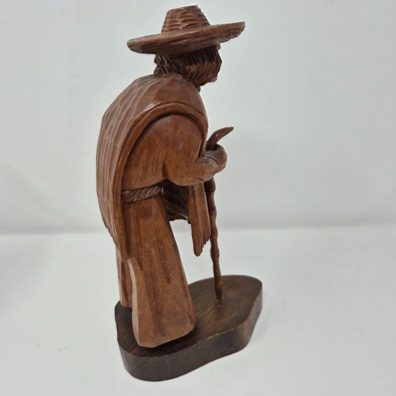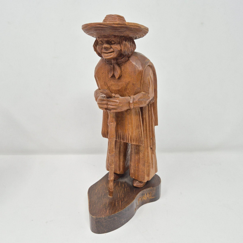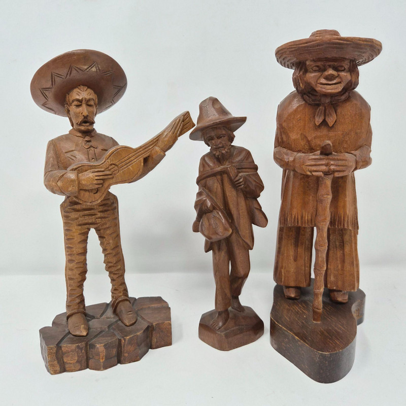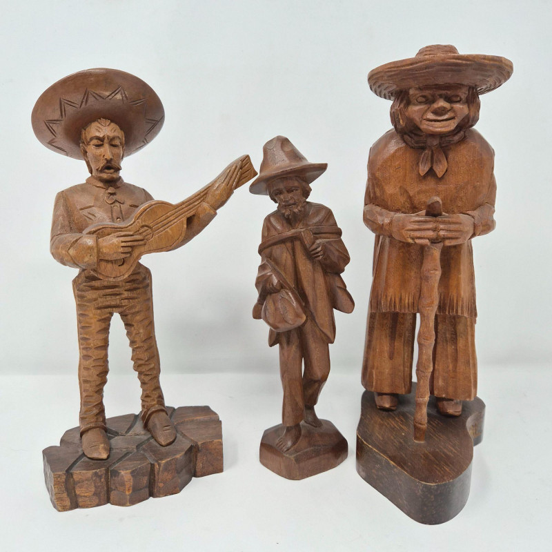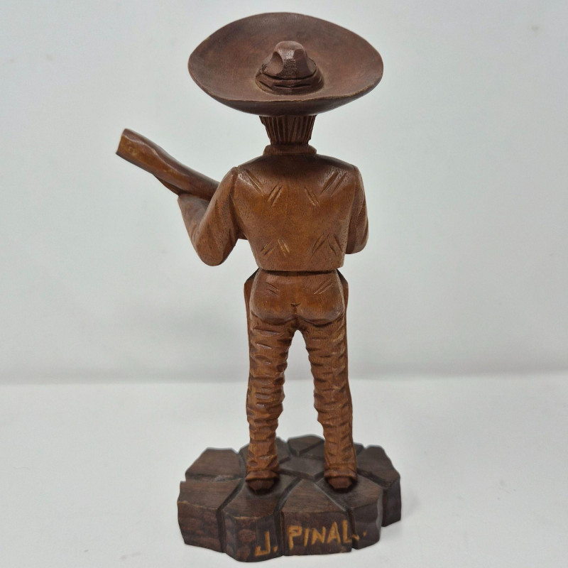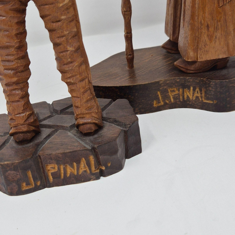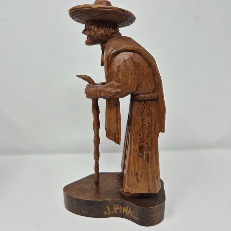 A charming trio of hand-carved wood figures attributed to J. Pinal, accompanied by an unsigned traveler carving. Ranging from 8" to 9" tall, each piece showcases expressive detail and folk artistry. The figures reflect regional character and craftsmanship, ideal for collectors of Latin American carvings or rustic decorative accents.