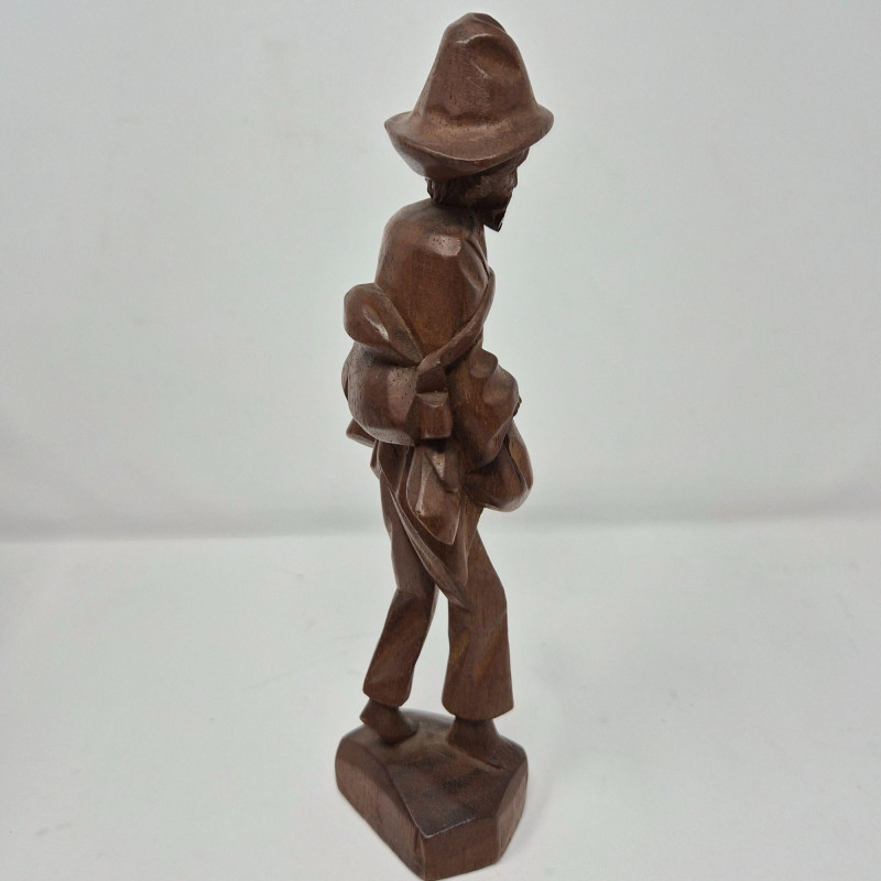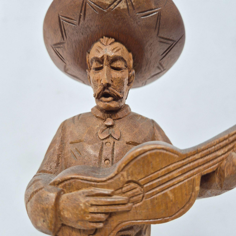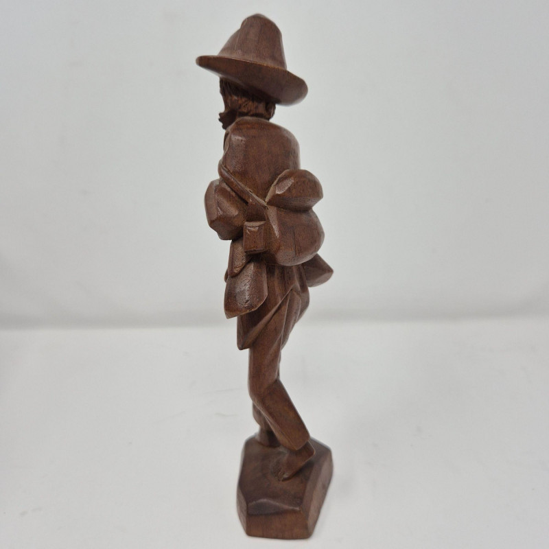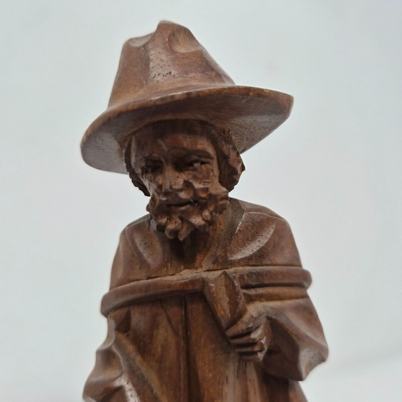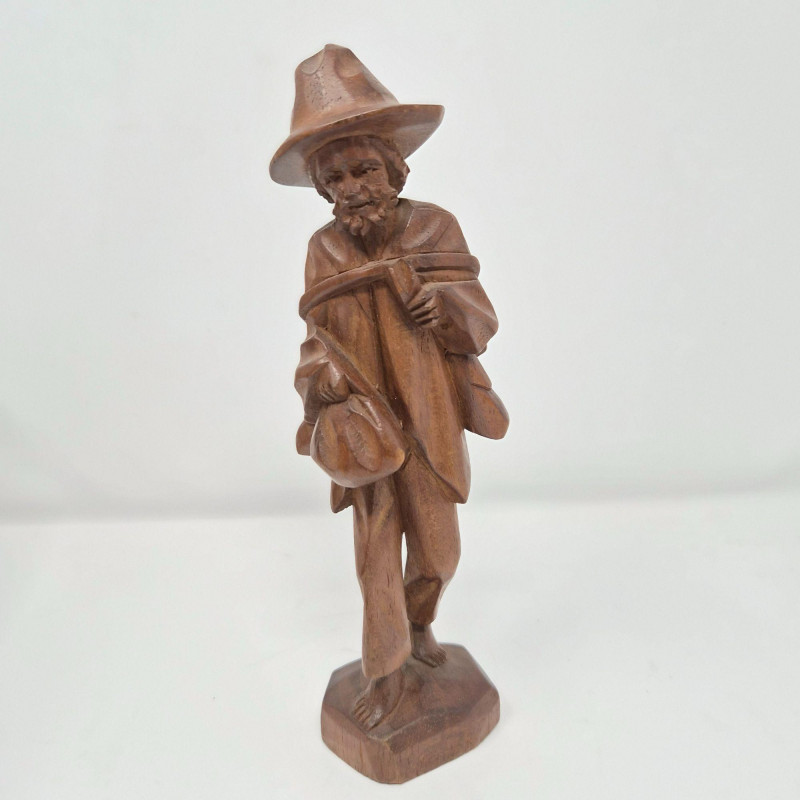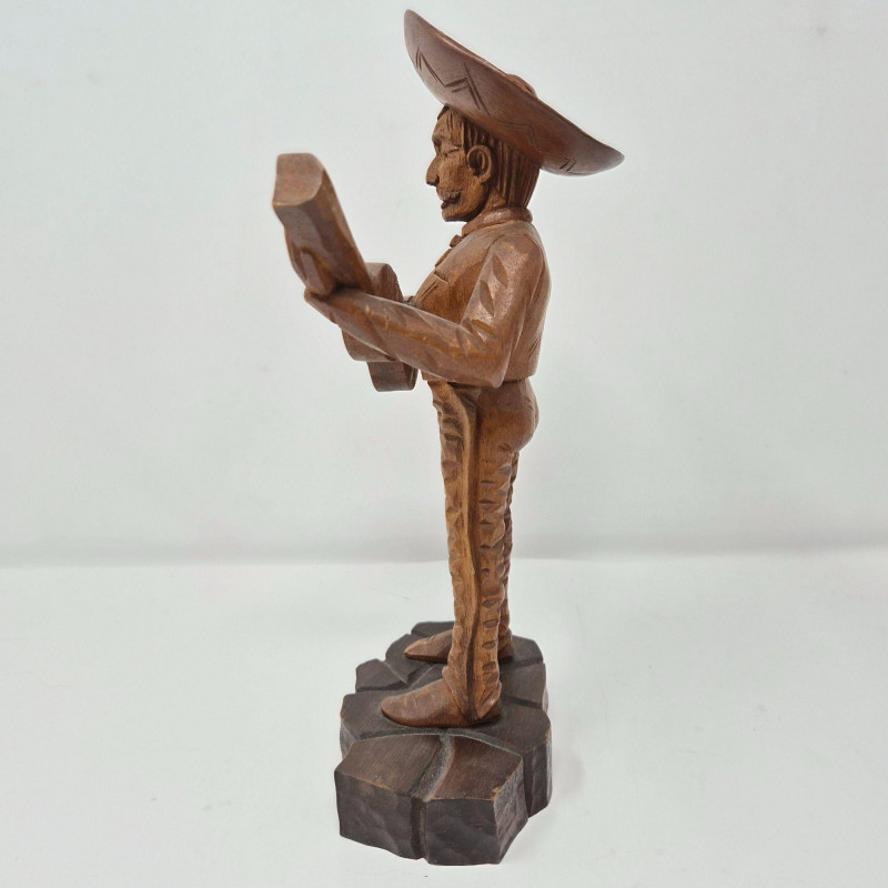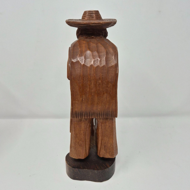 A charming trio of hand-carved wood figures attributed to J. Pinal, accompanied by an unsigned traveler carving. Ranging from 8" to 9" tall, each piece showcases expressive detail and folk artistry. The figures reflect regional character and craftsmanship, ideal for collectors of Latin American carvings or rustic decorative accents.