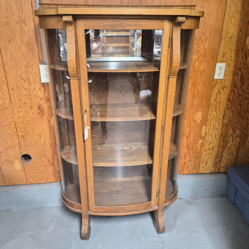 Elegant and inviting, this antique curio cabinet features curved glass panels on the front and sides, offering a graceful view of its contents. Measuring 37" wide x 60" tall x 14" deep, it houses four interior shelves, with a mirrored back on the top shelf to enhance display depth and light. Likely crafted from oak, its warm wood tone and classic silhouette make it a standout piece for showcasing collectibles, heirlooms, or fine decor. Due to its size and weight, bidding on this lot confirms agreement to bring at least two or more able-bodied individuals, an appropriate sized moving vehicle (NOTE MEASUREMENTS) and appropriate equipment (e.g., dollie, hand truck) for safe removal. Failure to comply may result in forfeiture without refund. No staff on site to assist with moving this item.