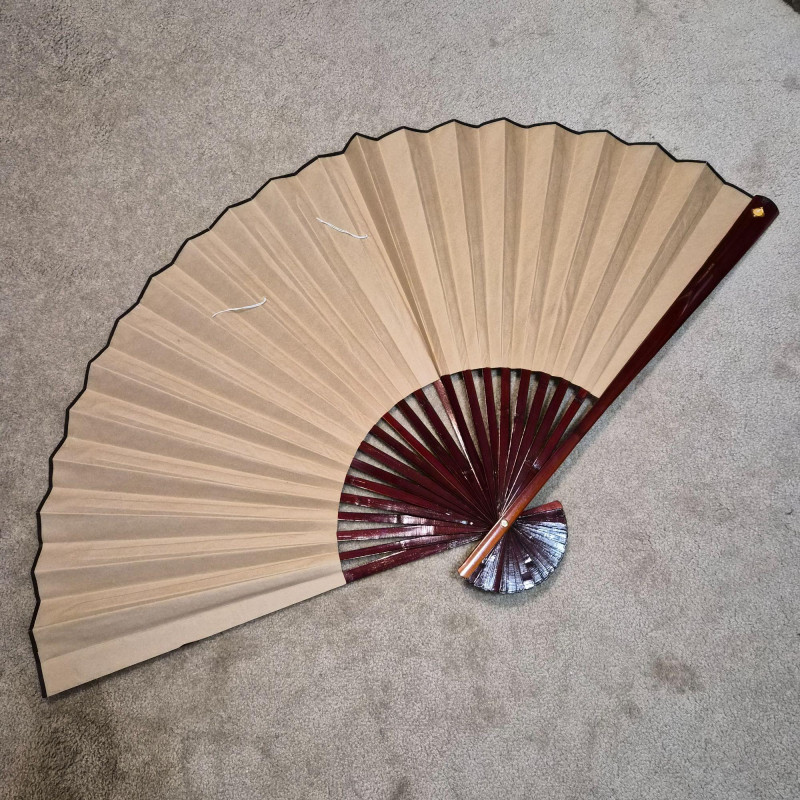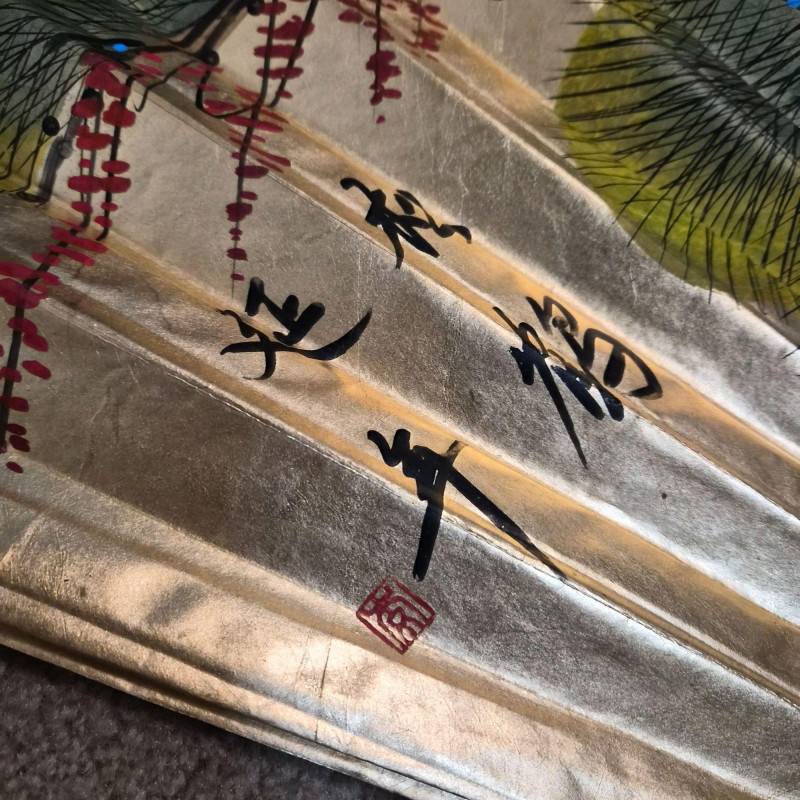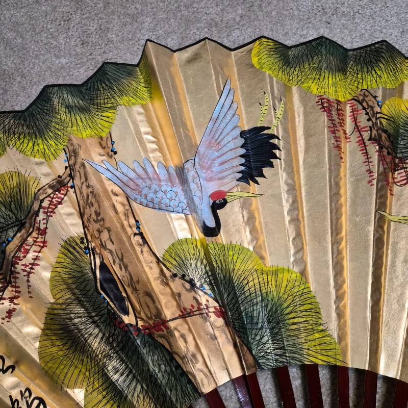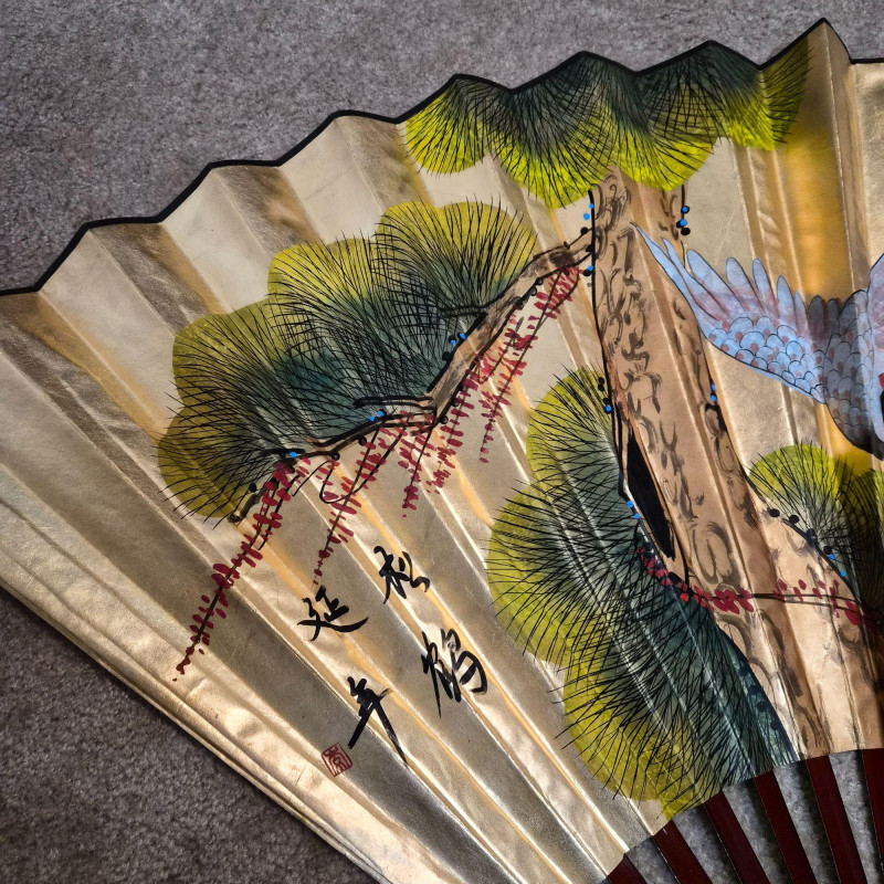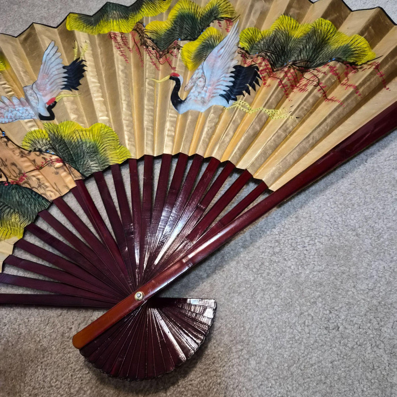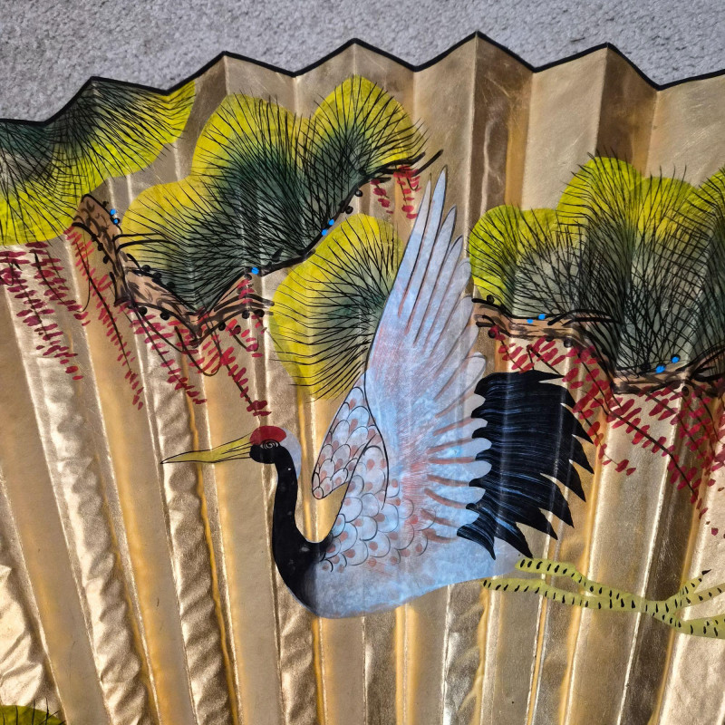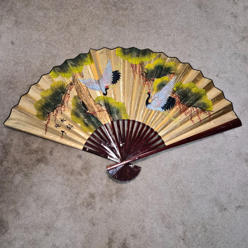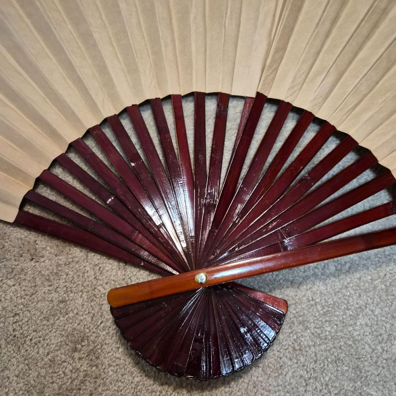 This large Asian-style wall fan features lacquered wood ribs and painted bird and greenery detailing on paper, offering graceful lines and cultural charm. When fully fanned out, it measures 59" wide x 34" tall, making it an eye-catching accent above a bed, sofa, or console. A decorative piece that blends traditional craftsmanship with visual warmth.
