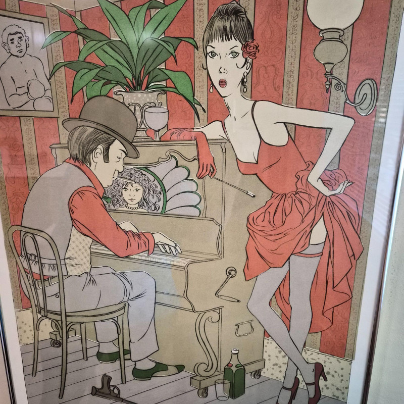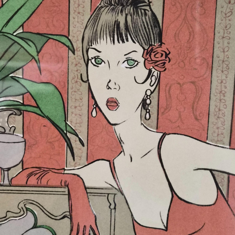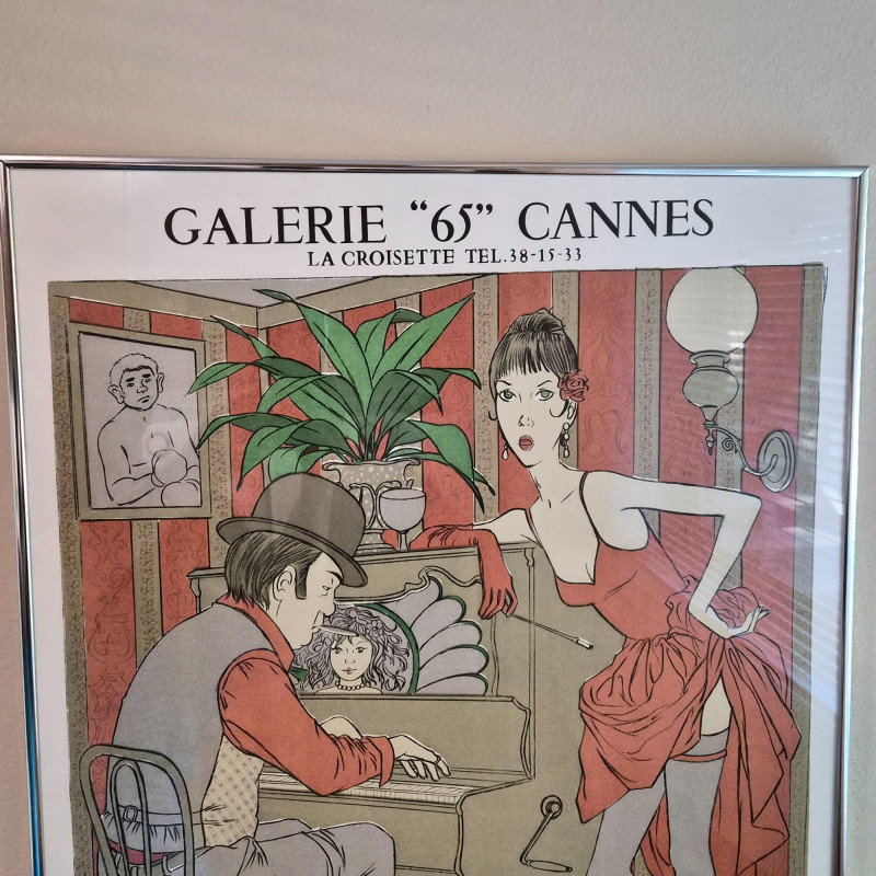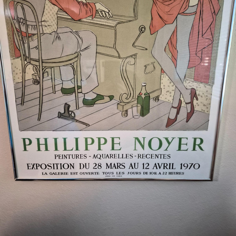 An elegant and framed vintage lithograph poster advertising an exhibition of works by French artist Philippe Noyer. The scene depicts the golden age of French Riviera art culture. This framed exhibition poster announces Philippe Noyer’s 1970 showcase, Peintures - Aquarelles Récentes, held at Galerie "65" on La Croisette in Cannes. Philippe Noyer (1917–1985), celebrated for his elongated figures, opulent interiors, and surrealist-inflected classicism, brought a distinctive glamour to mid-century French illustration. The poster captures the spirit of the era and the prestige of the venue, making it a compelling piece for collectors of vintage art ephemera and lovers of French modernism.