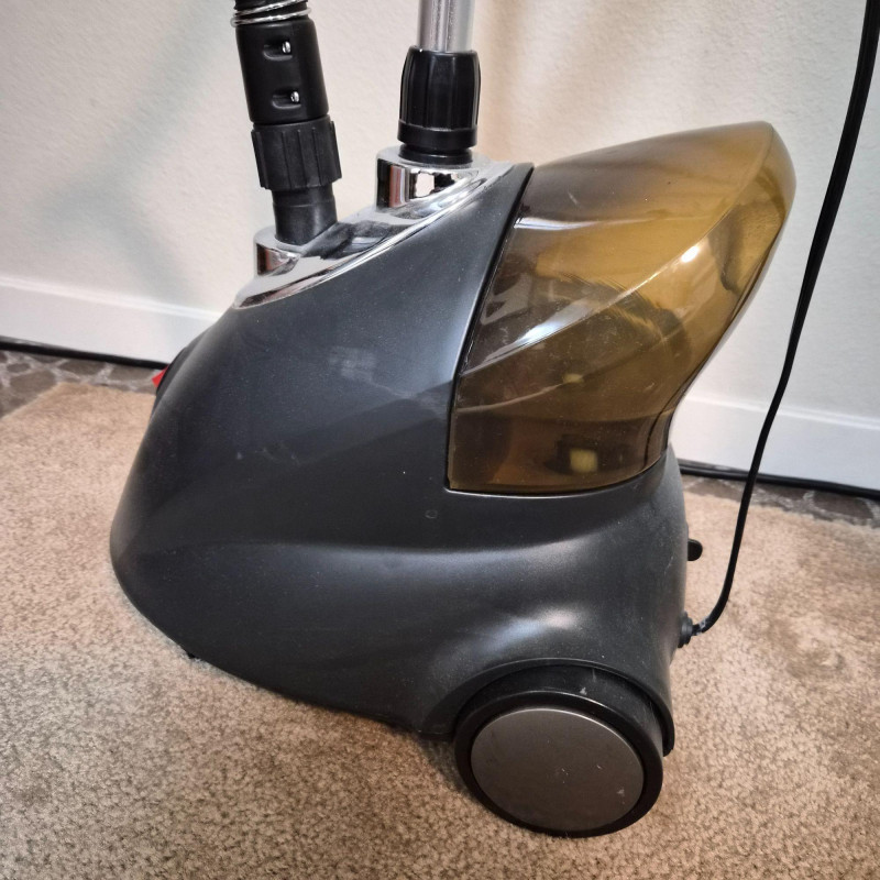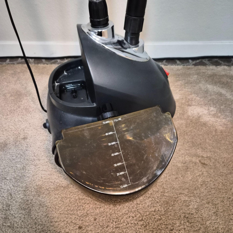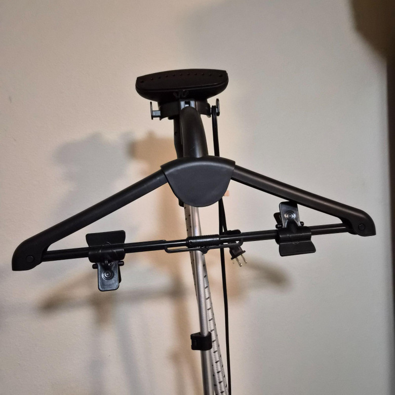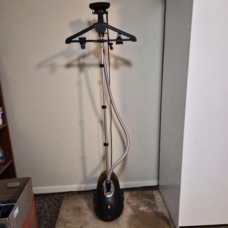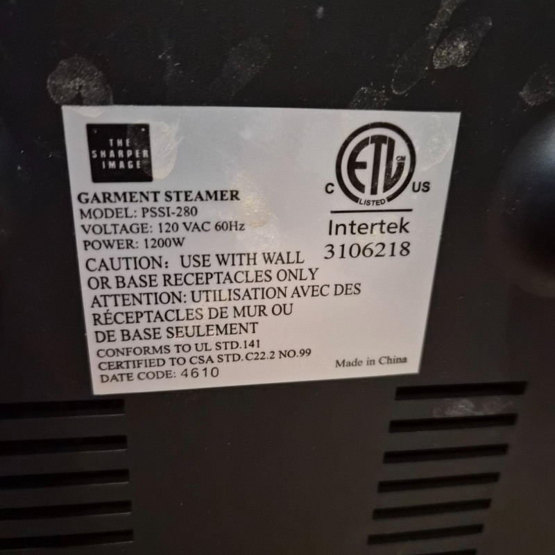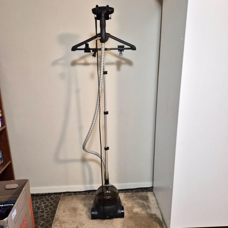 Smooth out your wardrobe with this Sharper Image PSSI-280 garment steamer, a professional-grade tool designed to tackle wrinkles with ease. Featuring an adjustable-height telescoping bar, multifunctional hanger. This unit delivers up to 60 minutes of continuous steam from its 1.8-liter tank. Ideal for clothing, drapes, and upholstery, it includes hanger clips and mini-ironing paddle. Rolls easily on casters for convenient storage. Tested and working—ready to refresh your fabrics and cut down on dry cleaning costs.