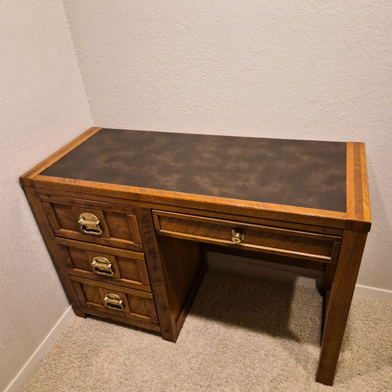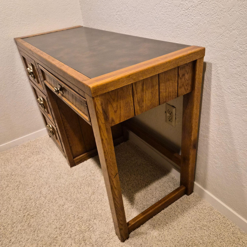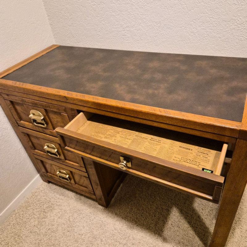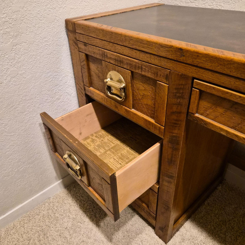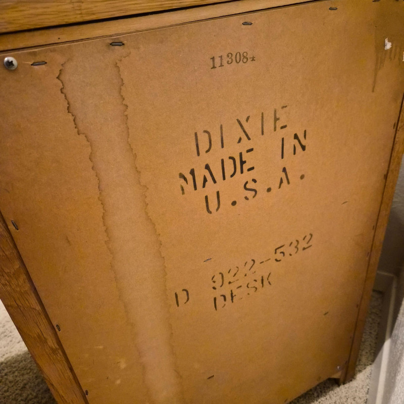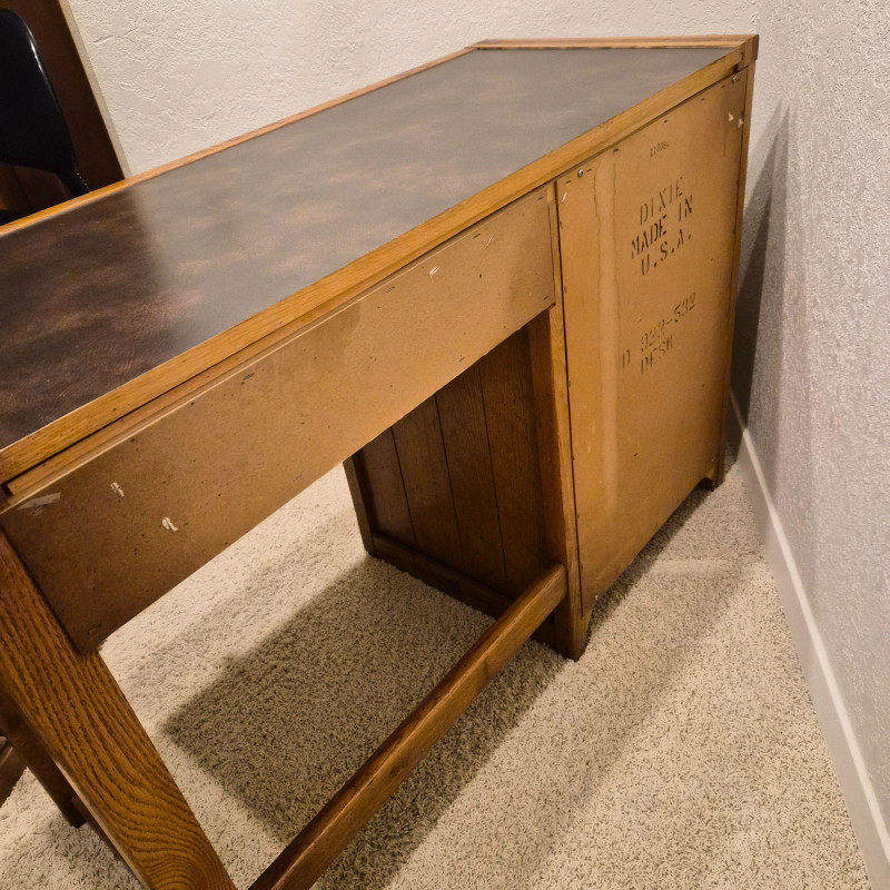 A vintage Dixie brand student desk featuring the iconic “Clipper Ship” motif—an evocative nod to mid-century Americana and nautical adventure. Crafted from solid wood with a warm finish, this desk offers sturdy construction and timeless charm. The front panel showcases a carved or printed clipper ship design, adding character to its clean lines and practical layout. Measuring 45" wide x 30" tall x 18.5" deep, it’s ideal for a home office, study nook, or collector’s display. A nostalgic piece with functional roots and decorative flair Due to its size and weight, bidding on this lot confirms agreement to bring at least two or more able-bodied individuals, an appropriate sized moving vehicle (NOTE MEASUREMENTS) and appropriate equipment (e.g., dollie, hand truck) for safe removal. Failure to comply may result in forfeiture without refund. No staff on site to assist with moving this item.