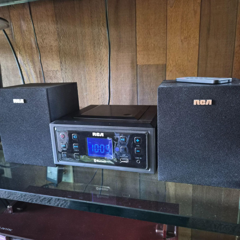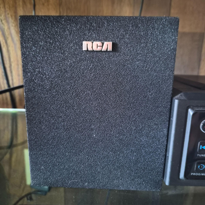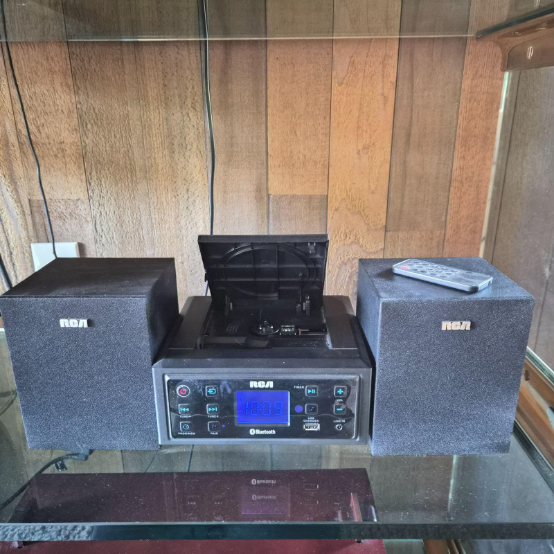 RCA Bluetooth CD player with matching speakers, perfect for small spaces and big vibes - RS2929B. The unit powers on and appears to be in working condition, offering both classic CD playback and modern Bluetooth connectivity. Whether you're spinning old favorites or streaming new jams, this compact system delivers versatile sound in a sleek footprint. Powers on and appears functional.