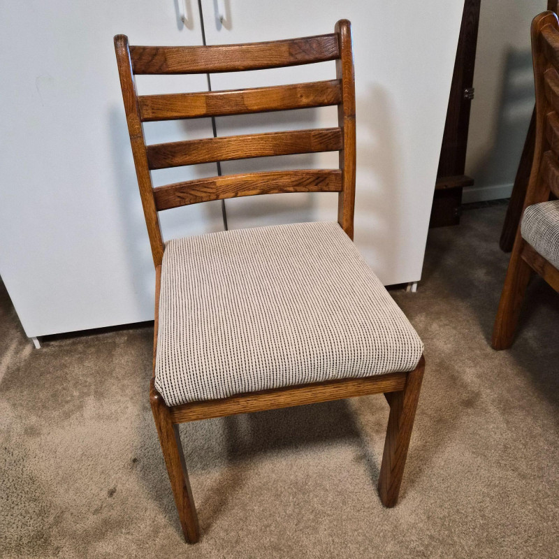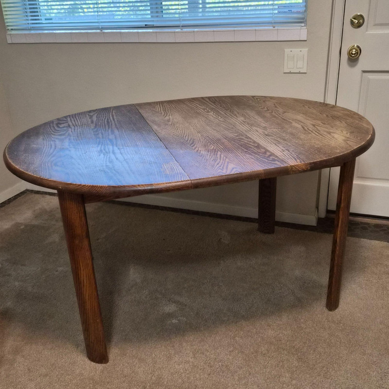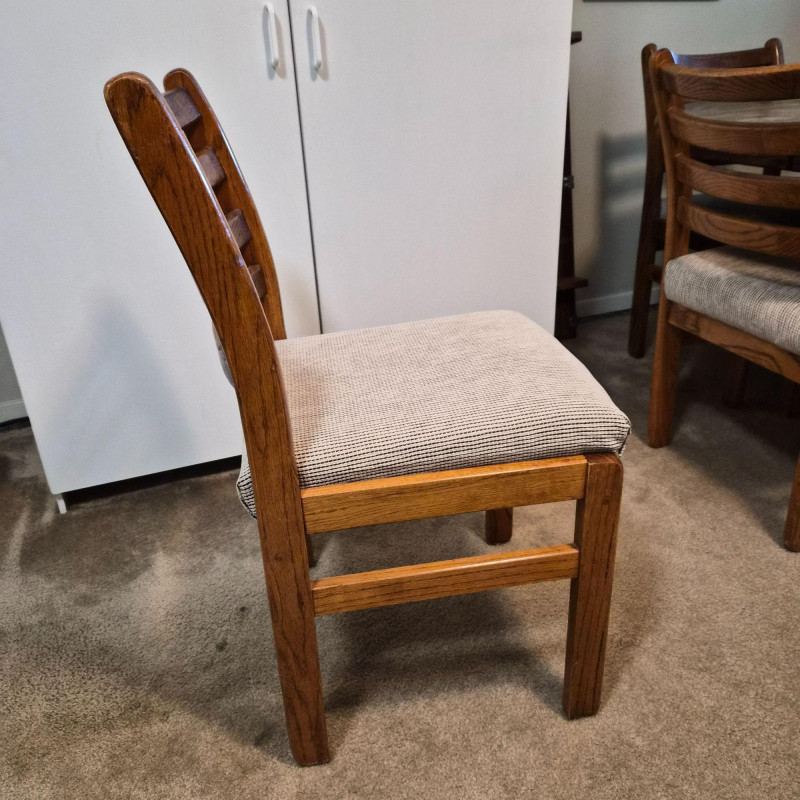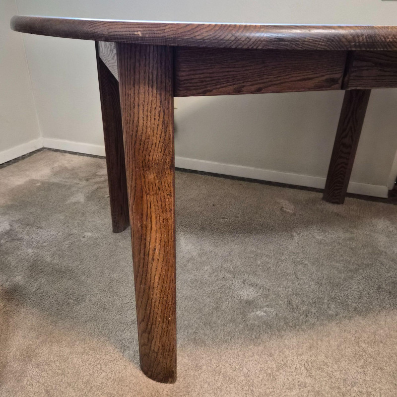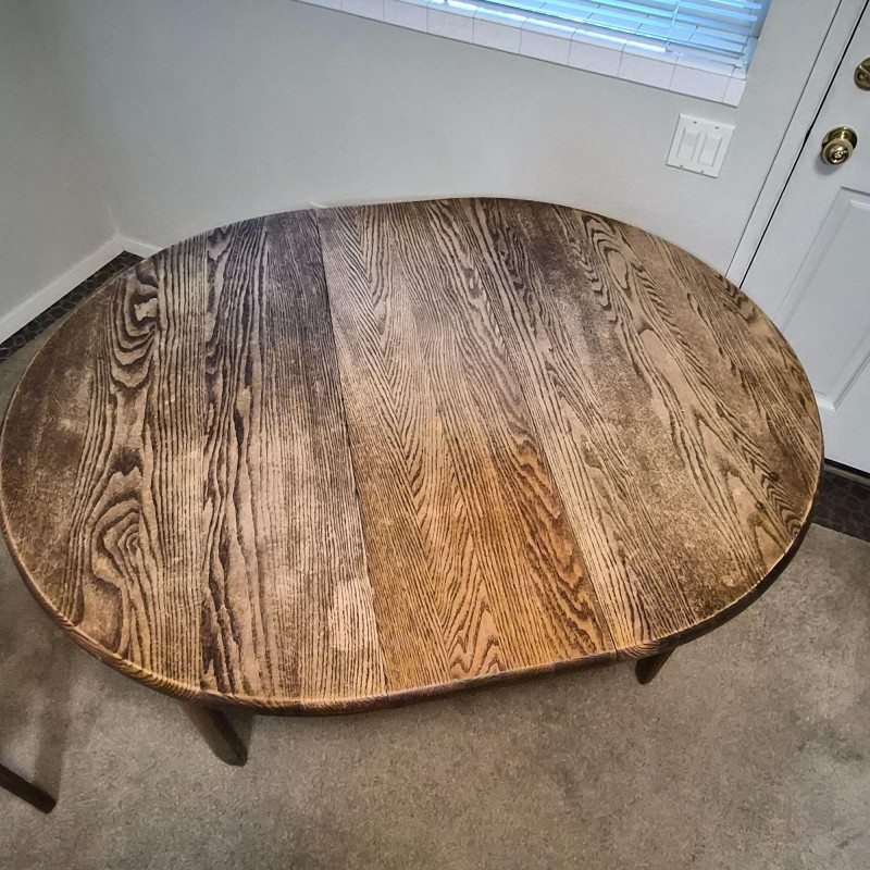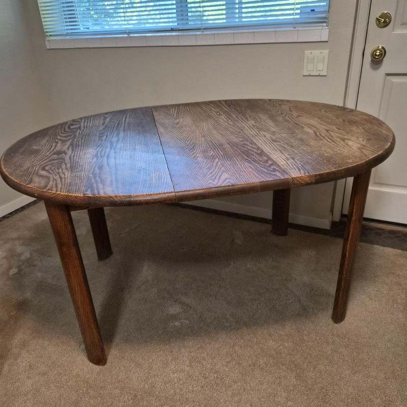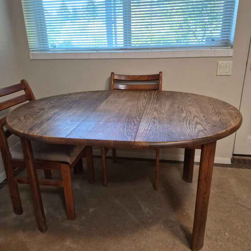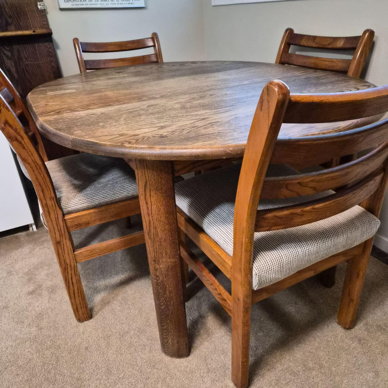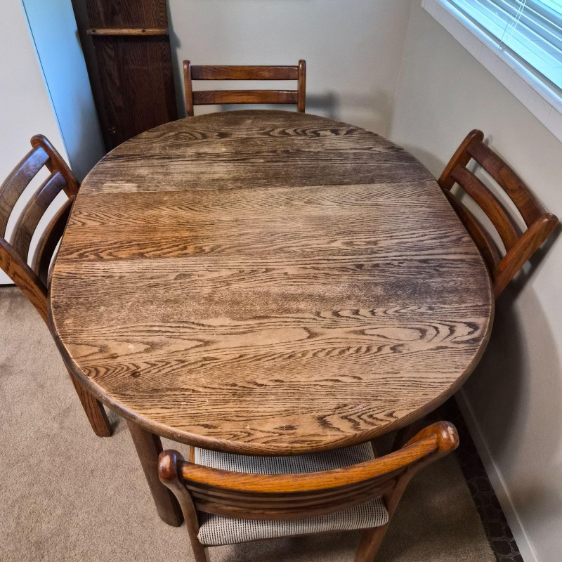 Classic oval table and four solid wood upholstered chairs. The table measures 54" long x 43" wide x 29" tall in its current setup, with an additional 12" leaf included for expanded seating. Whether you're hosting a cozy dinner or a festive gathering, this set adapts beautifully to your needs. Crafted for comfort and durability, the chairs feature upholstered seats and sturdy wood frames. The removable leaf allows for a more compact footprint and easier transport, making this set as practical as it is inviting. Due to its size and weight, bidding on this lot confirms agreement to bring at least two or more able-bodied individuals, an appropriate sized moving vehicle (NOTE MEASUREMENTS) and appropriate equipment (e.g., dollie, hand truck) for safe removal. Failure to comply may result in forfeiture without refund. No staff on site to assist with moving this item.