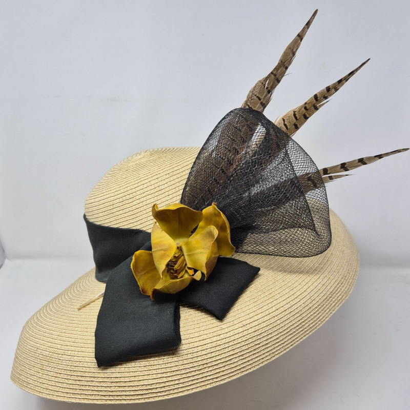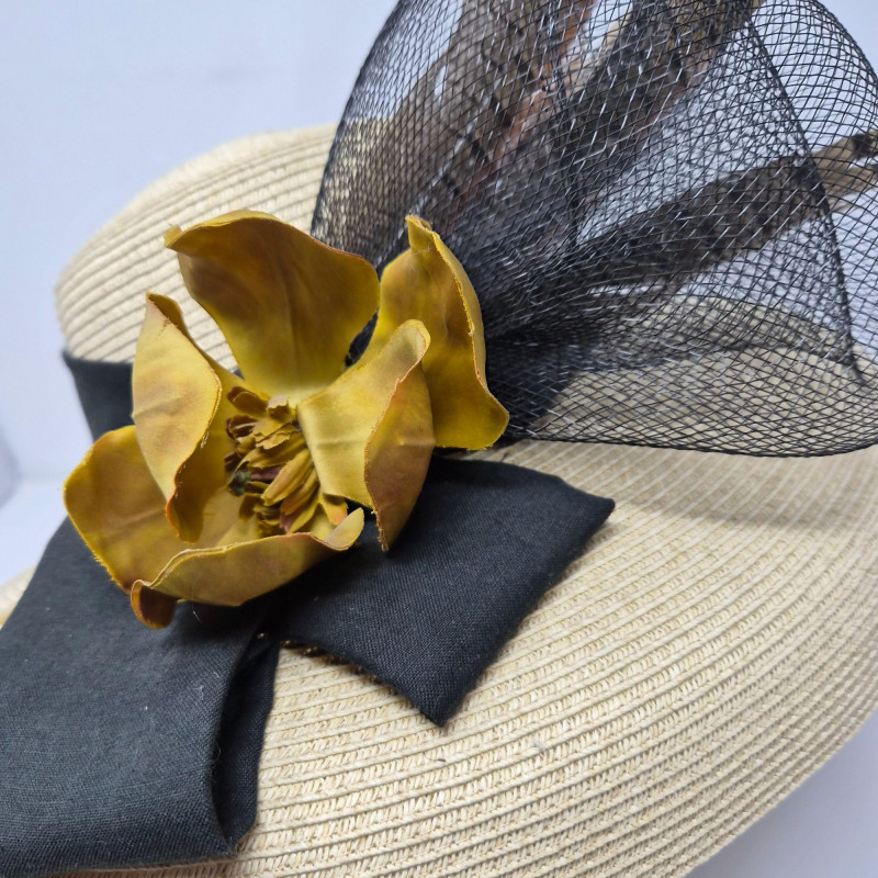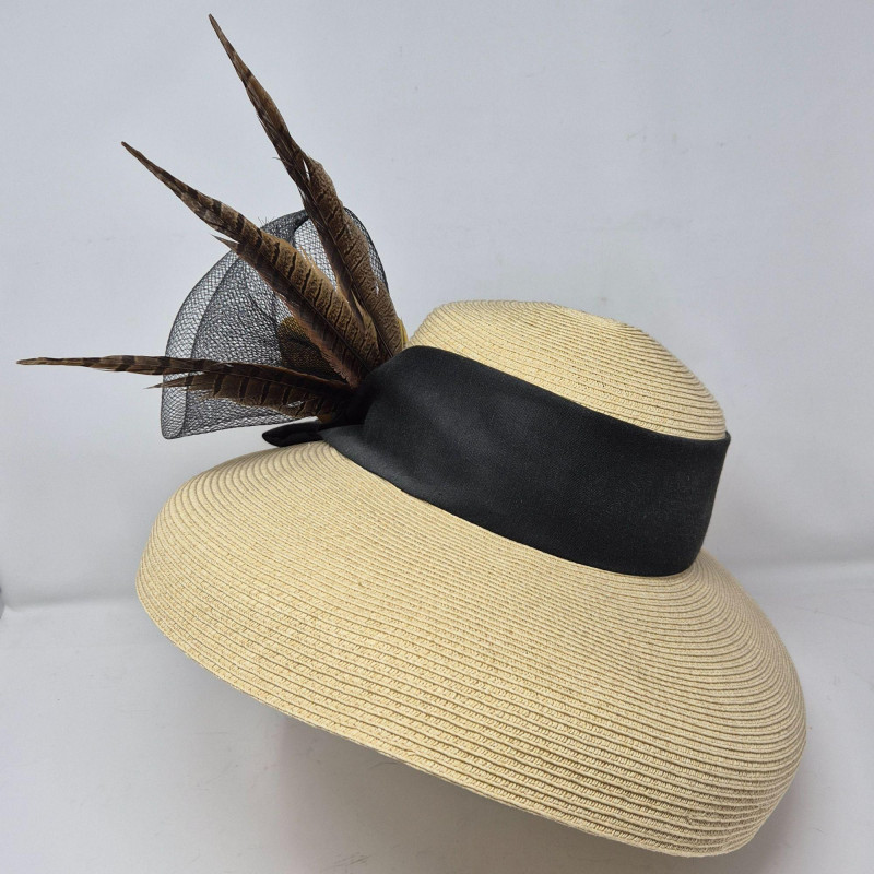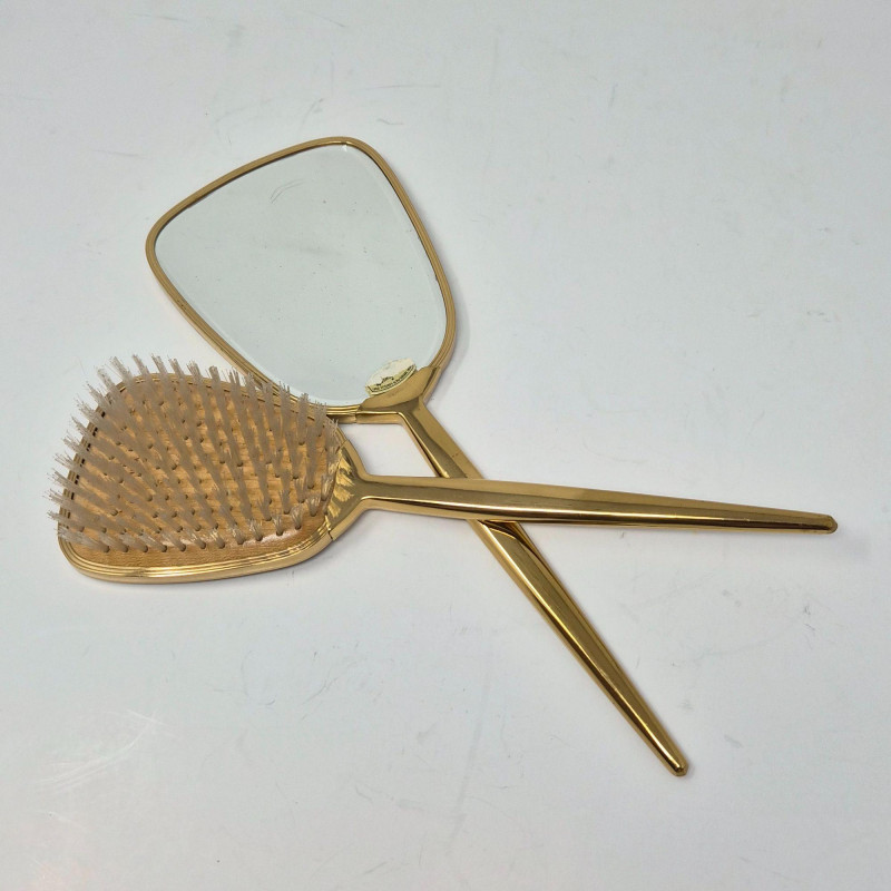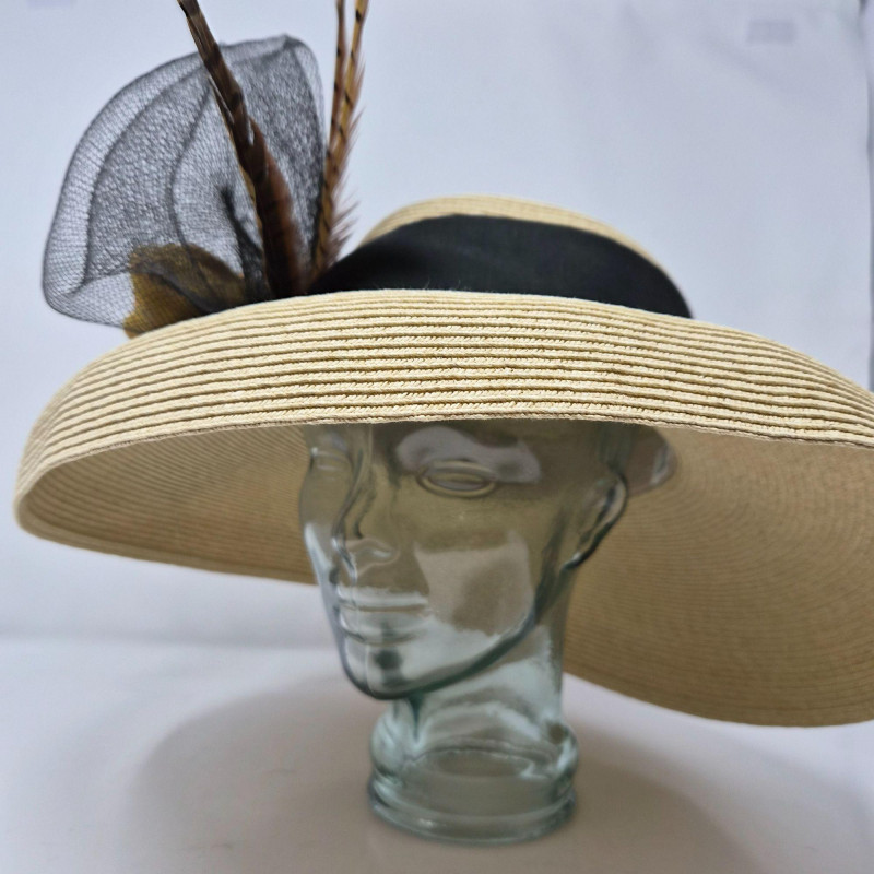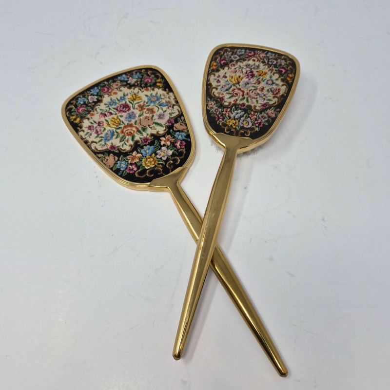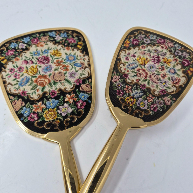 A showstopping ensemble of vintage elegance and display artistry. This oversized Kentucky Derby hat by CK Nobles is a theatrical flourish of batting, sweeping feathers, flower and ribbon—designed to dazzle from every angle. It rests atop a striking green glass mannequin head, tinted with a subtle emerald hue that adds depth and drama to any vanity or boutique display. Completing the vignette is a gold-tone petit point vanity brush and hand mirror, each delicately embroidered and steeped in mid-century charm. Together, these pieces evoke the glamour of bygone dressing rooms and Southern pageantry.