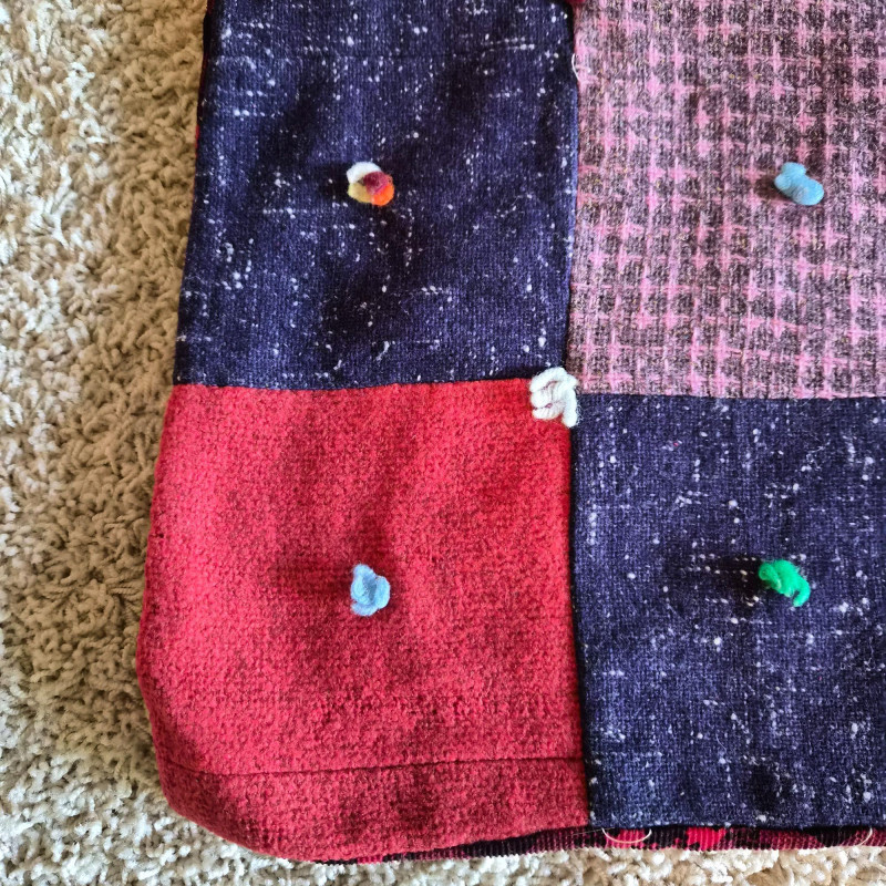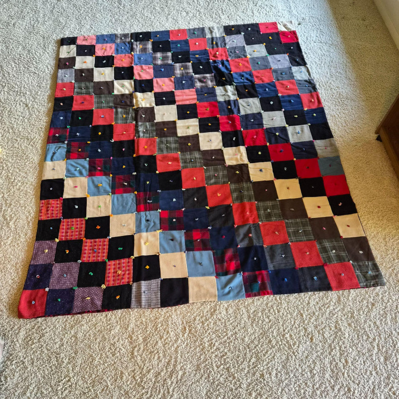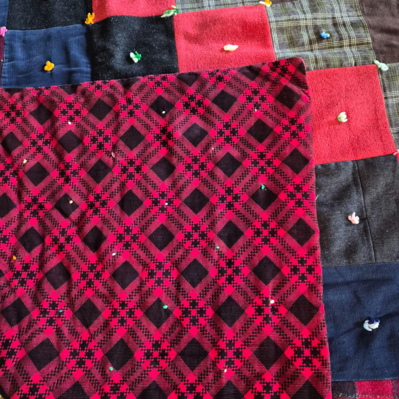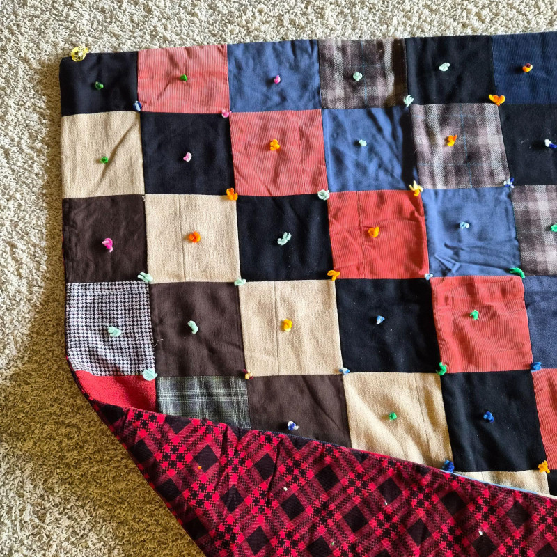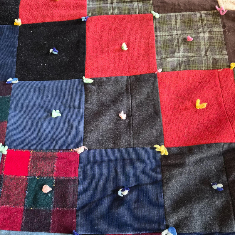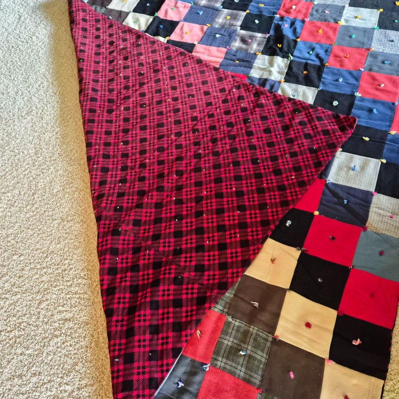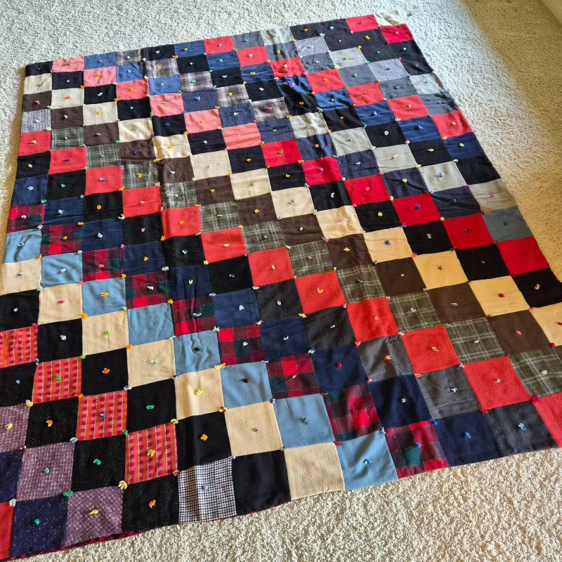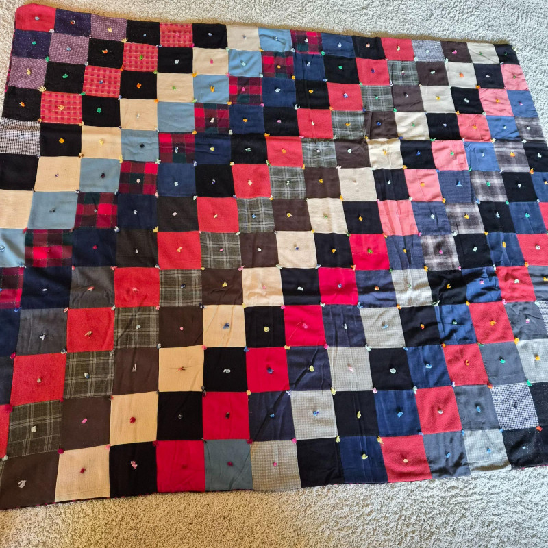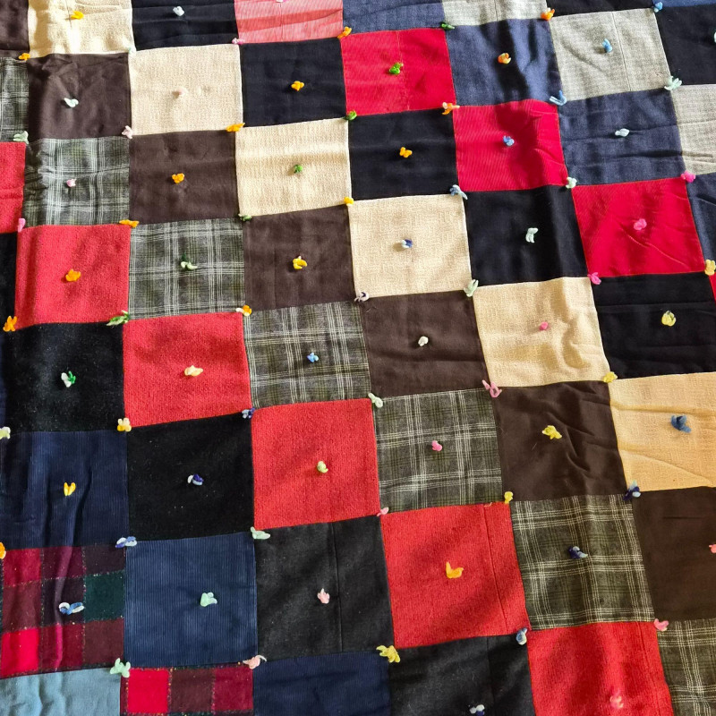 A richly hued vintage quilt, handmade with alternating squares in deep, saturated tones that evoke warmth and tradition. Backed in bold red and black plaid for a striking contrast. Measures 76" x 53". A couple of small holes are present—repairable and subtle, they don’t detract from the quilt’s charm or display appeal. A soulful textile perfect for cozy layering, wall display, or heirloom collecting.