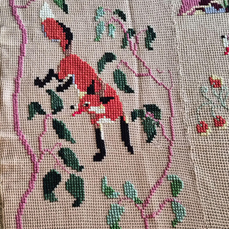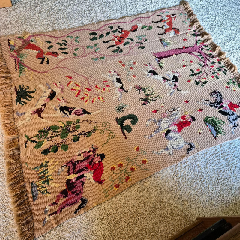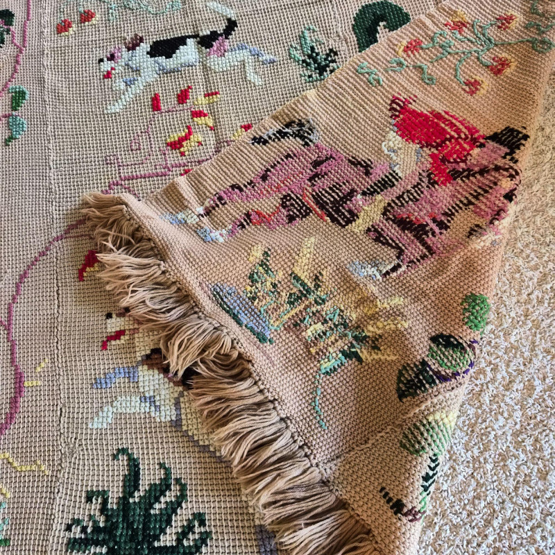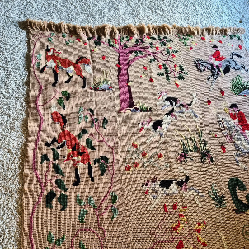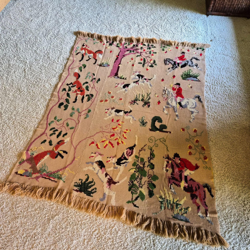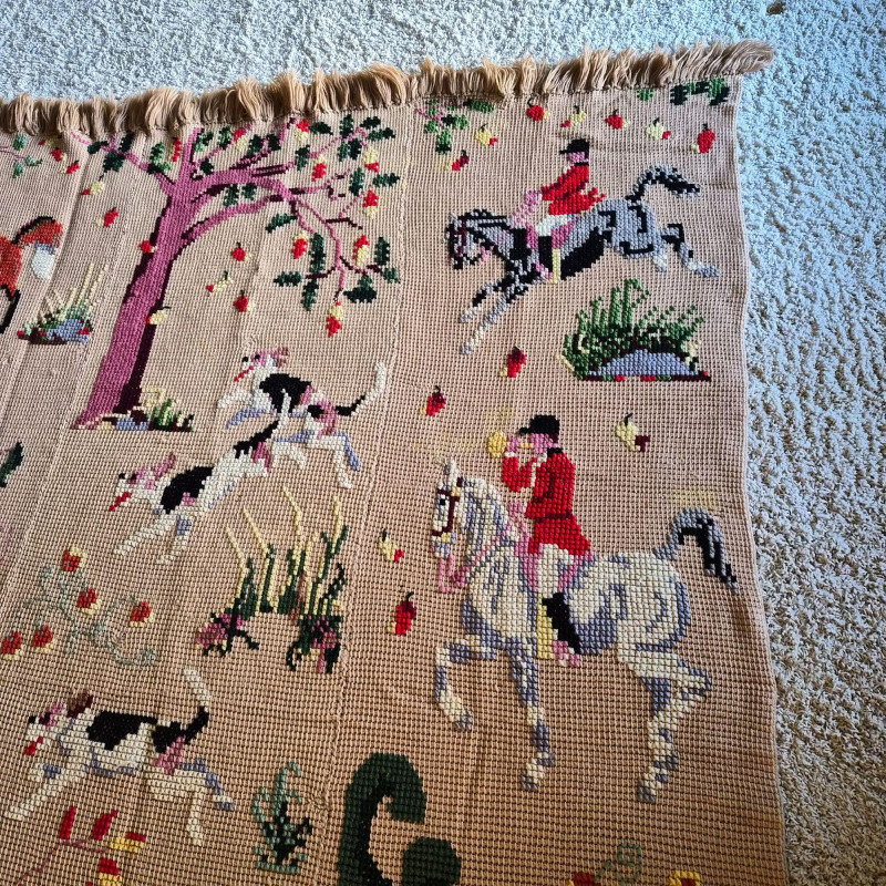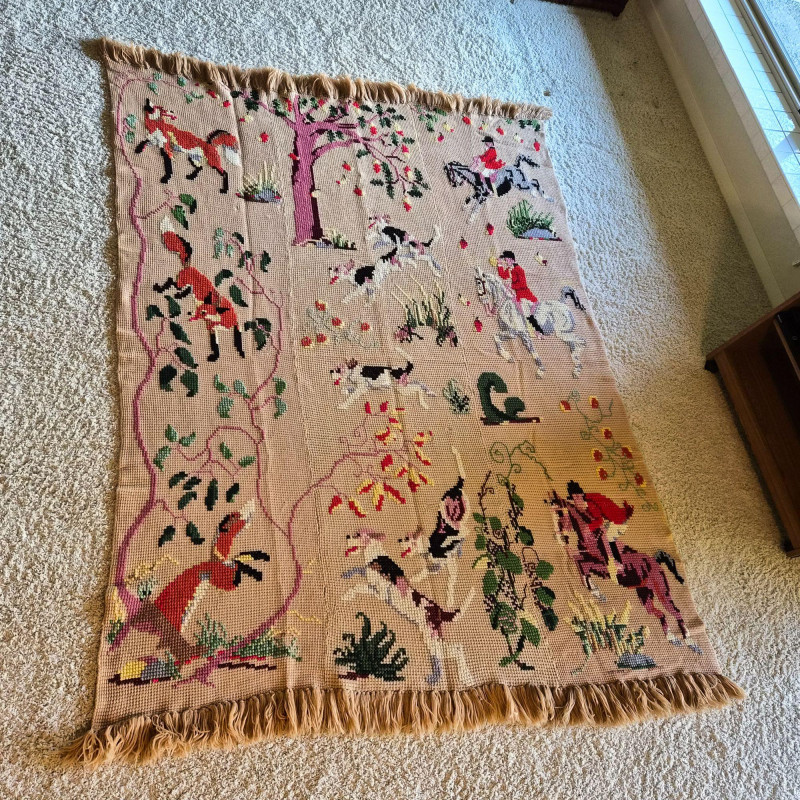 Step into the countryside with this vintage hand-knitted wool blanket, featuring a charming, embroidered English fox hunt scene. Crafted in the style of a traditional Afghan throw, it showcases riders, hounds, and rustic landscape details—all rendered in warm tan background, textured stitches that evoke storybook nostalgia.