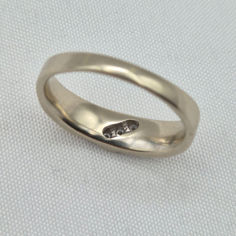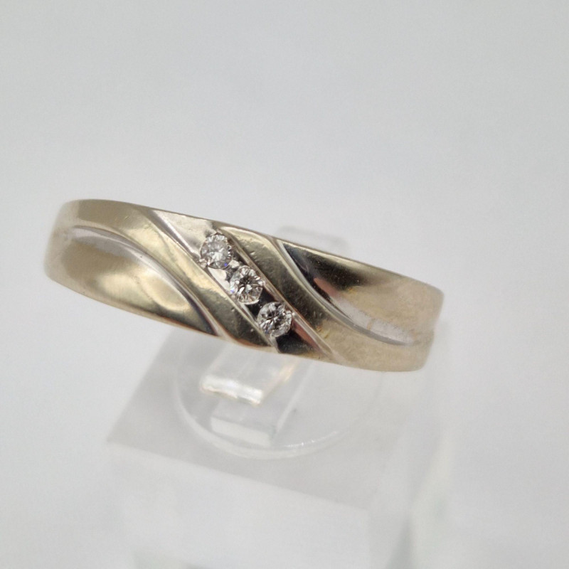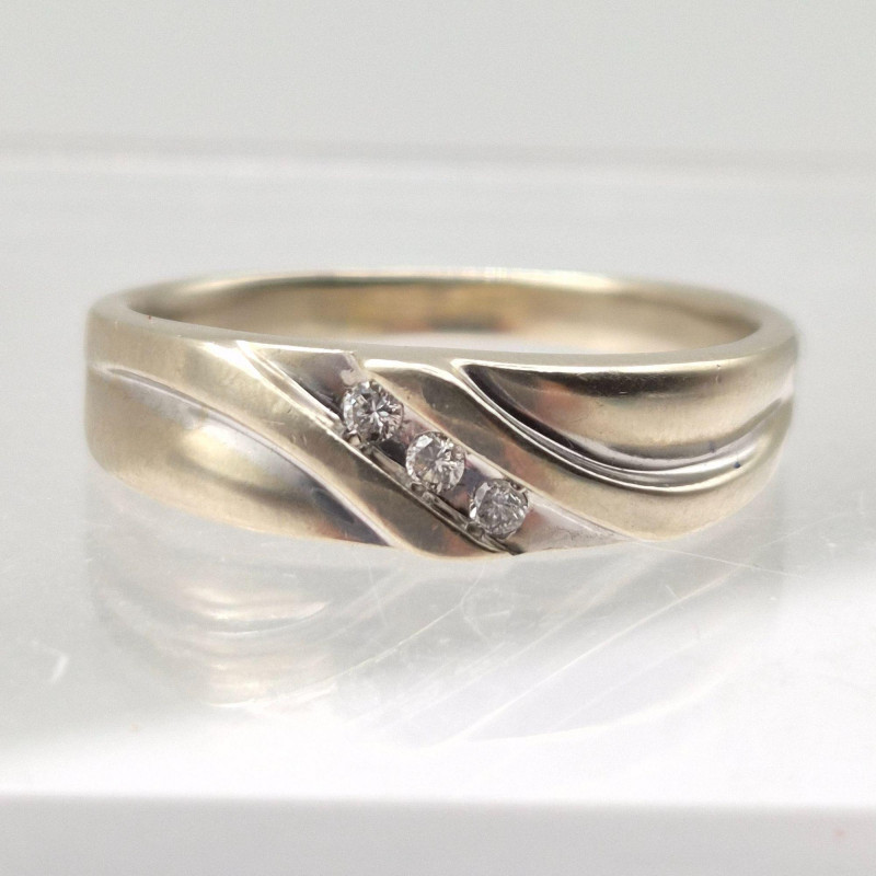 A bold and elegant, quality of craftsmanship and timeless appeal, 10k white gold wedding band featuring a graceful swirl motif and three channel-set round cut genuine diamonds. This substantial ring is a rare find in a larger size (approx. 14).