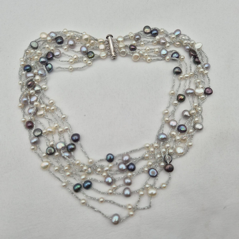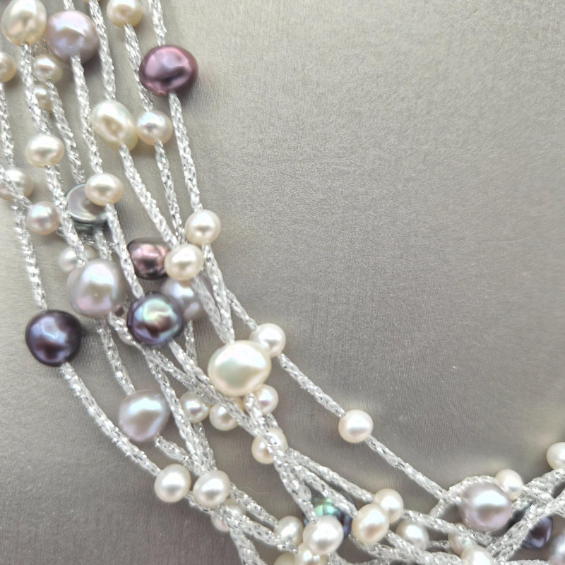 A luminous statement piece, this genuine pearl necklace features a sophisticated multi-strand design with layered dimension and graceful movement. Three primary strands are each intricately strung on an additional trio of strands, creating a cascading effect that flatters the neckline. This necklace evokes timeless femininity and quiet luxury—ideal for collectors, stylists, or anyone drawn to the romance of real pearls.