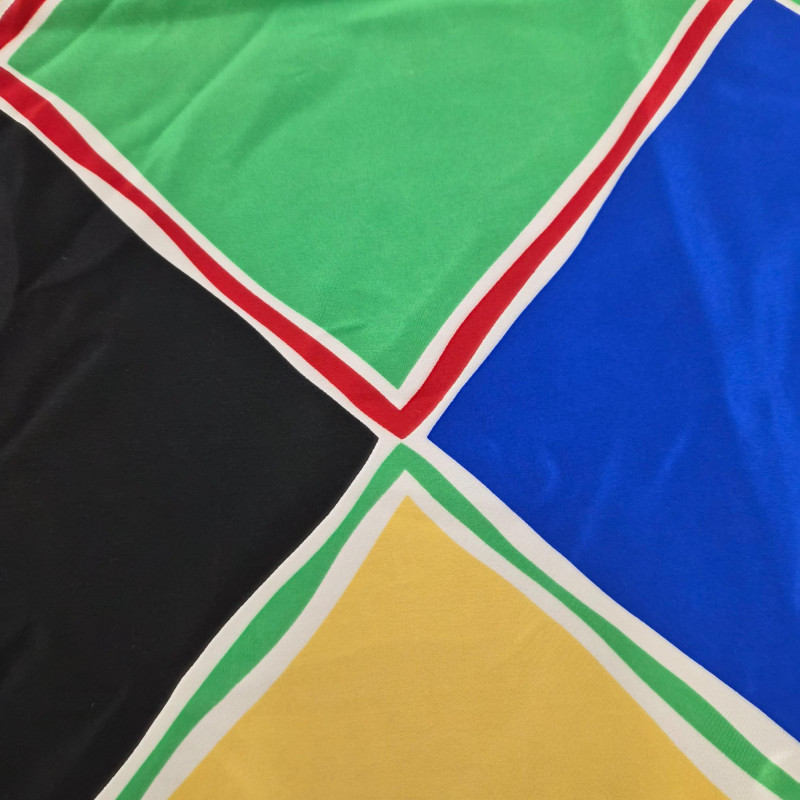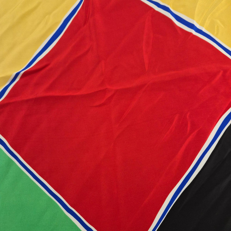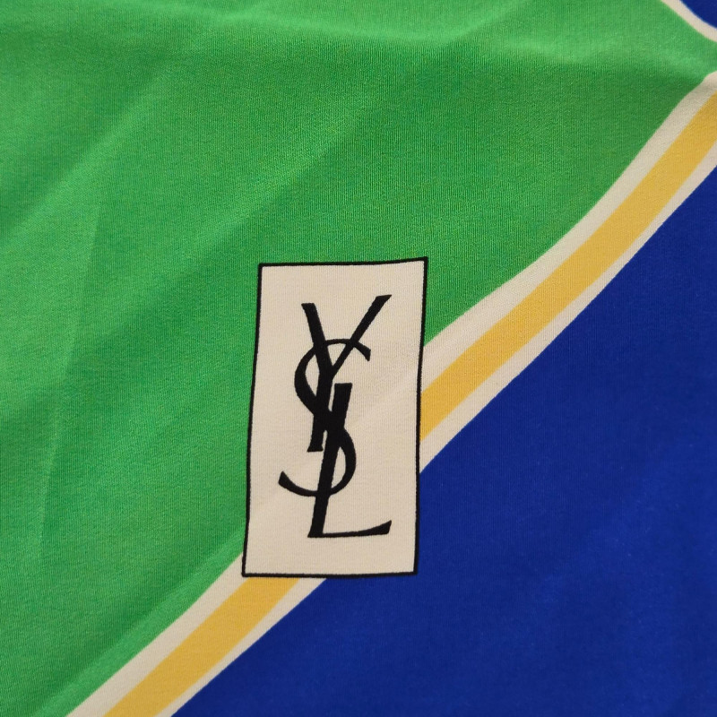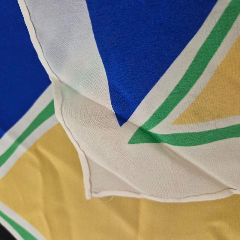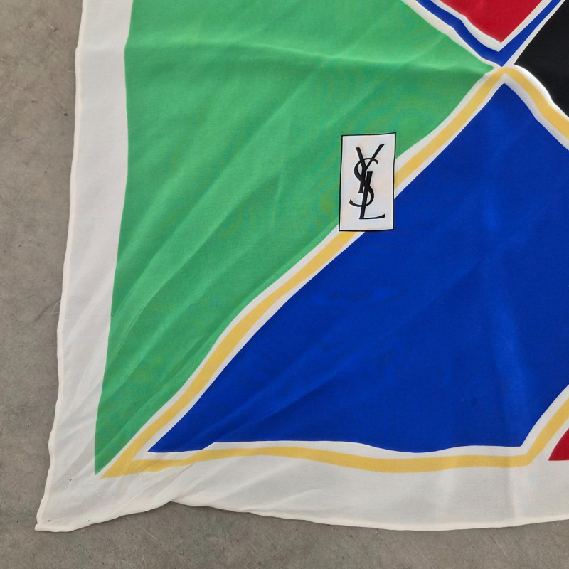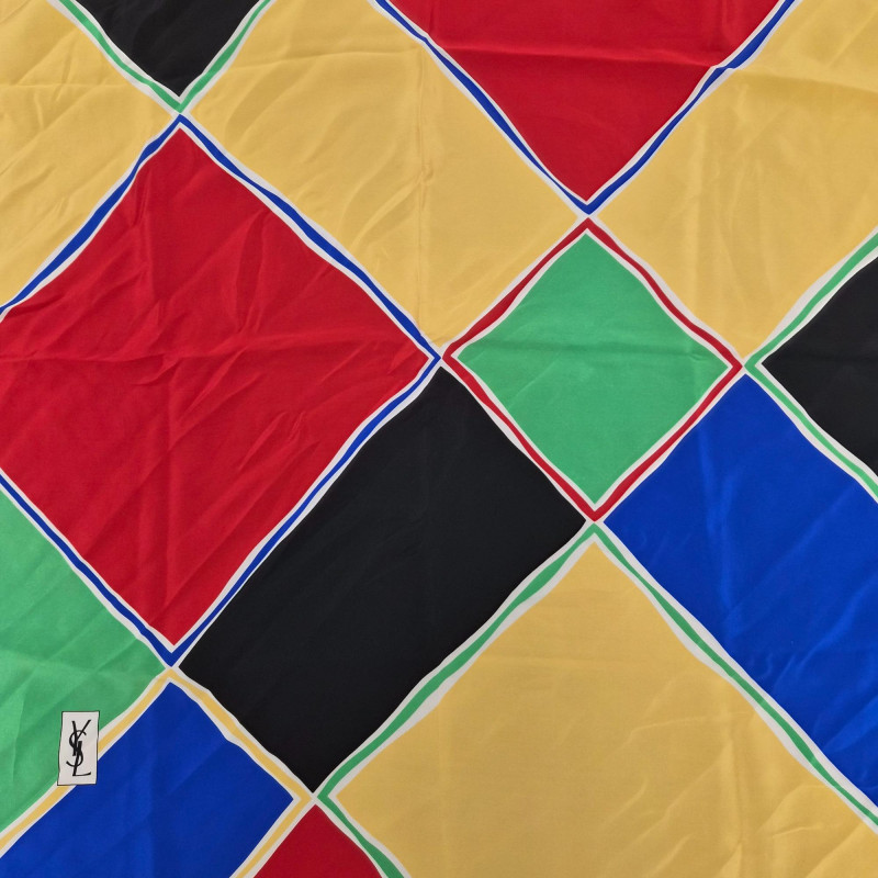 A vibrant vintage silk scarf by Yves Saint Laurent (YSL), showcasing a bold geometric color-block design that captures the spirit of mid-century modern fashion. The luxurious silk fabric offers a soft drape and luminous sheen, perfect for styling as a neck scarf, hair wrap, or handbag accent. A timeless accessory for collectors, fashion lovers, or anyone drawn to the elegance of vintage designer textiles.
