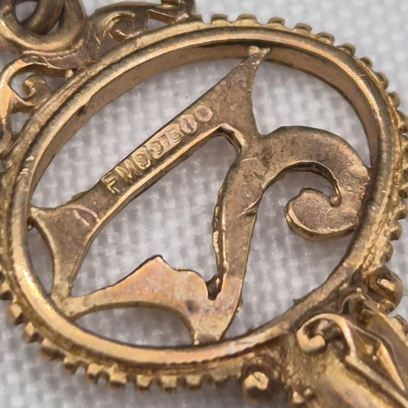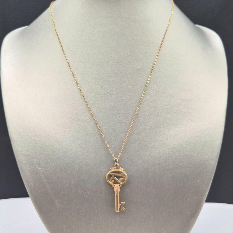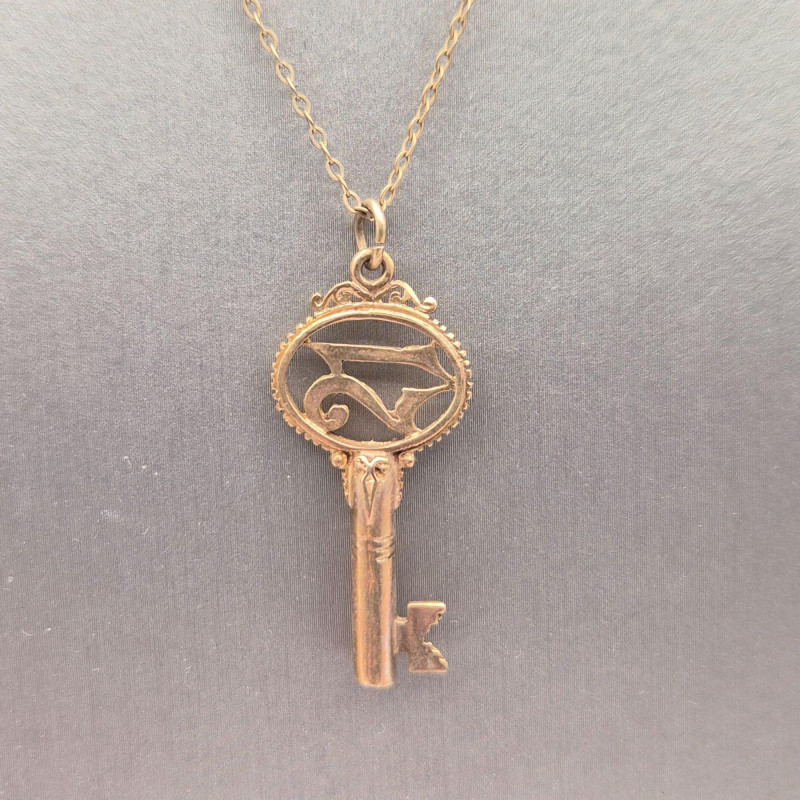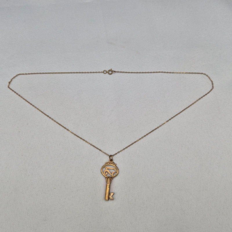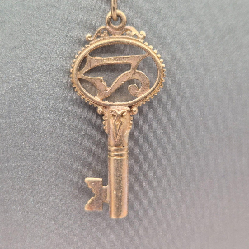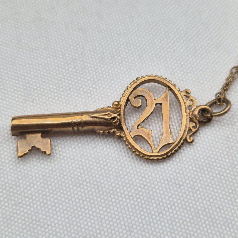 Celebrate a timeless rite of passage with this vintage 9ct gold “21-Key” necklace, a classic emblem of coming-of-age and cherished independence. The pendant, measuring 1.5" x 0.5", features a slender, elegant key rendered in warm yellow gold—subtle yet symbolic. Suspended from a 17" gold chain, the necklace weighs 3.6 grams and offers a graceful drape and refined presence. Both chain and pendant are stamped. Whether gifted for a milestone birthday or worn as a personal talisman, this piece carries both sentimental weight and vintage allure. A lovely addition to any jewelry collection, especially for those drawn to meaningful motifs and understated elegance.