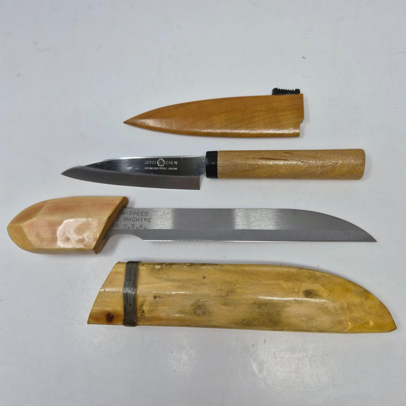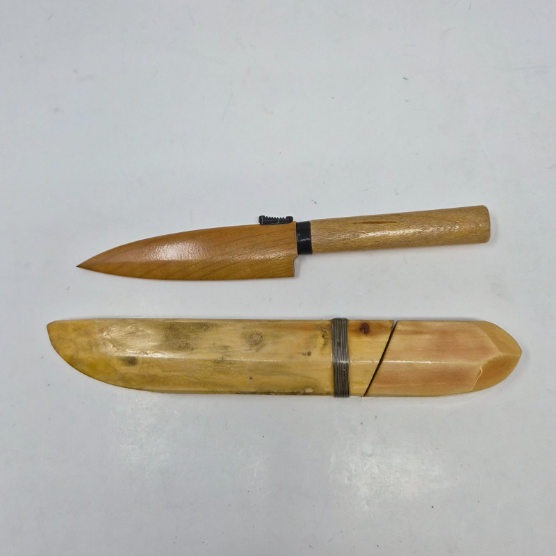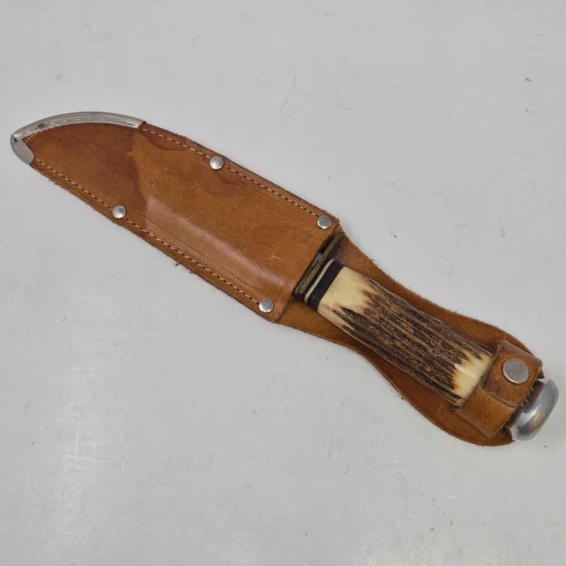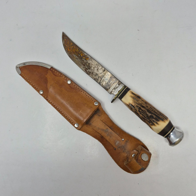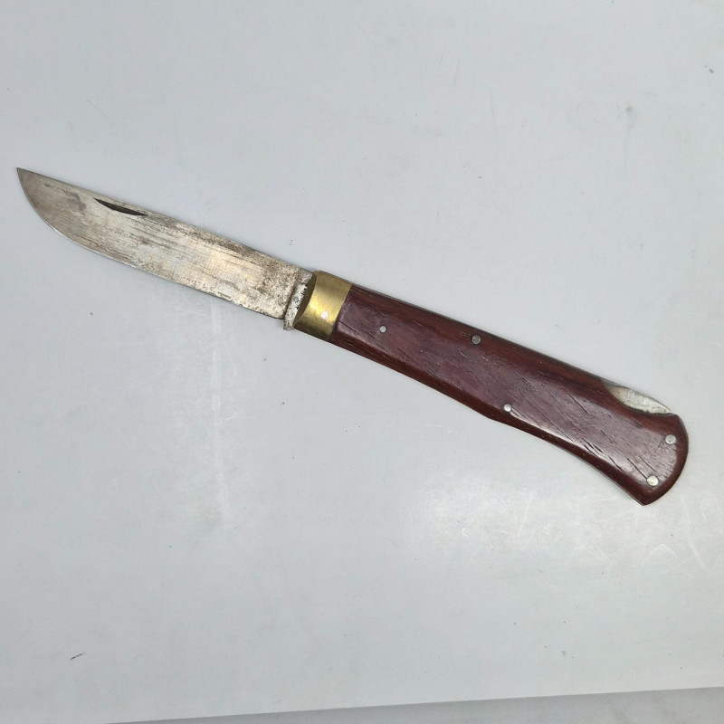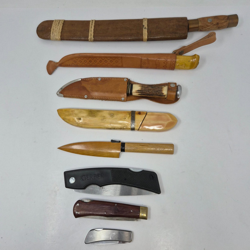 A diverse and collectible set of eight folding and sheath knives, each with distinctive craftsmanship and character. This lot includes: From bone and wood to plastic and leather, this set spans materials and makers, ideal for collectors, outdoors enthusiasts, or those seeking vintage utility tools with personality. All pieces show signs of use and age, adding to their authenticity and charm.