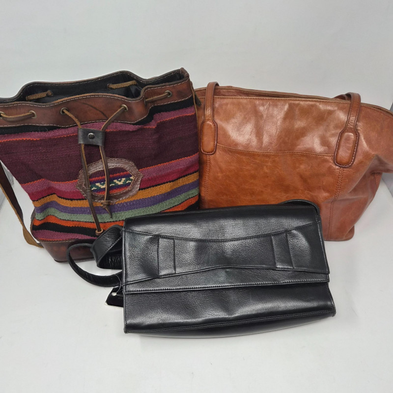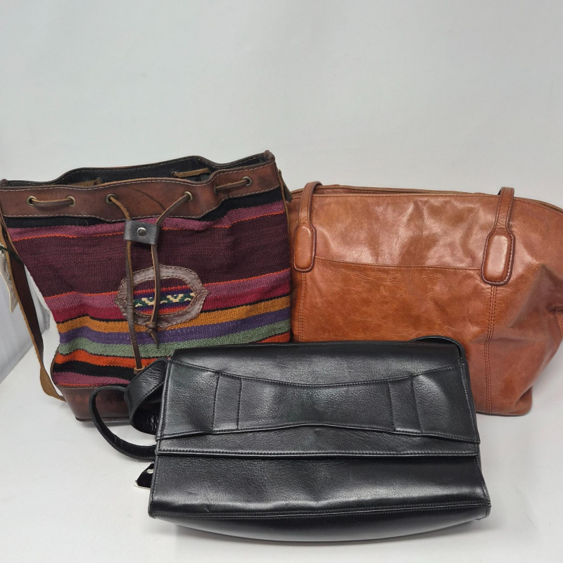 A stylish and eclectic trio of handbags blending artisan detail, global textures, and everyday functionality. Each piece offers its own unique charm: This lot highlights texture, tone, and artisan craftsmanship—from American boho to South American heritage.