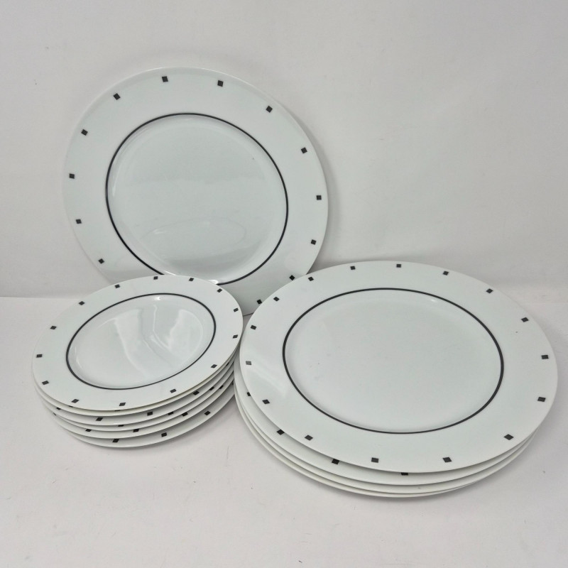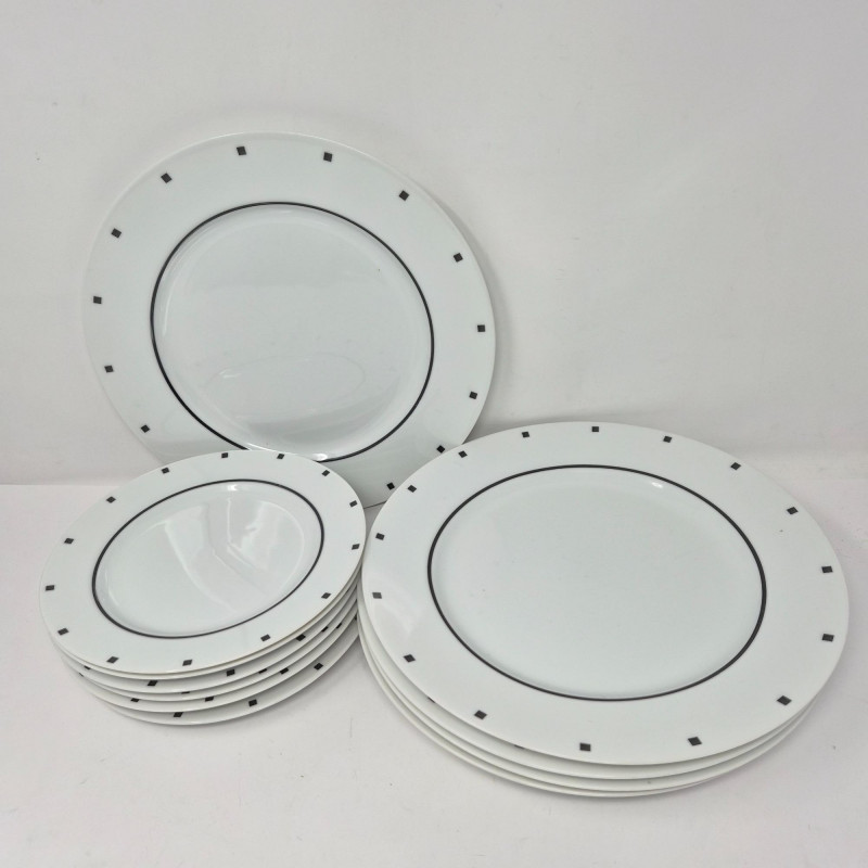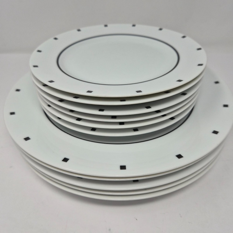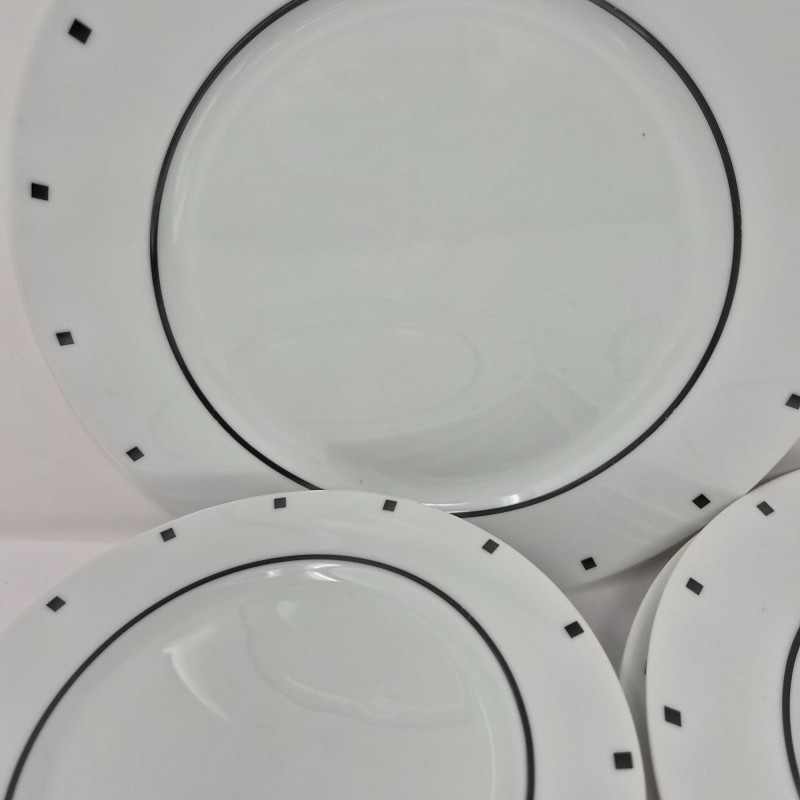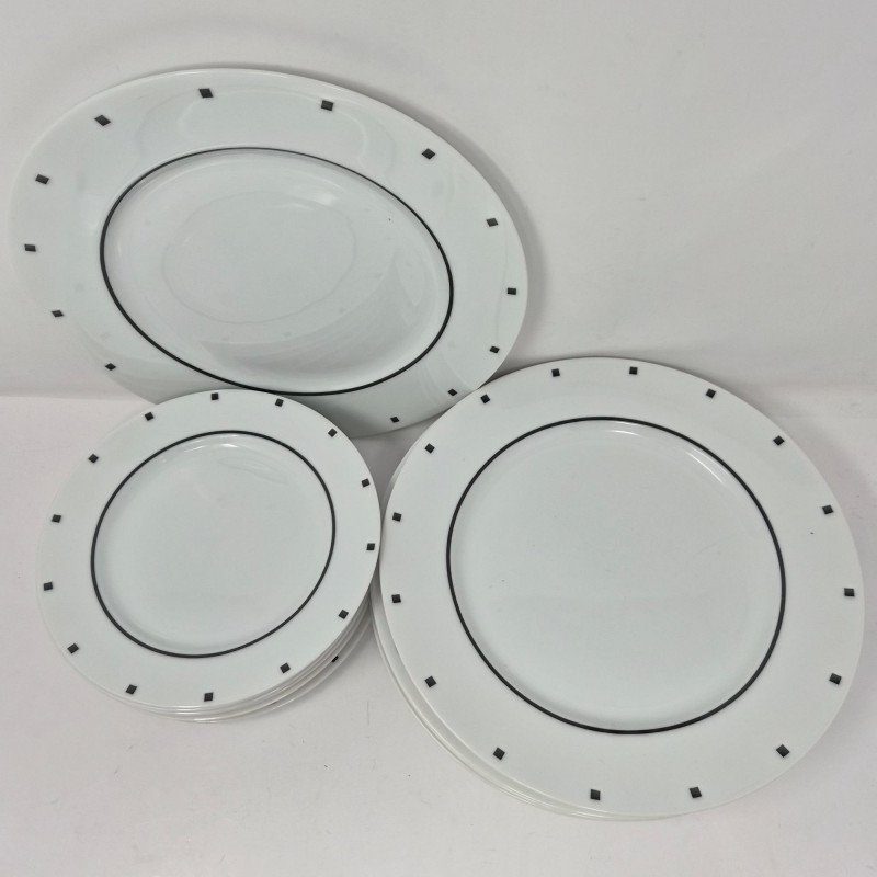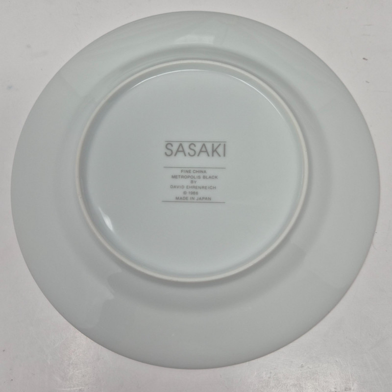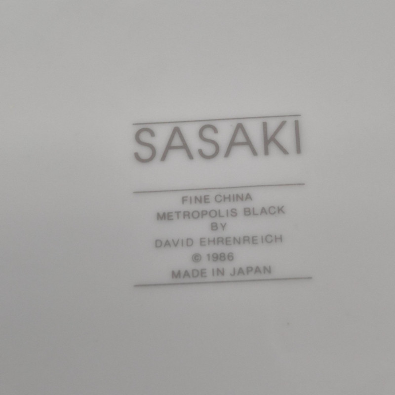 A striking set of Sasaki Metropolis Black dinnerware designed by David Ehrenreich, known for its minimalist lines and dramatic matte finish. This modernist collection includes: With its sculptural silhouette, deep black geometric trim and white glaze, this set offers timeless sophistication for contemporary tablescapes. Ideal for collectors of postmodern design or anyone seeking bold, functional art for the table.