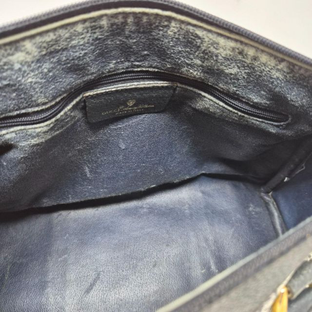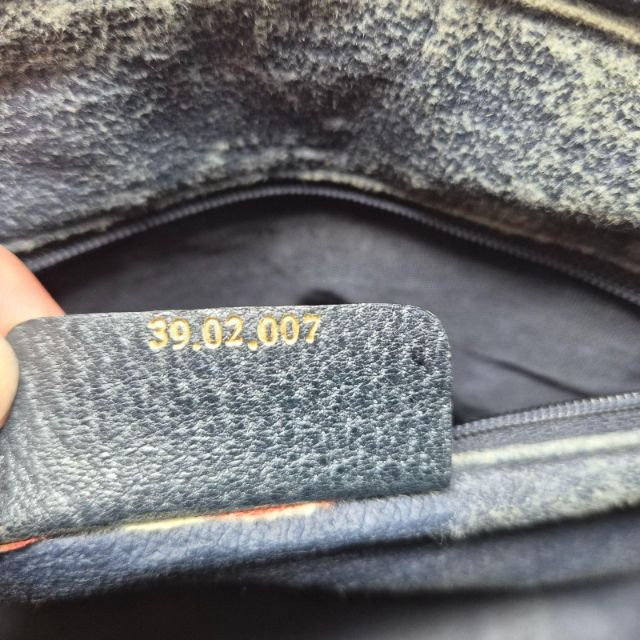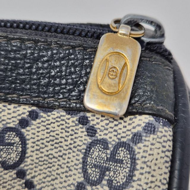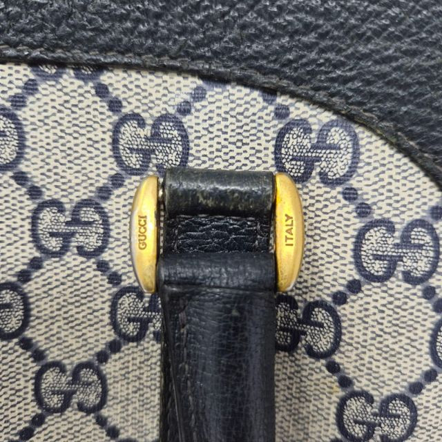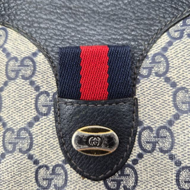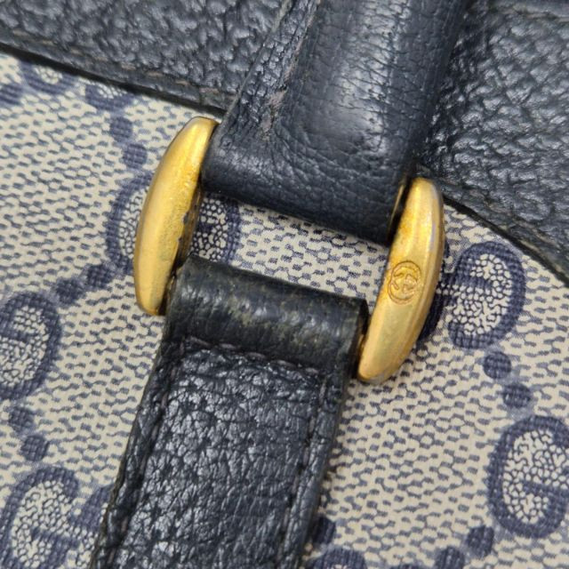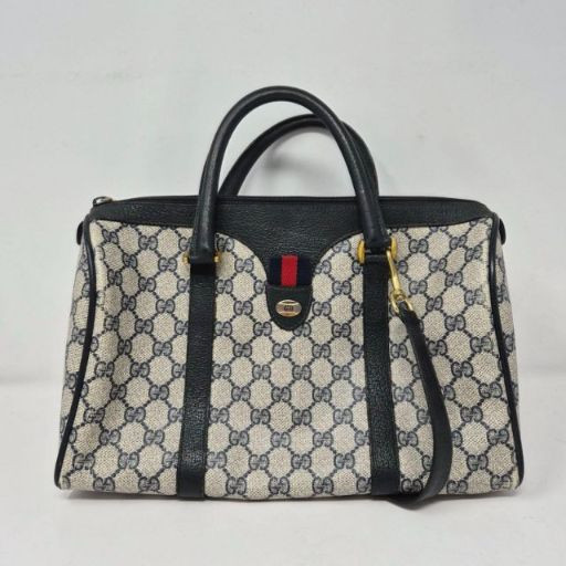 A timeless piece from Gucci’s iconic accessory line, this structured handbag features the classic double GG monogram in a sophisticated grey and navy palette. Crafted in Italy and stamped with number 39.02.007, it showcases dark navy blue leather trim, gold-tone hardware, and Gucci’s signature red and navy web stripe above the front clasp. It includes a long detachable strap to convert from handbag to shoulder bag. This bag shows visible wear from use, including surface scuffing but it's structural integrity still remains: a well-crafted, high-quality piece with years of life left. A true testament to Gucci’s enduring design and craftsmanship.