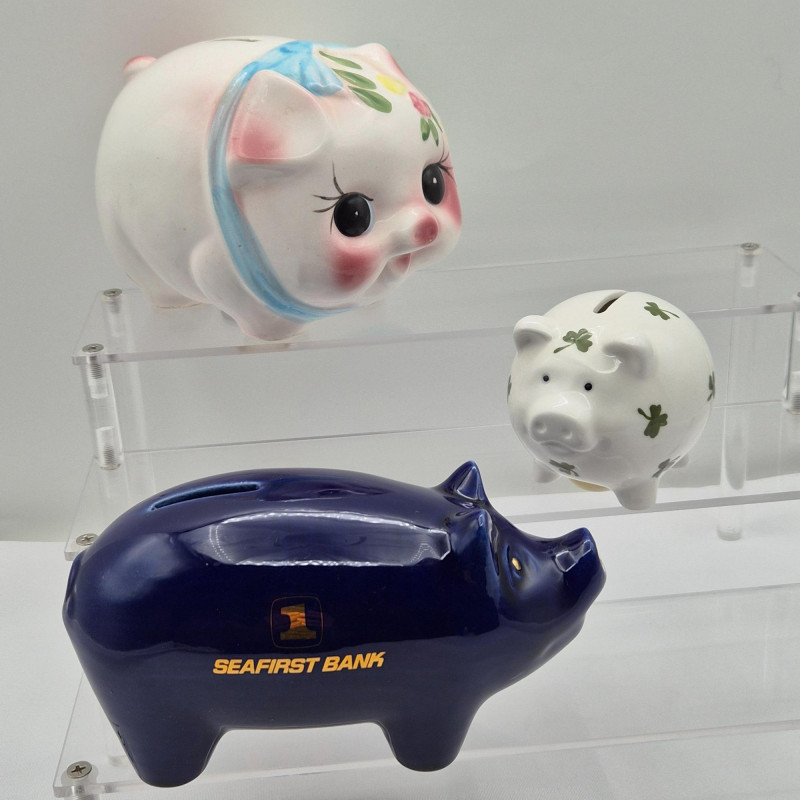 A delightful trio of vintage piggy banks, each with its own personality and charm. All feature well-fitting stoppers and are ready for display or coin-saving fun: Perfect for collectors of vintage ceramics, bank memorabilia, or whimsical décor