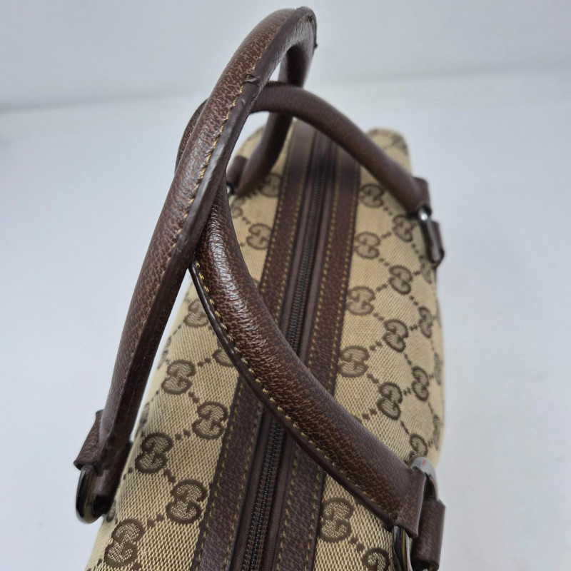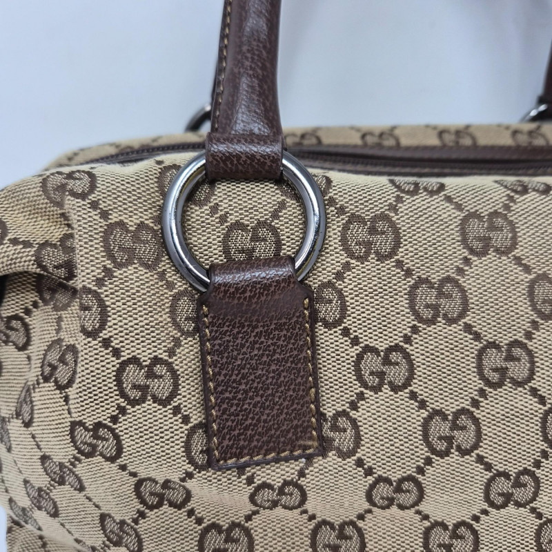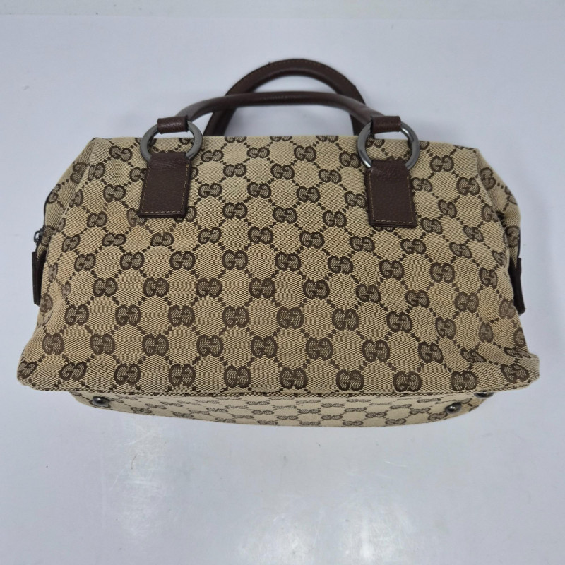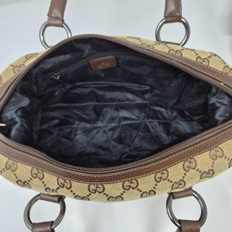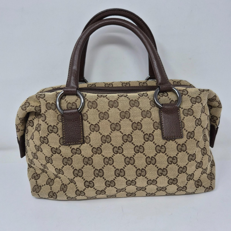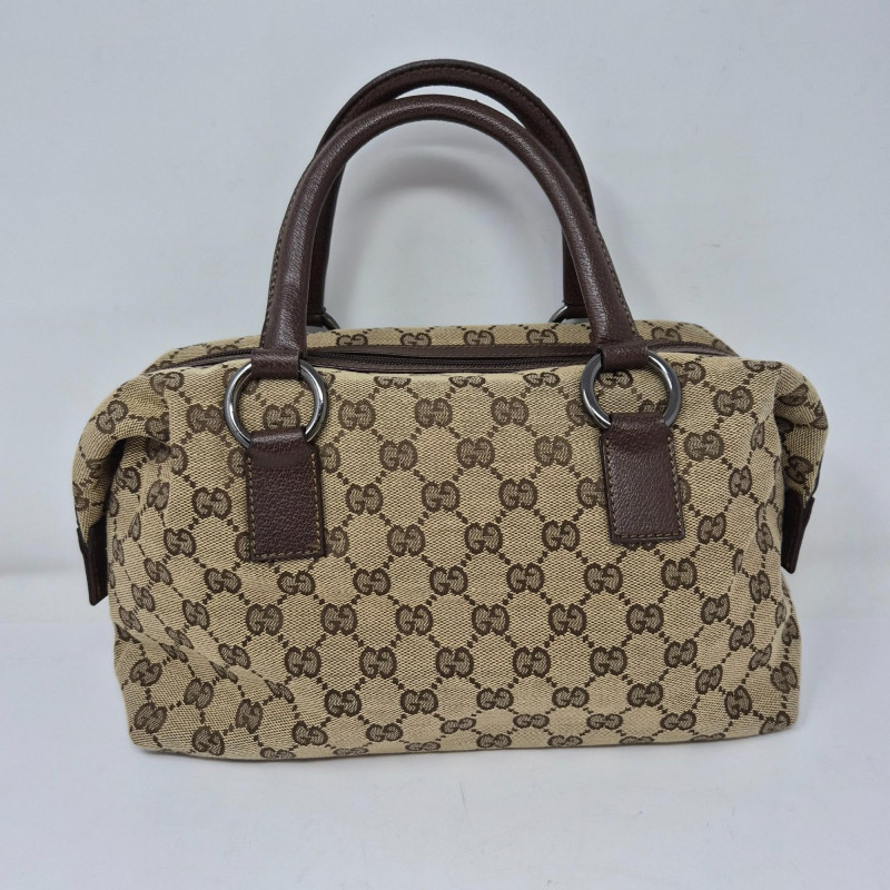A chic and structured designer-style handbag featuring the iconic GG monogram pattern in beige and brown canvas, accented with dark brown leather handles and silver-tone hardware.