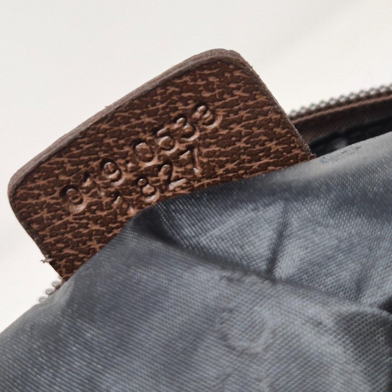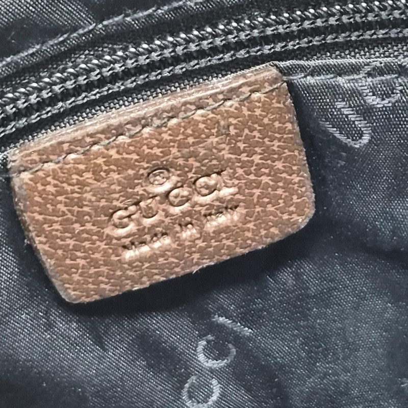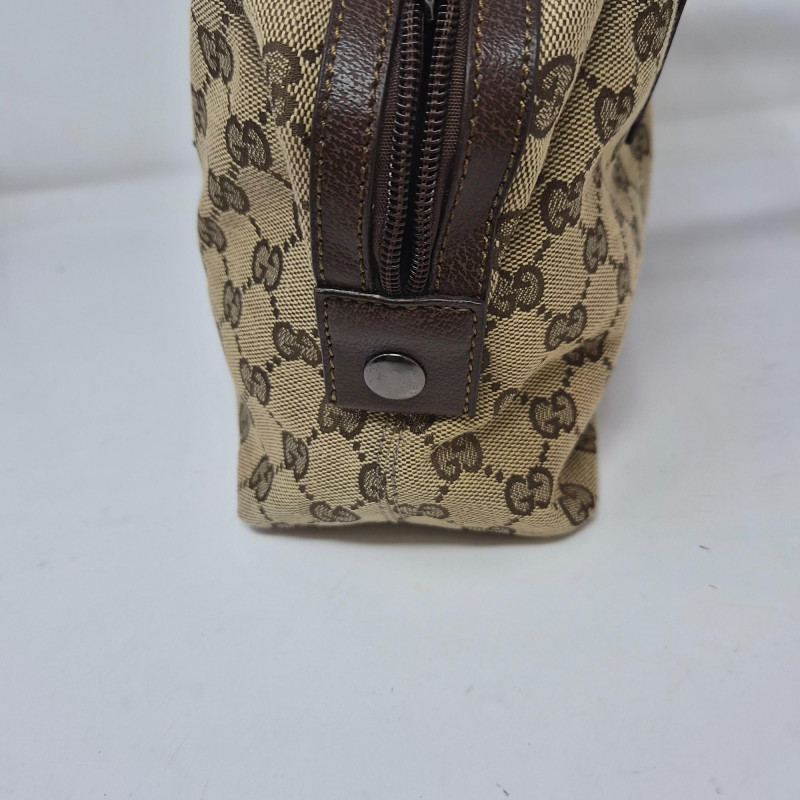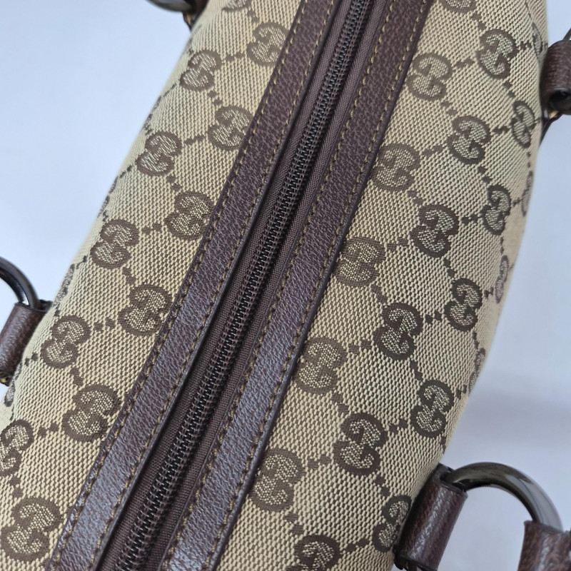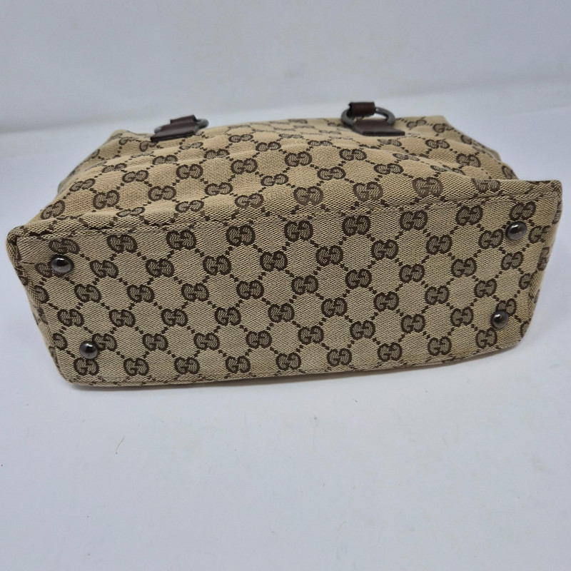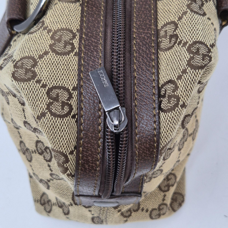 A chic and structured designer-style handbag featuring the iconic GG monogram pattern in beige and brown canvas, accented with dark brown leather handles and silver-tone hardware.
