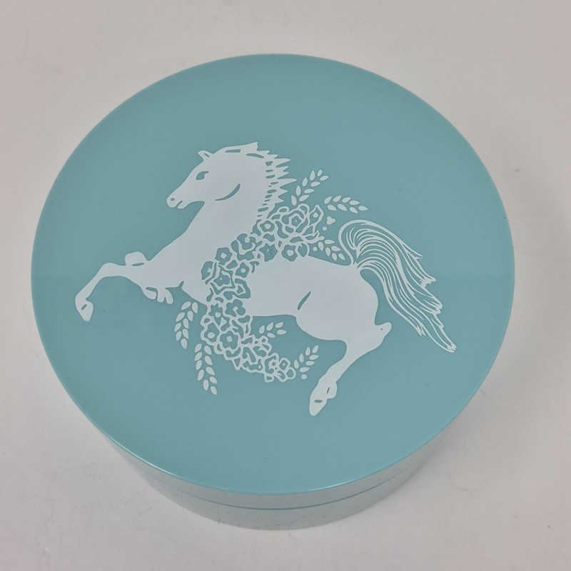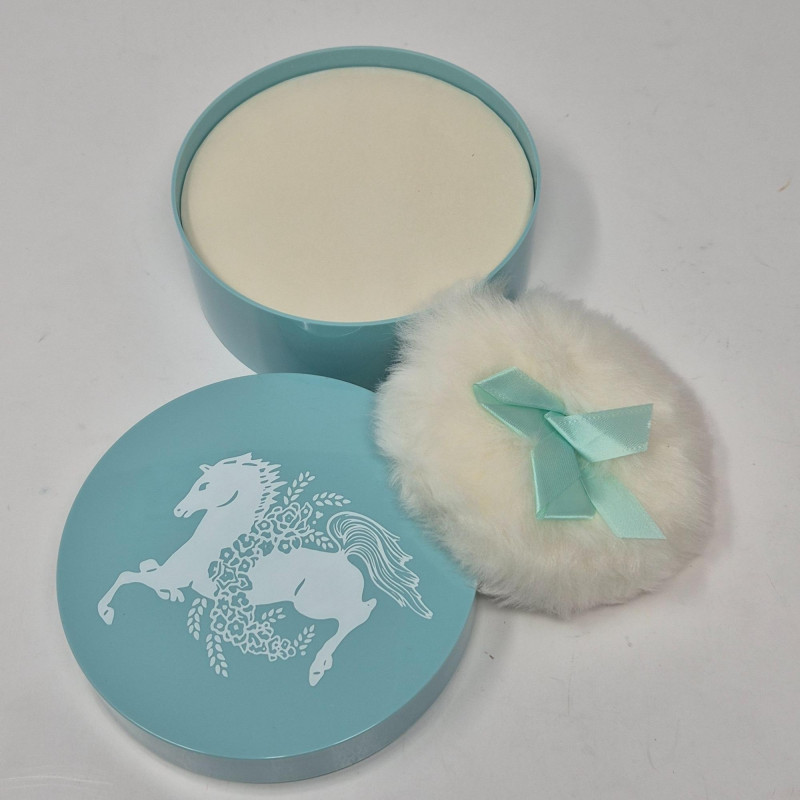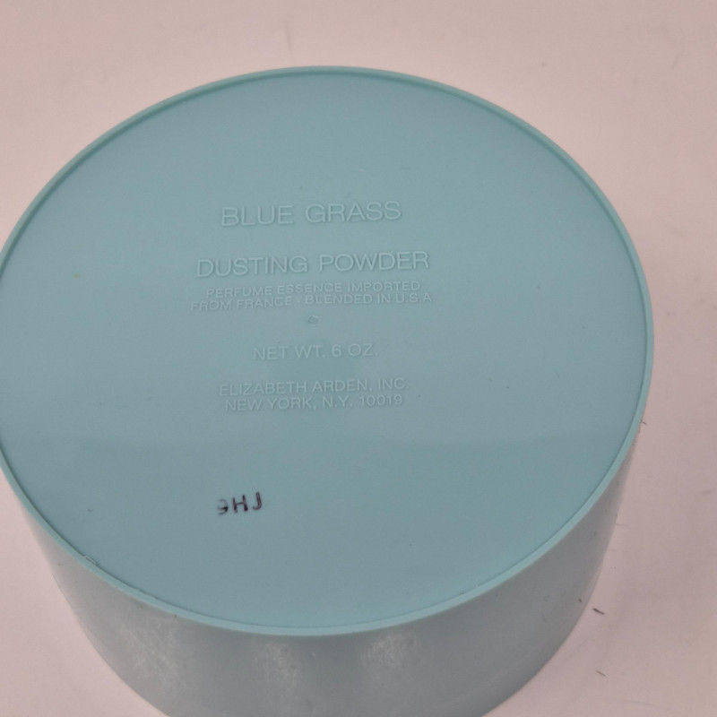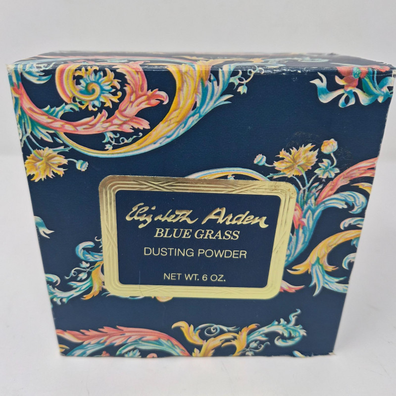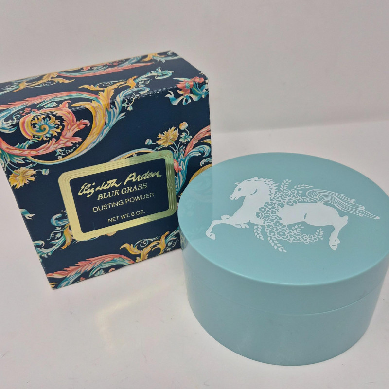 Elizabeth Arden, Blue Grass dusting powder comes in a soft light blue plastic box with its original cardboard packaging—a charming collectible from a bygone era.