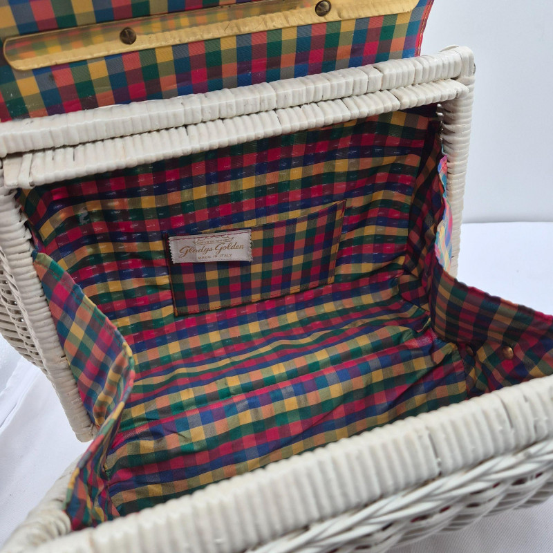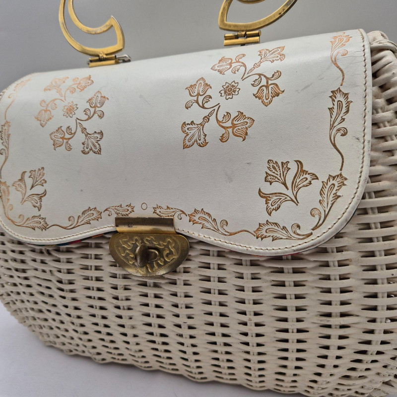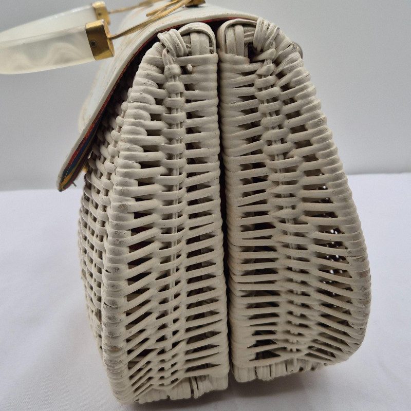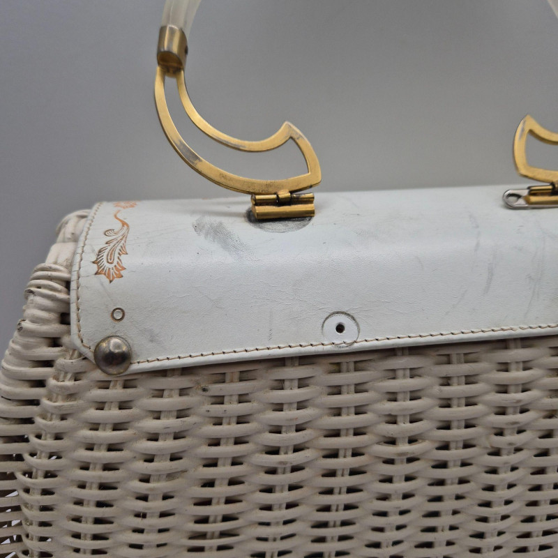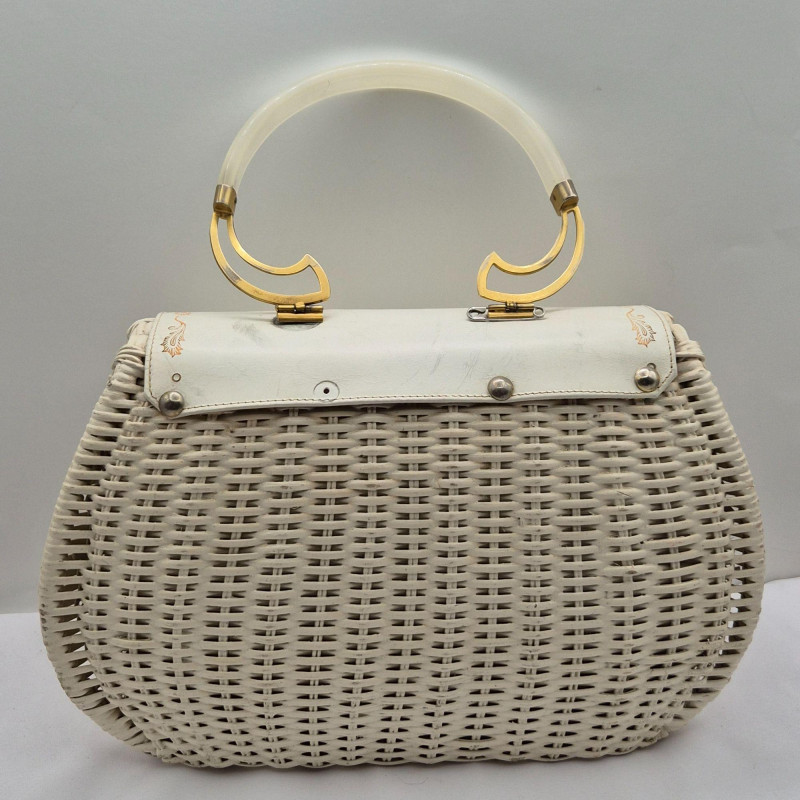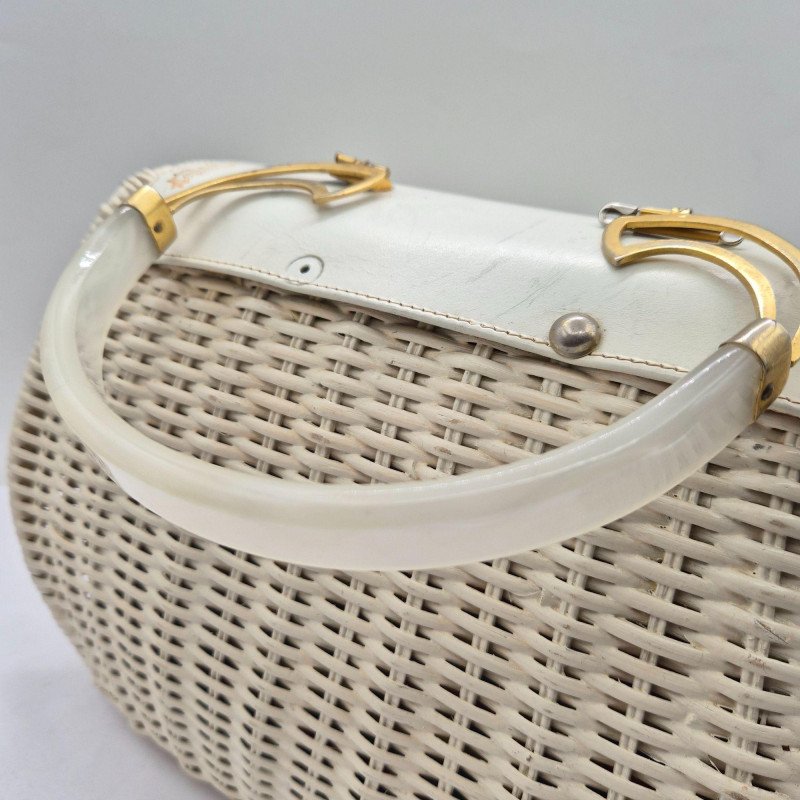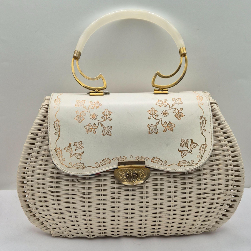 A fabulous mid-century statement piece with timeless charm. This vintage Gladys Golden wicker purse features a sculptural silhouette and a cream color Lucite handle and gold tone metal, embodying the playful elegance of 1960s fashion. Measuring approximately 14" x 9" x 5", it offers a surprisingly roomy interior—perfect for both display and use. Made in Italy. Please note: one side of the Lucite handle is secured with a safety pin, and a tack on the back is missing. These minor repairs do not detract from the overall appeal or functionality of the purse. The woven wicker body remains beautifully intact, and the purse retains its eye-catching shape and golden glow. A standout piece for collectors of Lucite handbags, retro fashion lovers, or anyone seeking a nostalgic accessory with personality.