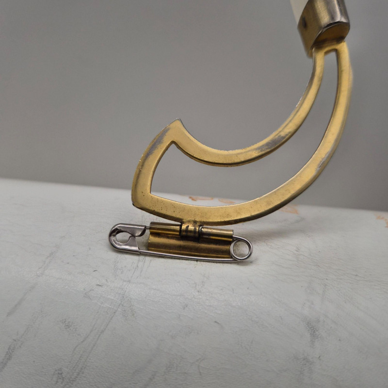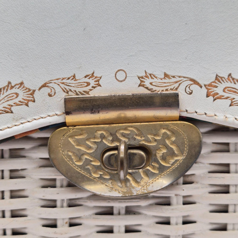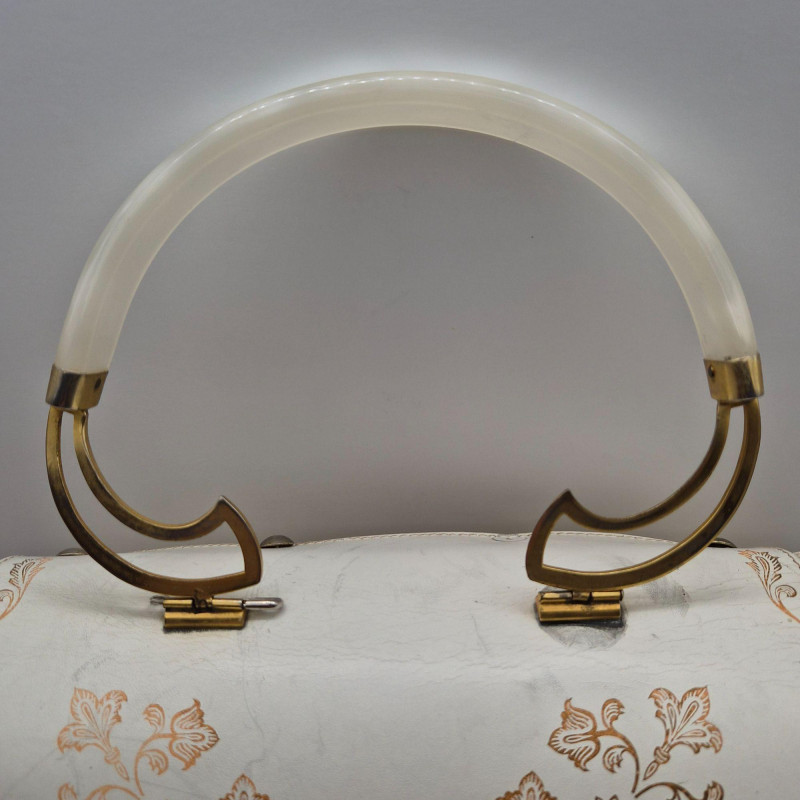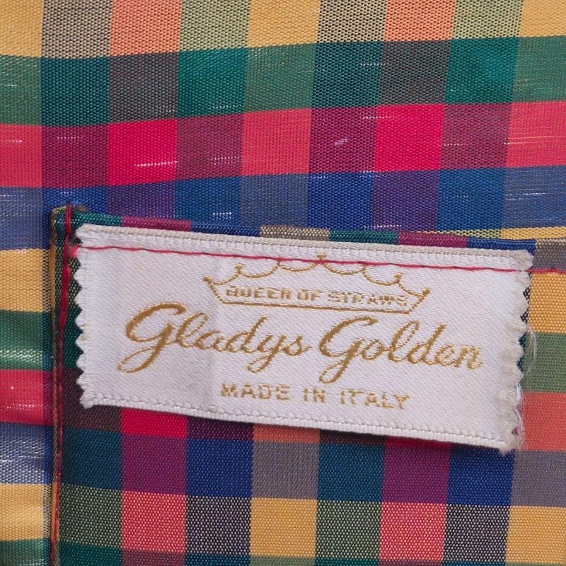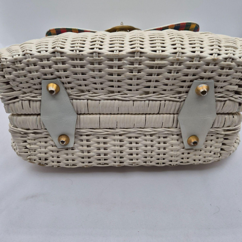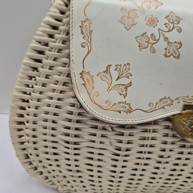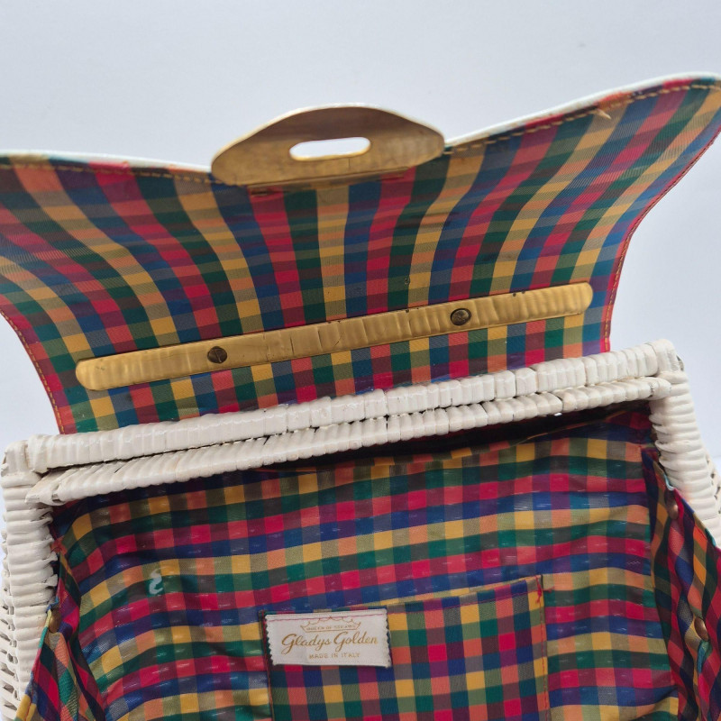 A fabulous mid-century statement piece with timeless charm. This vintage Gladys Golden wicker purse features a sculptural silhouette and a cream color Lucite handle and gold tone metal, embodying the playful elegance of 1960s fashion. Measuring approximately 14" x 9" x 5", it offers a surprisingly roomy interior—perfect for both display and use. Made in Italy. Please note: one side of the Lucite handle is secured with a safety pin, and a tack on the back is missing. These minor repairs do not detract from the overall appeal or functionality of the purse. The woven wicker body remains beautifully intact, and the purse retains its eye-catching shape and golden glow. A standout piece for collectors of Lucite handbags, retro fashion lovers, or anyone seeking a nostalgic accessory with personality.