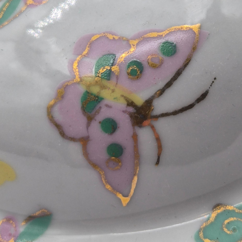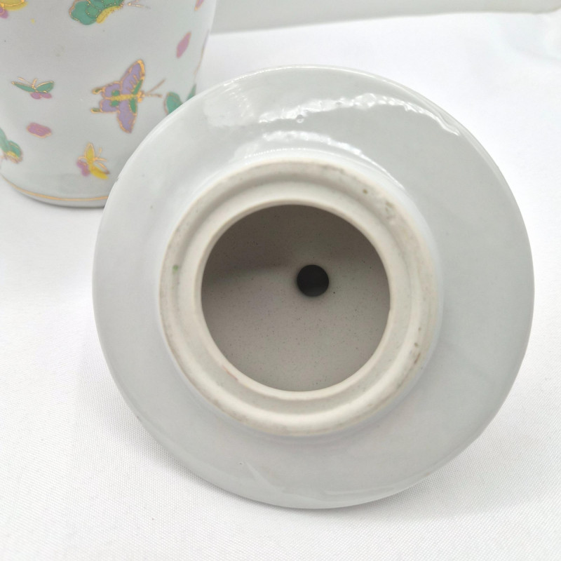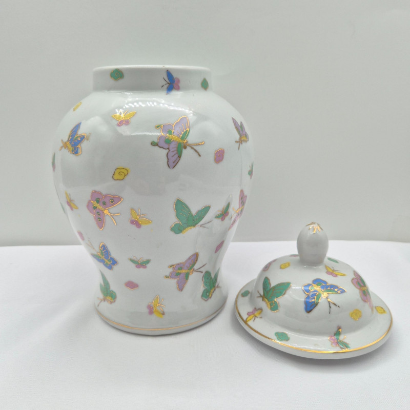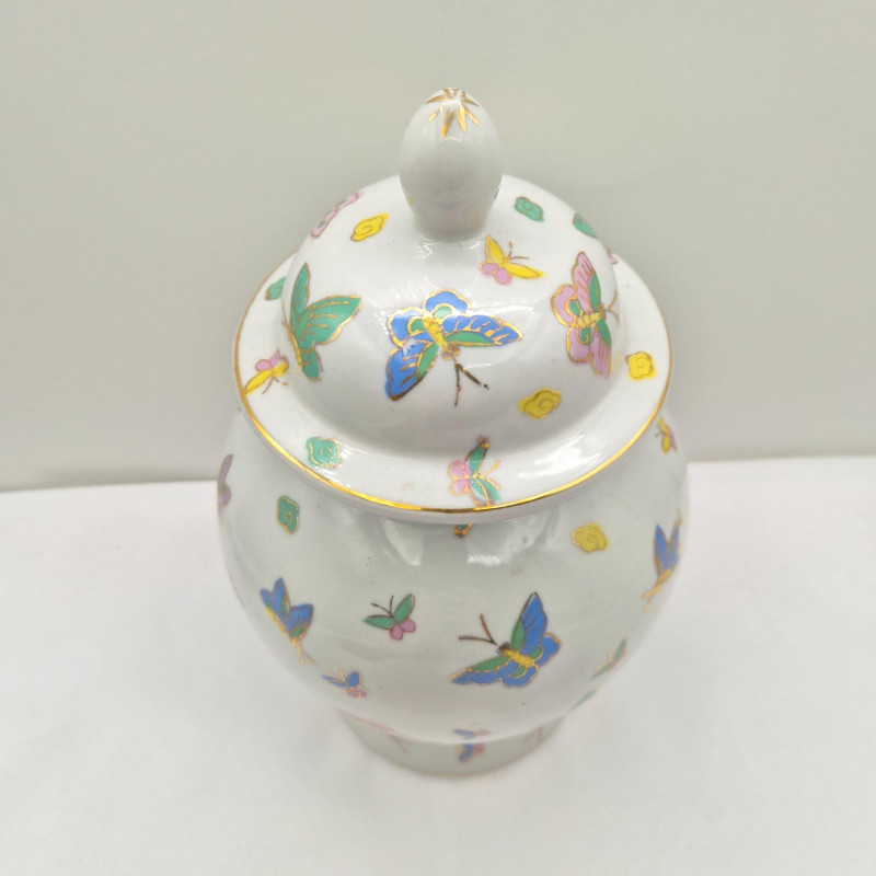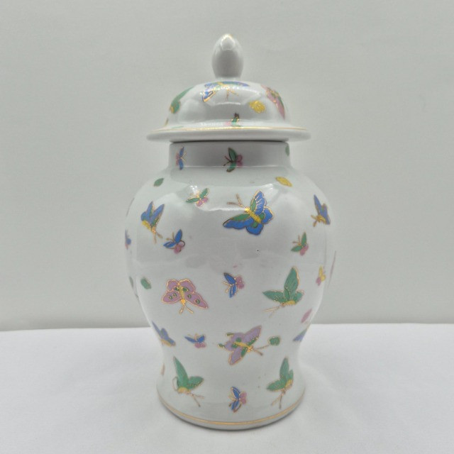 A graceful Chinese ceramic ginger jar featuring a bell-shaped silhouette and delicate hand-painted butterfly motif. Measuring 11" tall and 5.5" at its widest, this lidded jar is finished in a soft white glaze with pastel butterflies fluttering across its surface. Gold trim accents the lid, adding a refined touch.