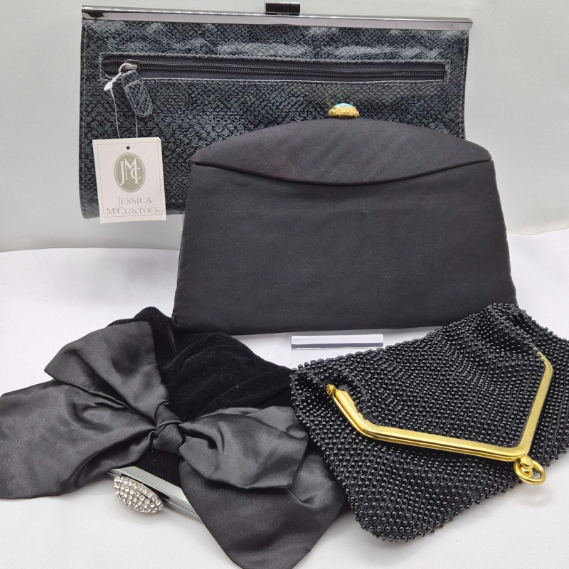 collection of black handbags perfect for formal events, vintage fashion lovers, or collectors of designer evening accessories. This lot includes: An assortment of styles and sizes, this lot offers glamour, nostalgia, and versatility.