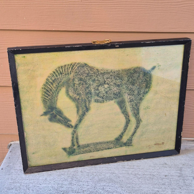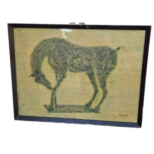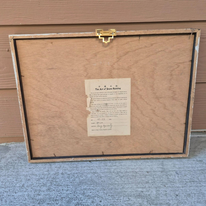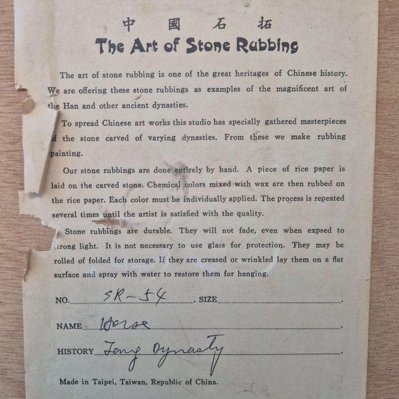 This traditional Chinese stone rubbing features a stylized horse in the Tang Dynasty aesthetic, a period renowned for its reverence of horses as symbols of power, nobility, and vitality. The rubbing technique—used for over 1,500 years—involves pressing paper onto carved stone and inking the raised surfaces to replicate the original relief. This piece offers cultural depth and historical resonance, ideal for collectors of Chinese art, educators, or anyone drawn to the legacy of ancient craftsmanship. Age of the rubbing is unknown, but the technique and subject matter reflect enduring artistic traditions.