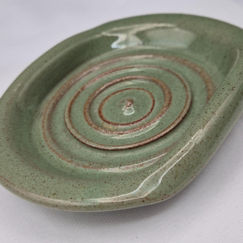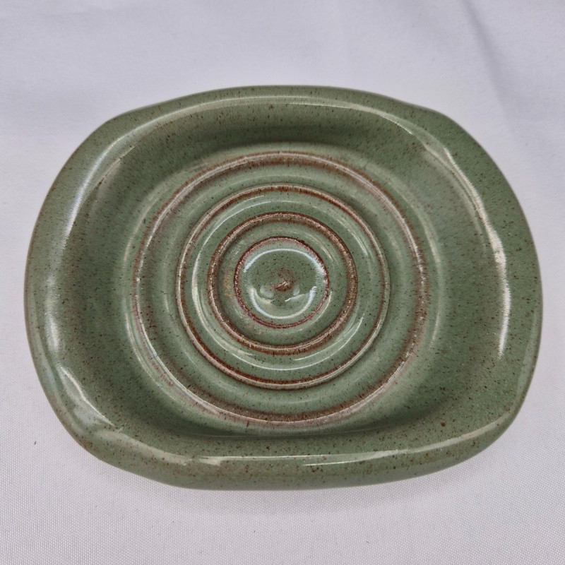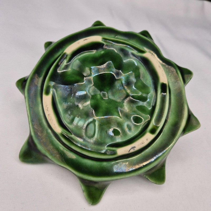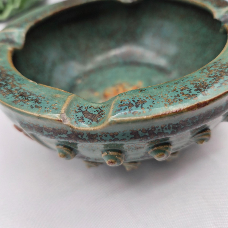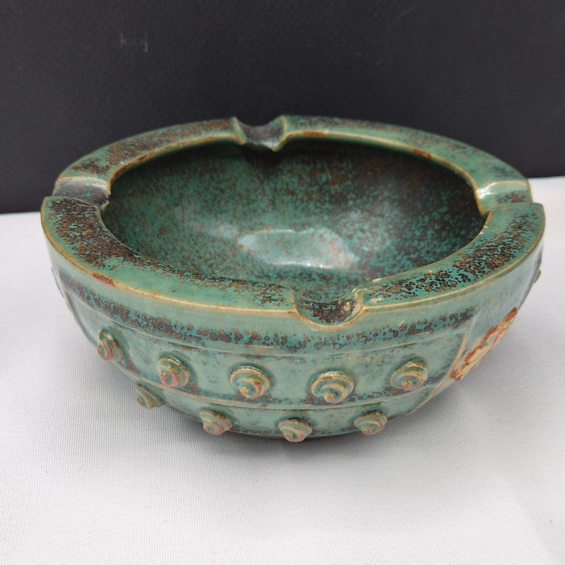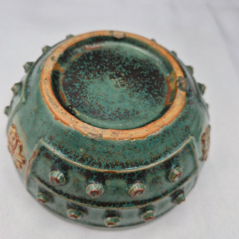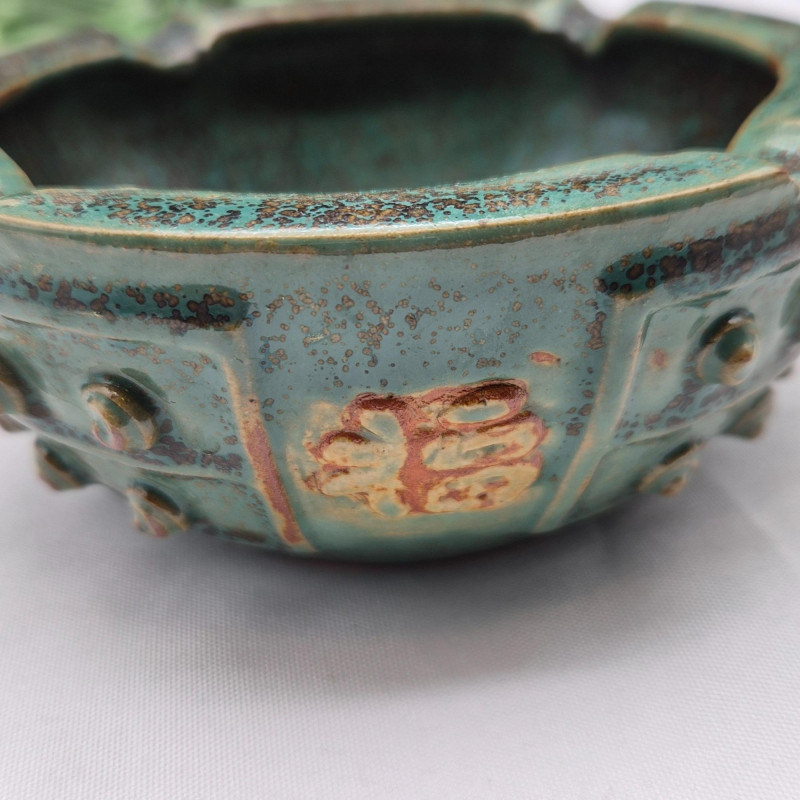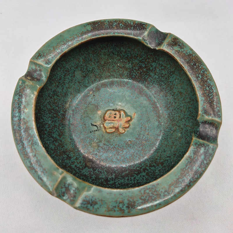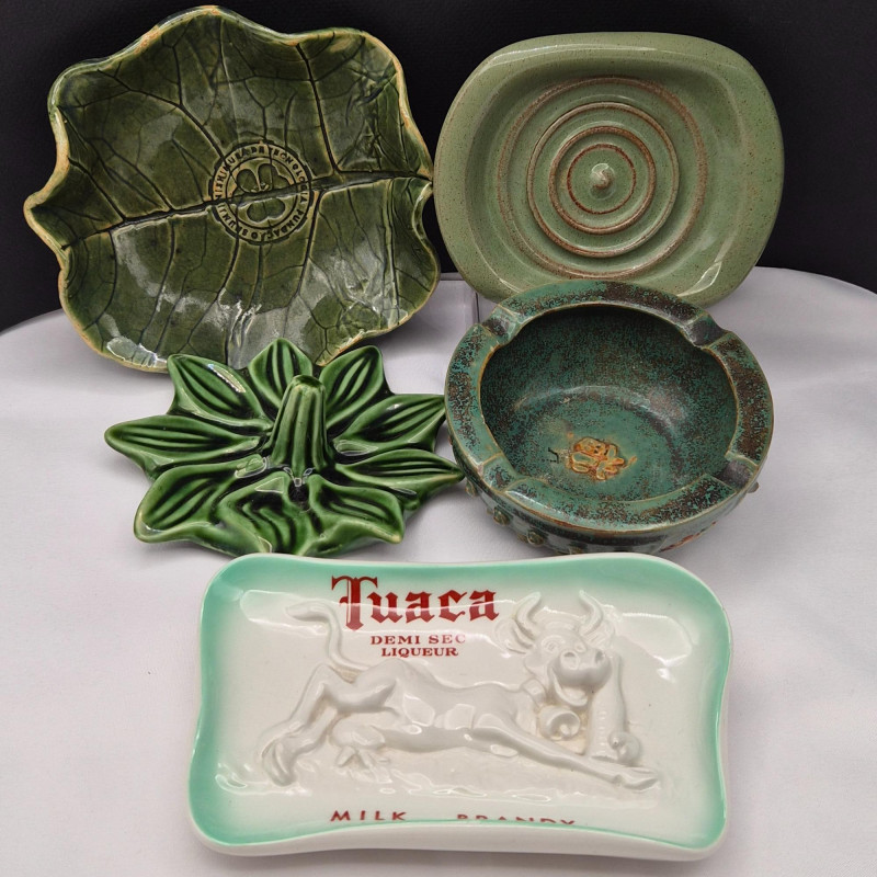 Assortment of green-toned pottery pieces, blending vintage advertising, collectible Americana, and decorative accents: