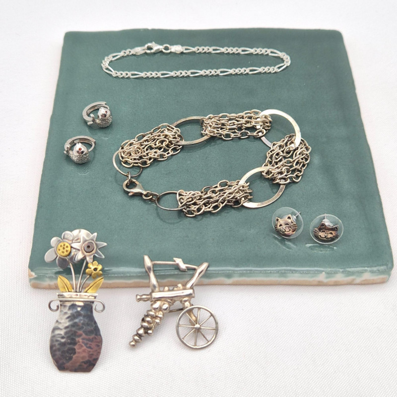 A delightful assortment of sterling silver jewelry, blending playful motifs with artisan craftsmanship:
