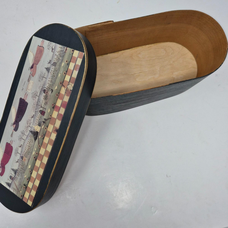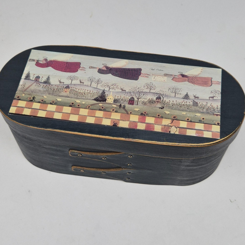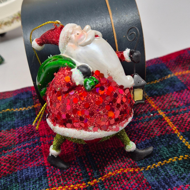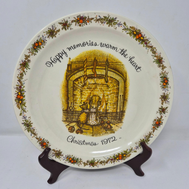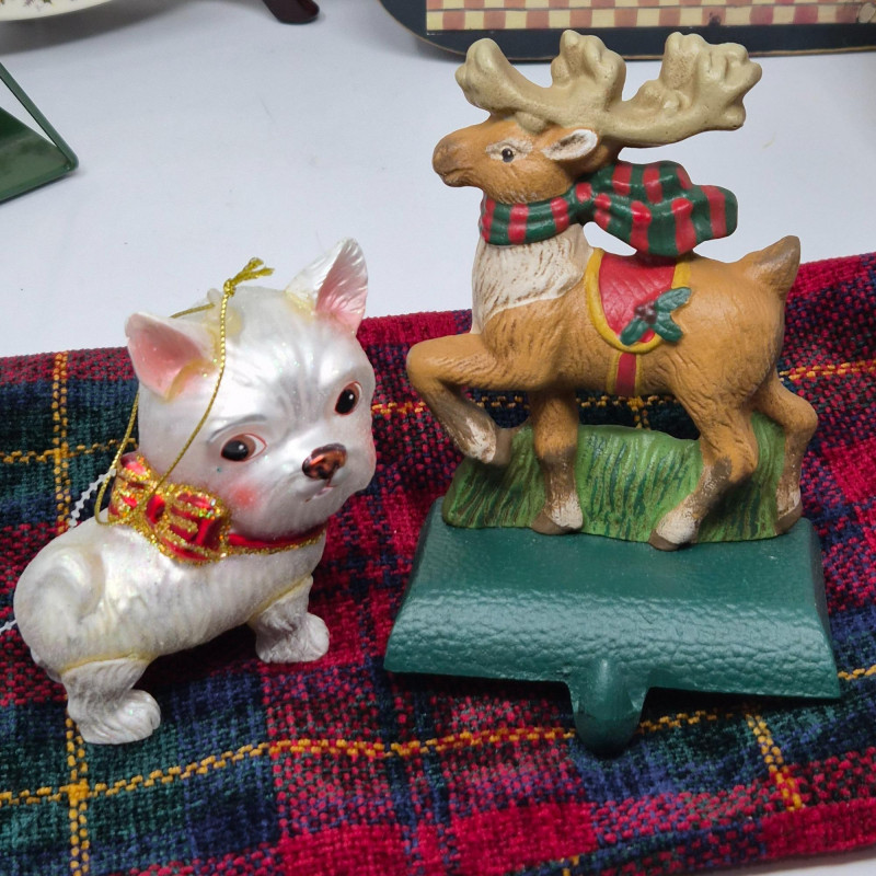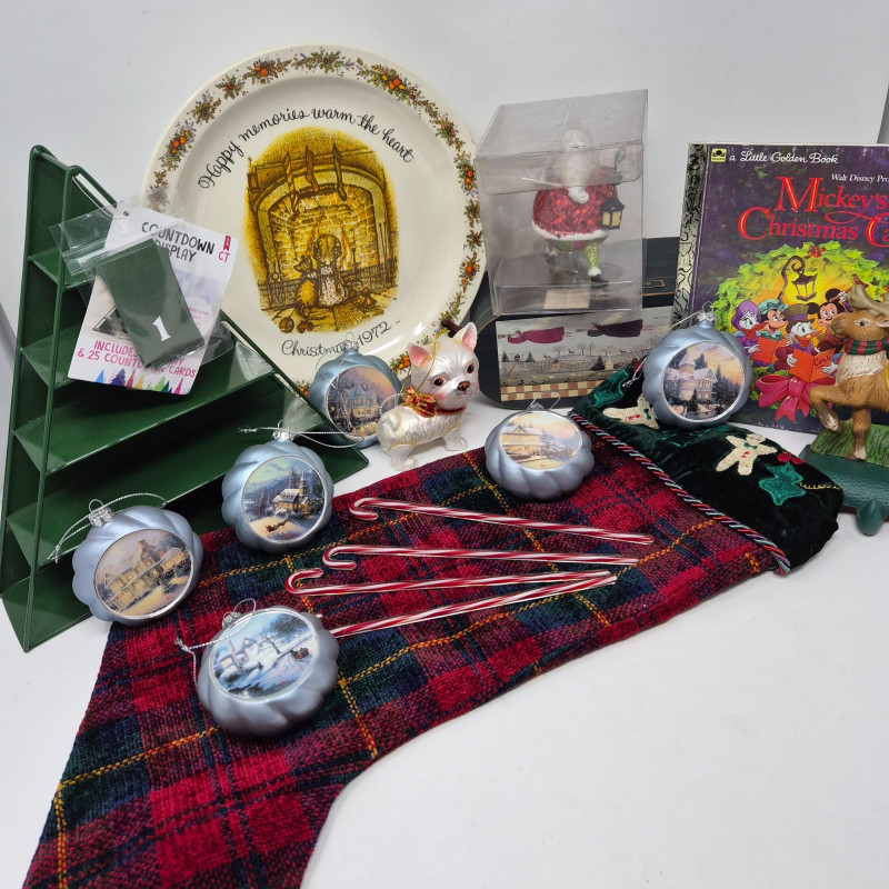 A heartwarming holiday medley steeped in vintage charm and festive spirit. Highlights include: 1972 Holly Hobbie Christmas collector’s plate - “Happy Memories Warm the Heart”—a porcelain keepsake from American Greetings that evokes cozy fireside scenes and childhood wonder. Plush red plaid stocking, metal reindeer stocking hanger hook, and a tree-shaped 12-Days of Christmas display shelf perfect for showcasing tiny treasures or ornaments. Decorative oblong lidded wood box adds rustic warmth, while glass candy canes and assorted ornaments bring sparkle and tradition. Rounding out the lot is a nostalgic copy of Mickey’s Christmas Carol, a beloved retelling of Dickens through Disney’s lens.