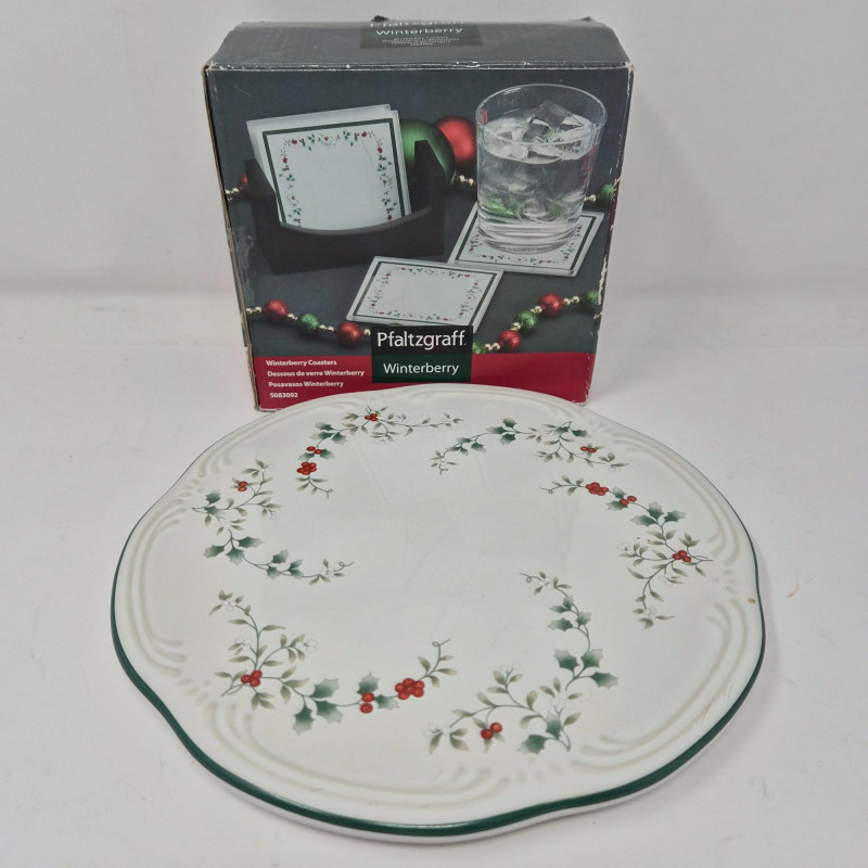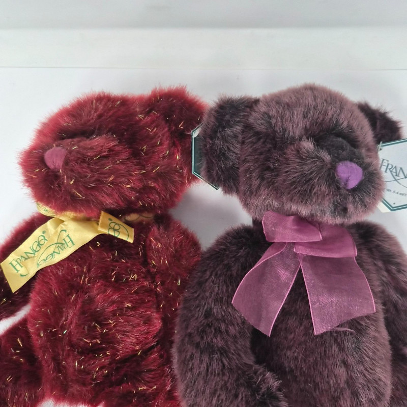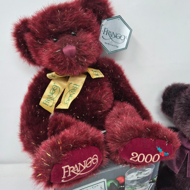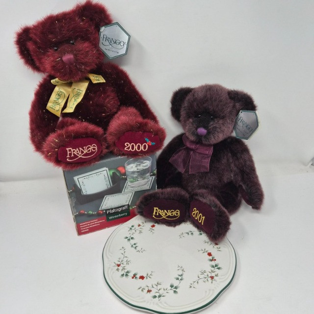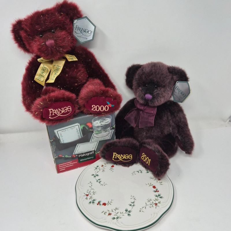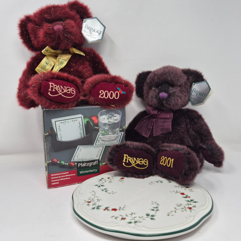A festive trio of holiday charm and collectible appeal. This lot features two iconic Frango plush bears - Holly (2000) and Hazel (2001) - each measuring 13" long and dressed in seasonal style, beloved by collectors for their nostalgic department store roots. Pfaltzgraff Winterberry pattern porcelain trivet, 8.75" diameter, adorned with classic holly motifs and ideal for holiday serving or display. Completing the set: a sleek set of 4 glass coasters with Winterberry pattern, each 4" wide, housed in a black storage stand for modern contrast. A delightful blend of cozy tradition and polished presentation.