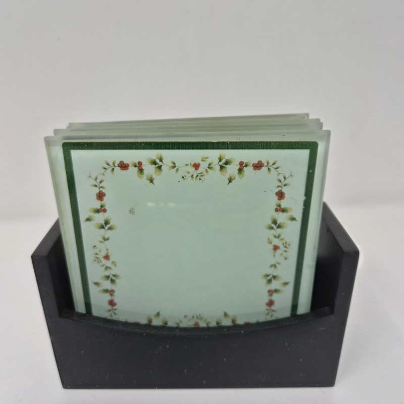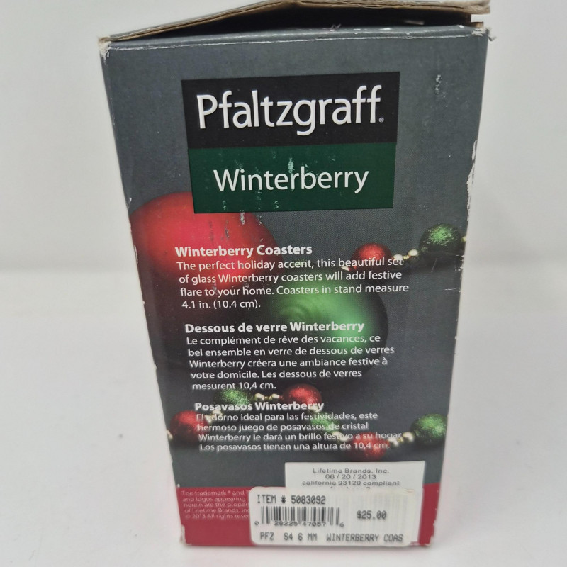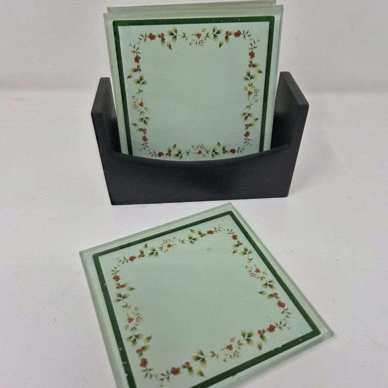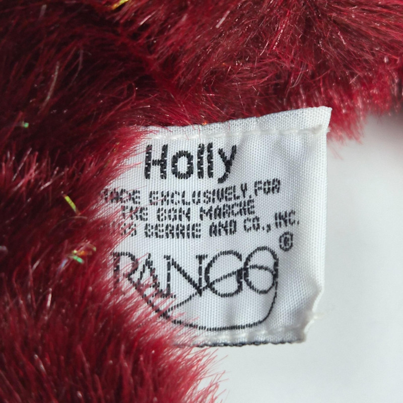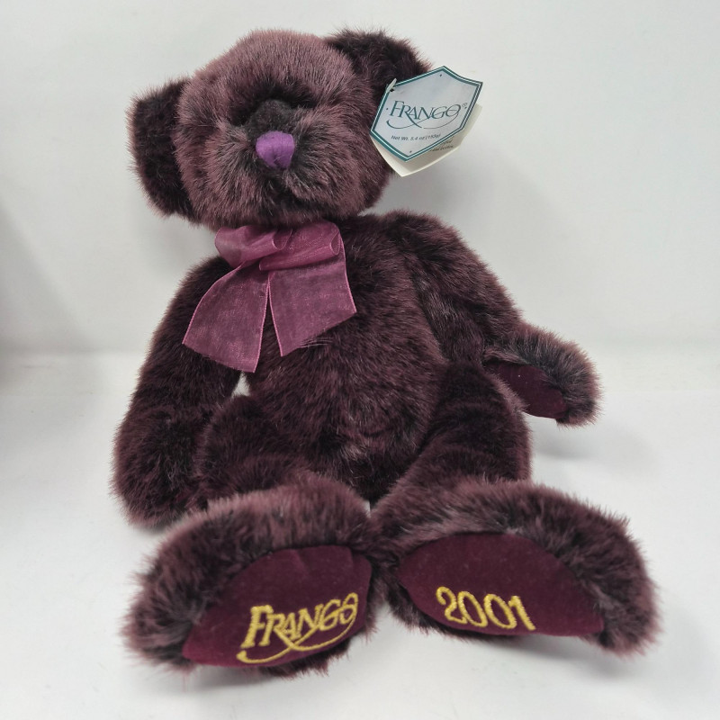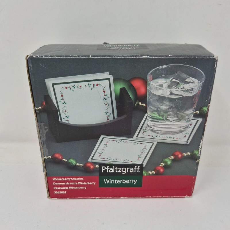 A festive trio of holiday charm and collectible appeal. This lot features two iconic Frango plush bears - Holly (2000) and Hazel (2001) - each measuring 13" long and dressed in seasonal style, beloved by collectors for their nostalgic department store roots. Pfaltzgraff Winterberry pattern porcelain trivet, 8.75" diameter, adorned with classic holly motifs and ideal for holiday serving or display. Completing the set: a sleek set of 4 glass coasters with Winterberry pattern, each 4" wide, housed in a black storage stand for modern contrast. A delightful blend of cozy tradition and polished presentation.